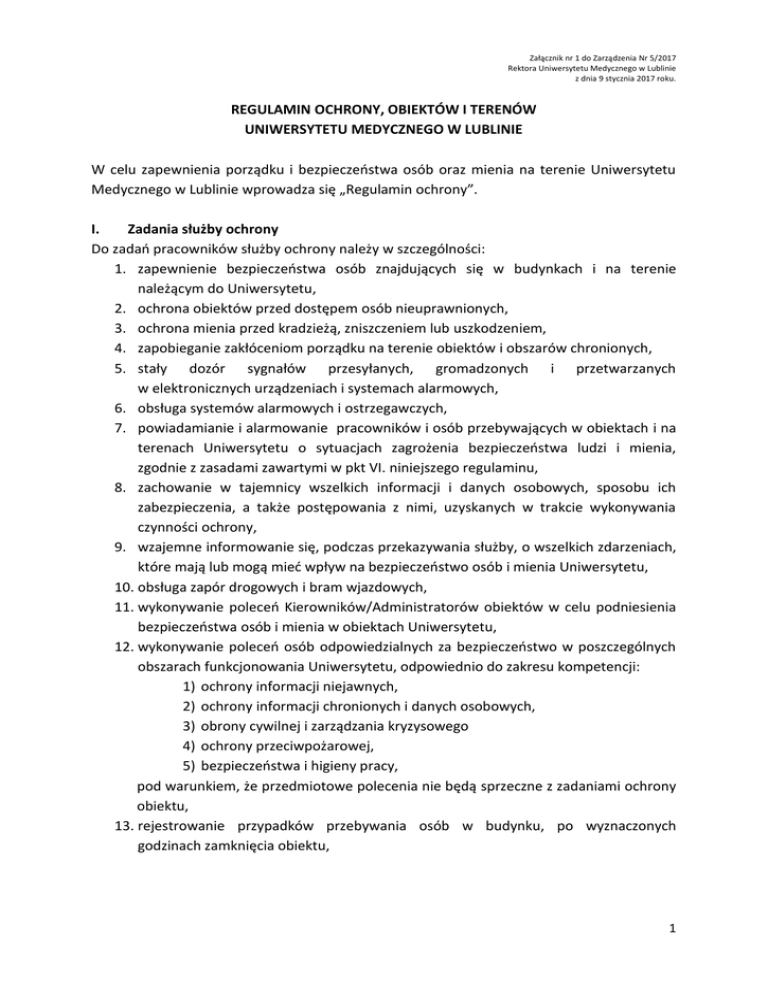 Załącznik nr 1 do Zarządzenia Nr 5/2017 Rektora Uniwersytetu Medycznego w Lublinie z dnia 9 stycznia 2017 roku. REGULAMIN OCHRONY, OBIEKTÓW I TERENÓW UNIWERSYTETU MEDYCZNEGO W LUBLINIE W celu zapewnienia porządku i bezpieczeostwa osób oraz mienia na terenie Uniwersytetu Medycznego w Lublinie wprowadza się „Regulamin ochrony”. I. Zadania służby ochrony Do zadao pracowników służby ochrony należy w szczególności: 1. zapewnienie bezpieczeostwa osób znajdujących się w budynkach i na terenie należącym do Uniwersytetu, 2. ochrona obiektów przed dostępem osób nieuprawnionych, 3. ochrona mienia przed kradzieżą, zniszczeniem lub uszkodzeniem, 4. zapobieganie zakłóceniom porządku na terenie obiektów i obszarów chronionych, 5. stały dozór sygnałów przesyłanych, gromadzonych i przetwarzanych w elektronicznych urządzeniach i systemach alarmowych, 6. obsługa systemów alarmowych i ostrzegawczych, 7. powiadamianie i alarmowanie pracowników i osób przebywających w obiektach i na terenach Uniwersytetu o sytuacjach zagrożenia bezpieczeostwa ludzi i mienia, zgodnie z zasadami zawartymi w pkt VI. niniejszego regulaminu, 8. zachowanie w tajemnicy wszelkich informacji i danych osobowych, sposobu ich zabezpieczenia, a także postępowania z nimi, uzyskanych w trakcie wykonywania czynności ochrony, 9. wzajemne informowanie się, podczas przekazywania służby, o wszelkich zdarzeniach, które mają lub mogą mied wpływ na bezpieczeostwo osób i mienia Uniwersytetu, 10. obsługa zapór drogowych i bram wjazdowych, 11. wykonywanie poleceo Kierowników/Administratorów obiektów w celu podniesienia bezpieczeostwa osób i mienia w obiektach Uniwersytetu, 12. wykonywanie poleceo osób odpowiedzialnych za bezpieczeostwo w poszczególnych obszarach funkcjonowania Uniwersytetu, odpowiednio do zakresu kompetencji: 1) ochrony informacji niejawnych, 2) ochrony informacji chronionych i danych osobowych, 3) obrony cywilnej i zarządzania kryzysowego 4) ochrony przeciwpożarowej, 5) bezpieczeostwa i higieny pracy, pod warunkiem, że przedmiotowe polecenia nie będą sprzeczne z zadaniami ochrony obiektu, 13. rejestrowanie przypadków przebywania osób w budynku, po wyznaczonych godzinach zamknięcia obiektu, 1 Załącznik nr 1 do Zarządzenia Nr 5/2017 Rektora Uniwersytetu Medycznego w Lublinie z dnia 9 stycznia 2017 roku. 14. zabrania się przyjmowania listów, przesyłek oraz innych przedmiotów przez pracowników ochrony, za wyjątkiem sytuacji wyraźnego umocowania do przyjęcia. II. Służba ochrony podczas wykonywania czynności ma prawo do: 1. ustalania uprawnieo do przebywania na terenach lub w obiektach Uniwersytetu oraz legitymowania osób, w celu ustalenia ich tożsamości, 2. wylegitymowania osoby żądającej wydania klucza, w celu potwierdzenia uprawnienia do jego otrzymania. W przypadku odmowy okazania dowodu tożsamości pracownik służby ochrony ma prawo nie wydad kluczy i jest zobowiązany do niezwłocznego powiadomienia o zaistniałej sytuacji kierownika jednostki organizacyjnej znajdującej się na terenie obiektu, do której klucz miał byd wydany oraz Kierownika/Administratora obiektu, 3. udzielania pouczeo w zakresie bezpieczeostwa osobom znajdującym na terenach i w obiektach Uniwersytetu, 4. wezwania osób do opuszczenia terenu lub obiektu Uniwersytetu w przypadku stwierdzenia braku uprawnieo albo stwierdzenia zakłócania porządku publicznego przez te osoby, 5. ujęcia osób stwarzających w sposób oczywisty bezpośrednie zagrożenie dla życia lub zdrowia ludzkiego, a także dla chronionego mienia i innych zasobów podlegających ochronie, w celu niezwłocznego oddania tych osób Policji, 6. wezwania grupy interwencyjnej lub Policji: 1) w przypadku incydentów związanych z naruszeniem porządku publicznego lub zagrażających bezpieczeostwu osób i mienia na terenach i obiektach Uniwersytetu, 2) w przypadku zauważenia zdarzenia mającego charakter przestępstwa na terenie bezpośrednio przyległym do terenów i obiektów Uniwersytetu, 7. zwracania się w sytuacjach alarmowych (np. ewakuacji) do każdej osoby o udzielenie doraźnej pomocy w wykonywaniu czynności z tym związanych. III. Zasady współpracy Uniwersytetu z firmami ochrony. 1. Zasady współpracy Uniwersytetu z firmami ochrony regulują umowy na świadczenie usług ochrony osób i mienia. 2. Firma ochrony jest zobowiązana do zapoznania swoich pracowników z obowiązującymi instrukcjami bezpieczeostwa funkcjonującymi w obiektach Uniwersytetu. 3. Firma ochrony ma obowiązek informowania na piśmie Kierowników/Administratorów obiektów o planowanych zmianach personalnych służby ochrony. 2 Załącznik nr 1 do Zarządzenia Nr 5/2017 Rektora Uniwersytetu Medycznego w Lublinie z dnia 9 stycznia 2017 roku. IV. Realizacja zadao ochrony przez Kierowników/Administratorów Obiektów Do zadao Kierowników obiektów należy w szczególności: 1. wykonywanie czynności związanych z ochroną administrowanych terenów i obiektów Uniwersytetu, 2. prowadzenie bieżących kontroli dokumentacji prowadzonej przez pracowników służby ochrony, 3. rejestrowanie i dokumentowanie w formie notatek służbowych wszelkich incydentów związanych z naruszeniem porządku i bezpieczeostwa w administrowanych obiektach, 4. wykonywanie obchodów terenów i budynków w celu monitorowania poziomu bezpieczeostwem osób i powierzonego mienia, 5. składanie wniosków w sprawach dotyczących ochrony i bezpieczeostwa do właściwych Kierowników Działów, 6. inicjowanie działao zmierzających do podniesienia poziomu bezpieczeostwa i porządku w administrowanych obiektach, 7. uczestniczenie w opracowaniu i/lub opiniowaniu projektów inwestycyjnych w administrowanych obiektach w zakresie ochrony i zapewnienia bezpieczeostwa, 8. w przypadkach wystąpienia zagrożenia dla życia lub zdrowia osób przebywających na terenach i w obiektach Uniwersytetu mają obowiązek: 1) wezwad policję i służby ratownicze, a także