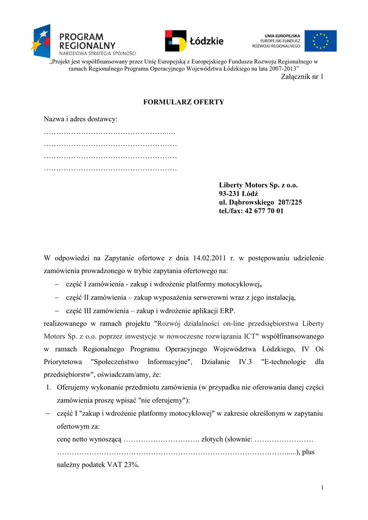 „Projekt jest współfinansowany przez Unię Europejską z Europejskiego Funduszu Rozwoju Regionalnego w ramach Regionalnego Programu Operacyjnego Województwa Łódzkiego na lata 2007-2013” Załącznik nr 1 FORMULARZ OFERTY Nazwa i adres dostawcy: …………………………………………..…. ……………………………………………… ……………………………………………… ……………………………………………… Liberty Motors Sp. z o.o. 93-231 Łódź ul. Dąbrowskiego 207/225 tel./fax: 42 677 70 01 W odpowiedzi na Zapytanie ofertowe z dnia 14.02.2011 r. w postępowaniu udzielenie zamówienia prowadzonego w trybie zapytania ofertowego na: część I zamówienia - zakup i wdrożenie platformy motocyklowej, część II zamówienia – zakup wyposażenia serwerowni wraz z jego instalacją, część III zamówienia – zakup i wdrożenie aplikacji ERP. realizowanego w ramach projektu "Rozwój działalności on-line przedsiębiorstwa Liberty Motors Sp. z o.o. poprzez inwestycje w nowoczesne rozwiązania ICT" współfinansowanego w ramach Regionalnego Programu Operacyjnego Województwa Łódzkiego, IV Oś Priorytetowa "Społeczeństwo Informacyjne", Działanie IV.3 "E-technologie dla przedsiębiorstw", oświadczam/amy, że: 1. Oferujemy wykonanie przedmiotu zamówienia (w przypadku nie oferowania danej części zamówienia proszę wpisać "nie oferujemy"): część I "zakup i wdrożenie platformy motocyklowej" w zakresie określonym w zapytaniu ofertowym za: cenę netto wynoszącą …………………………. złotych (słownie: …………………… ………………………………………………………………………………….....), plus należny podatek VAT 23%. 1 „Projekt jest współfinansowany przez Unię Europejską z Europejskiego Funduszu Rozwoju Regionalnego w ramach Regionalnego Programu Operacyjnego Województwa Łódzkiego na lata 2007-2013” część II "zakup wyposażenia serwerowni wraz z jego instalacją" w zakresie określonym w zapytaniu ofertowym za: cenę netto wynoszącą ……………………….. złotych (słownie: …………………… ………………………………………………………………………………….....), plus należny podatek VAT 23%. część III "zakup i wdrożenie systemu ERP" w zakresie określonym w zapytaniu ofertowym za: cenę netto wynoszącą …………………… złotych (słownie: …………………………… ……………………………złotych), plus należny podatek VAT 23%. 2. Powyższy ceny netto powiększone o wartość należnego podatku VAT zawierają wszystkie koszty, jakie ponosi Zamawiający w przypadku wyboru naszej oferty. 3. Oświadczam/amy, że zapoznałem/liśmy się z zapytaniem ofertowym Zamawiającego i uznaję/emy się za związanych określonymi zasadami postępowania. 4. Spełniam/amy warunki udziału w postępowaniu, tj.: posiadam/amy niezbędną wiedzę i doświadczenie oraz dysponujemy potencjałem technicznym i osobami zdolnymi do wykonania zamówienia, znajduję/emy się w sytuacji ekonomicznej i finansowej zapewniającej wykonanie zamówienia. ……………..…………………………. Miejscowość, data …………………………………………. podpis i pieczątka dostawcy 2