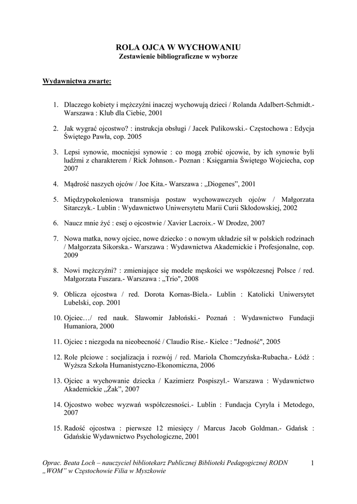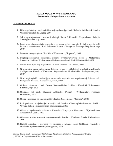 ROLA OJCA W WYCHOWANIU Zestawienie bibliograficzne w wyborze Wydawnictwa zwarte: 1. Dlaczego kobiety i mężczyźni inaczej wychowują dzieci / Rolanda Adalbert-Schmidt.Warszawa : Klub dla Ciebie, 2001 2. Jak wygrać ojcostwo? : instrukcja obsługi / Jacek Pulikowski.- Częstochowa : Edycja Świętego Pawła, cop. 2005 3. Lepsi synowie, mocniejsi synowie : co mogą zrobić ojcowie, by ich synowie byli ludźmi z charakterem / Rick Johnson.- Poznan : Księgarnia Świętego Wojciecha, cop 2007 4. Mądrość naszych ojców / Joe Kita.- Warszawa : „Diogenes”, 2001 5. Międzypokoleniowa transmisja postaw wychowawczych ojców / Małgorzata Sitarczyk.- Lublin : Wydawnictwo Uniwersytetu Marii Curii Skłodowskiej, 2002 6. Naucz mnie żyć : esej o ojcostwie / Xavier Lacroix.- W Drodze, 2007 7. Nowa matka, nowy ojciec, nowe dziecko : o nowym układzie sił w polskich rodzinach / Małgorzata Sikorska.- Warszawa : Wydawnictwa Akademickie i Profesjonalne, cop. 2009 8. Nowi mężczyźni? : zmieniające się modele męskości we współczesnej Polsce / red. Małgorzata Fuszara.- Warszawa : „Trio", 2008 9. Oblicza ojcostwa / red. Dorota Kornas-Biela.- Lublin : Katolicki Uniwersytet Lubelski, cop. 2001 10. Ojciec…/ red nauk. Sławomir Jabłoński.- Poznań : Wydawnictwo Fundacji Humaniora, 2000 11. Ojciec : niezgoda na nieobecność / Claudio Rise.- Kielce : "Jedność", 2005 12. Role płciowe : socjalizacja i rozwój / red. Mariola Chomczyńska-Rubacha.- Łódź : Wyższa Szkoła Humanistyczno-Ekonomiczna, 2006 13. Ojciec a wychowanie dziecka / Kazimierz Pospiszyl.- Warszawa : Wydawnictwo Akademickie „Żak”, 2007 14. Ojcostwo wobec wyzwań współczesności.- Lublin : Fundacja Cyryla i Metodego, 2007 15. Radość ojcostwa : pierwsze 12 miesięcy / Marcus Jacob Goldman.- Gdańsk : Gdańskie Wydawnictwo Psychologiczne, 2001 Oprac. Beata Loch – nauczyciel bibliotekarz Publicznej Biblioteki Pedagogicznej RODN „WOM” w Częstochowie Filia w Myszkowie 1 16. Realizacja funkcji opiekuńczo-wychowawczej w rodzinie samotnego ojca / Dorota Ruszkiewicz.- Toruń : Centrum Edukacji Europejskiej, 2006 17. Samotne ojcostwo / Anna Dudak.- Kraków : Oficyna Wydawnicza „Impuls”, 2006 18. Serce taty / Osvaldo Poli.- Kraków : Wydawnictwo WAM, 2008 19. Serce ojca : jak być dobrym ojcem / Ken Cenfield.- Warszawa : Instytut Wydawniczy PAX, cop. 2007 20. Synowie i ojcowie : tęsknota za nieobecnym ojcem / Lothar Schon.- Gdańsk : Gdańskie Wydawnictwo Psychologiczne, 2003 21. Sztuka ojcostwa / Claudio Rice.- Poznań : W Drodze, 2006 22. Tata na zawsze : poradnik dla ojców po rozstaniu / Maciej Tański.- Warszawa : Fundacja „Partners Polska”, cop. 2006 23. Tobie, tato / Częstochowa : Edycja Świętego Pawła, cop. 2007 24. Warto być ojcem : najważniejsza kariera mężczyzny / Jacek Pulikowski.- Wyd. 3 popr.- Poznań : Inicjatywa Wydawnicza Jerozolima, 2002 25. Wiadomość od taty : terapeutyczne opowiadania o utracie i rozstaniach / Erika MeyerGlitza.- Kielce : Jedność, 2002 26. Zagubione ojcostwo / Paul Josef Cordes.- Pelplin : Bernardinum, 2005 Wydawnictwa ciągłe: 1. Co po Ojcu? : od zakazu do negocjacji w relacjach edukacyjnych / Hanna Stępniewska-Gębik // Nowa Szkoła.- 2010, nr 2, s. 46 – 50 2. Dorastanie do macierzyństwa i ojcostwa / Elżbieta Wójcik // Wychowawca.- 2010, nr 3, s. 12–13 3. Fenomen ojcostwa / Marta Borowiec // Opieka – Wychowanie – Terapia.- 2009, nr 3/4, s. 22–25 4. Gdy Jaś ma tylko tatę / Julita Wojciechowska // Psychologia w Szkole.- 2006, nr 4, s. 89–94 5. Ikona współczesnego ojcostwa / Ewa Kozak // Edukacja i Dialog.- 2006, nr 9, s. 23–28 6. Jesteś dla mnie ważny / Barbara Lipiec, Wiesław Lipiec // Edukacja i Dialog.- 2005, nr 6, s. 7 – 13 7. Modele ojcostwa we współczesnych rodzinach miejskich / Tomasz Sosnowski // Edukacja.- 2009, nr 3, s. 62–67 Oprac. Beata Loch – nauczyciel bibliotekarz Publicznej Biblioteki Pedagogicznej RODN „WOM” w Częstochowie Filia w Myszkowie 2 8. Ojcostwo / Marta Borowiec // Problemy Opiekuńczo-Wychowawcze.- 2010, nr 2, s. 47–50 9. Ojcostwo – los czy wybór? / Wanda Półtawska // Wychowawca.- 2000, nr 5, s. 6–9 10. Ojciec a problem jakości wychowawczego systemu rodzinnego / Irena Stańczak // Nauczanie Początkowe.- 2009/2010, nr 2, s. 15–23 11. Ojciec pilnie potrzebny…/ Monika Urbańska-Bulas // Bliżej Przedszkola.- 2010, nr 5, s. 50–53 12. Ojcostwo w życiu mężczyzny / Kazimierz Pospiszyl // Małżeństwo i Rodzina.- 2004, nr 2, s. 24- 28 13. Postawa ojca a wyniki szkolne dziecka / Magdalena Nakielska // Wychowawca.2010, nr 9, s. 10–11 14. Postawy wychowawcze rodziców wobec córek i synów / Marzena Sendyk // Problemy Opiekuńczo-Wychowawcze.– 2009, nr 6, s. 45–49 15. Poziom samoakceptacji ojców i matek w pełnieniu przez nich ról rodzicielskich po rozwodzie / Anna Dudak // Małżeństwo i Rodzina.- 2005, nr 1/2, s. 73–76 16. Psychologiczne problemy ojców dzieci z niepełnosprawnościami / Andrzej Twardowski // Szkoła Specjalna.- 2009, nr 1, s. 4–17 17. Przywrócić wartość ojcostwa / Sławomir Baran // Kwartalnik Edukacyjny.- 2006, nr 3, s. 22 – 31 18. Rola ojca w procesie wychowawczym / Irena Stańczak // Nauczanie Początkowe.2007/2008, nr 2, s. 26–33 19. Rola ojca w wychowaniu dziecka / Maria Jankowska // Wychowanie w Przedszkolu.2010, nr 6, s. 4–12 20. Różne oblicza ojcostwa / Zofia Dąbrowska // Małżeństwo i Rodzina.- 2004, nr 1, s. 13–19 21. Sytuacje wychowawcze w rodzinach samotnych ojców / Dorota Ruszkiewicz // Małżeństwo i Rodzina.- 2005, nr 3, s. 45–47 22. Tata sam w domu / Julita Wojciechowska // Charaktery.- 2006, nr 3, s. 34- 36 23. Tęsknota za ojcem / Mariola Bieńko // Problemy Opiekuńczo-Wychowawcze.- 2003, nr 10, s. 20–24 24. Wartości preferowane przez bezrobotnych ojców dorastających dzieci / Elżbieta Kornacka-Skwara // Małżeństwo i Rodzina.- 2004, nr 4, s. 27–31 25. Zaspokajanie potrzeb bytowych w rodzinach samotnych