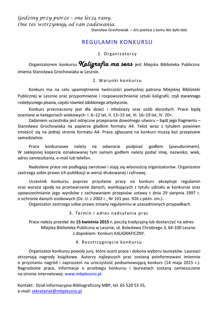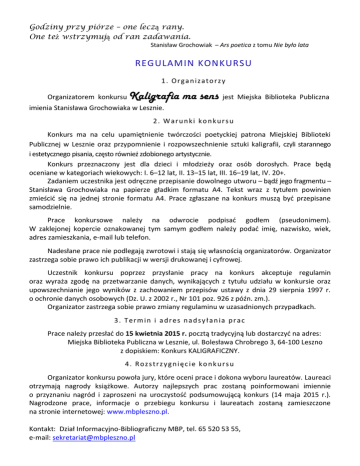 Godziny przy piórze – one leczą rany. One też wstrzymują od ran zadawania. Stanisław Grochowiak – Ars poetica z tomu Nie było lata REGULAMIN KONKURSU 1. Organizatorzy Organizatorem konkursu Kaligrafia ma sens jest Miejska Biblioteka Publiczna imienia Stanisława Grochowiaka w Lesznie. 2. Warunki konkursu Konkurs ma na celu upamiętnienie twórczości poetyckiej patrona Miejskiej Biblioteki Publicznej w Lesznie oraz przypomnienie i rozpowszechnienie sztuki kaligrafii, czyli starannego i estetycznego pisania, często również zdobionego artystycznie. Konkurs przeznaczony jest dla dzieci i młodzieży oraz osób dorosłych. Prace będą oceniane w kategoriach wiekowych: I. 6–12 lat, II. 13–15 lat, III. 16–19 lat, IV. 20+. Zadaniem uczestnika jest odręczne przepisanie dowolnego utworu – bądź jego fragmentu – Stanisława Grochowiaka na papierze gładkim formatu A4. Tekst wraz z tytułem powinien zmieścić się na jednej stronie formatu A4. Prace zgłaszane na konkurs muszą być przepisane samodzielnie. Prace konkursowe należy na odwrocie podpisać godłem (pseudonimem). W zaklejonej kopercie oznakowanej tym samym godłem należy podać imię, nazwisko, wiek, adres zamieszkania, e-mail lub telefon. Nadesłane prace nie podlegają zwrotowi i stają się własnością organizatorów. Organizator zastrzega sobie prawo ich publikacji w wersji drukowanej i cyfrowej. Uczestnik konkursu poprzez przysłanie pracy na konkurs akceptuje regulamin oraz wyraża zgodę na przetwarzanie danych, wynikających z tytułu udziału w konkursie oraz upowszechnianie jego wyników z zachowaniem przepisów ustawy z dnia 29 sierpnia 1997 r. o ochronie danych osobowych (Dz. U. z 2002 r., Nr 101 poz. 926 z późn. zm.). Organizator zastrzega sobie prawo zmiany regulaminu w uzasadnionych przypadkach. 3. Termin i adres nadsy łania prac Prace należy przesłać do 15 kwietnia 2015 r. pocztą tradycyjną lub dostarczyć na adres: Miejska Biblioteka Publiczna w Lesznie, ul. Bolesława Chrobrego 3, 64-100 Leszno z dopiskiem: Konkurs KALIGRAFICZNY. 4. Rozstrzygnięcie konkursu Organizator konkursu powoła jury, które oceni prace i dokona wyboru laureatów. Laureaci otrzymają nagrody książkowe. Autorzy najlepszych prac zostaną poinformowani imiennie o przyznaniu nagród i zaproszeni na uroczystość podsumowującą konkurs (14 maja 2015 r.). Nagrodzone prace, informacje o przebiegu konkursu i laureatach zostaną zamieszczone na stronie internetowej: www.mbpleszno.pl. Kontakt: Dział Informacyjno-Bibliograficzny MBP, tel. 65 520 53 55, e-mail: [email protected] Konkurs Kaligrafia ma sens