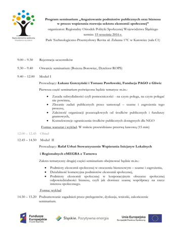 Program seminarium „Angażowanie podmiotów publicznych oraz biznesu w proces wspierania rozwoju sektora ekonomii społecznej” organizator: Regionalny Ośrodek Polityki Społecznej Województwa Śląskiego termin: 15 września 2016 r. Park Technologiczno-Przemysłowy Revita ul. Żelazna 17C w Katowice (sala C1) 9.00 – 9.30 Rejestracja uczestników 9.30 – 9.40 Otwarcie seminarium (Bożena Borowiec, Dyrektor ROPS) 9.40 – 12.00 Moduł I Prowadzący: Łukasz Gorczyński i Tomasz Pawłowski, Fundacja PAGO z Gliwic Pierwsza część seminarium poświęcona będzie tematyce m.in.: Zasada subsydialności czyli pomocniczości - na czym polega, na czym polegać nie powinna, Zlecanie zadań publicznych przez samorząd – szanse i zagrożenia tego procesu, Zależność organizacji pozarządowych od środków publicznych i funduszy grantowych, Konsekwencje ograniczenia środków publicznych dostępnych dla NGO Forma: warsztat i wykład. W trakcie przewidziano przerwę kawową (15 min) 12.00 – 12.45 Obiad 12.45 – 14.50 Moduł II Prowadzący: Rafał Urbaś Stowarzyszenie Wspierania Inicjatyw Lokalnych i Regionalnych eMEGRA z Tarnowa Zakres tematyczny drugiej części seminarium obejmować będzie m.in.: Podmioty ekonomii społecznej w otoczeniu biznesowym – szanse i zagrożenia, Działalność komercyjna podmiotów ekonomii społecznej, Podmioty ekonomii społecznej w korporacyjnym obszarze społecznej odpowiedzialności biznesu, czyli jak dostrzec szansę współpracy na rzecz interesu społecznego. Forma: wykład 14.50 – 15.20 Podsumowanie zagadnień przez prelegentów, dyskusja, wnioski, zakończenie seminarium.