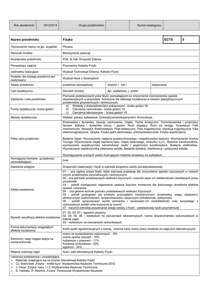 Rok akademicki: 2013/2014 Grupa przedmiotów: Numer katalogowy: Nazwa przedmiotu Fizyka Tłumaczenie nazwy na jęz. angielski Physics Kierunek studiów Bioinżynieria zwierząt Koordynator przedmiotu Prof. dr hab. Krzysztof Dołowy Prowadzący zajęcia Pracownicy Katedry Fizyki Jednostka realizująca Wydział Technologii Drewna, Katedra Fizyki Wydział, dla którego przedmiot jest realizowany Wydział Nauk o Zwierzętach Status przedmiotu przedmiot obowiązkowy stopień I rok I Semestr zimowy Jęz. wykładowy: j. polski Cykl dydaktyczny Założenia i cele przedmiotu Formy dydaktyczne, liczba godzin Metody dydaktyczne ECTS 5 stacjonarne Poznanie podstawowych praw fizyki, pozwalającym na zrozumienie mechanizmów zjawisk obserwowanych w przyrodzie, konieczne dla dalszego kształcenia w ramach specjalistycznych przedmiotów przyrodniczych i technicznych. a) Wykłady z doświadczeniami pokazowymi - liczba godzin 30 b) Ćwiczenia rachunkowe - liczba godzin 15 c) Ćwiczenia laboratoryjne - liczba godzin 15 Wykład, pokazy wykładowe. Doświadczenie/eksperyment. Konsultacje. Kinematyka i dynamika. Zasady zachowania. Ciepło. Teoria kinetyczna. Termodynamika i przemiany fazowe. Statyka i dynamika cieczy i gazów. Ruch drgający. Ruch po okręgu. Grawitacja. Fale mechaniczne. Akustyka. Elektrostatyka. Prąd elektryczny. Pole magnetyczne. Indukcja magnetyczna. Fale elektromagnetyczne. Optyka. Fizyka jądra atomowego, promieniotwórczość. Fizyka współczesna Pełny opis przedmiotu Badanie drgań. Wyznaczanie napięcia powierzchniowego i współczynnika lepkości. Wyznaczanie modułu Younga. Wyznaczanie ciepła topnienia lodu, ciepła właściwego, stosunku Cp/Cv. Badanie transformatora, wyznaczanie współczynnika samoindukcji cewki i pojemności kondensatora. Badanie elektrolitów. Wyznaczanie współczynnika załamania światła. Badanie dyfrakcji, interferencji i polaryzacji światła. Rozwiązywanie prostych zadań ilustrujących materiał omawiany na wykładach. Wymagania formalne (przedmioty wprowadzające) brak Założenia wstępne Znajomość matematyki i fizyki w zakresie programu szkoły ponadpodstawowej. Efekty kształcenia 01 - zna ogólne prawa fizyki, które stanowią podstawę dla zrozumienia zjawisk nauczanych w ramach innych przedmiotów przyrodniczych i technicznych. 02 - zna jednostki podstawowych wielkości fizycznych i rozumie zapis ich wielokrotności określanych przez przedrostki 03 - potrafi rozwiązywać najprostsze zadania fizyczne, konieczne dla ilościowego określenia efektów zjawisk i procesów 04 - zna główne techniki pomiaru podstawowych wielkości fizycznych 05 - potrafi posługiwać się prostymi przyrządami mechanicznymi (suwmiarką, wagą, stoperem), elektrycznymi (woltomierzem, amperomierzem), optycznymi (refraktometr, polarymetr) 06 - potrafi opracowywać wyniki pomiarów i oszacować ich niedokładność oraz korzystając z różnorodnych źródeł umie krytycznie je ocenić 07 - rozumie potrzebę poszerzania swojej wiedzy z fizyki - podstawowej nauki przyrodniczej Sposób weryfikacji efektów kształcenia 01, 02, 03, 07 – egzamin pisemny 02, 04, 05, 06 – kolokwium na ćwiczeniach laboratoryjnych, ocena eksperymentów wykonywanych w trakcie zajęć 03 – kolokwium na ćwiczeniach rachunkowych Forma dokumentacji osiągniętych efektów kształcenia Karta pytań egzaminacyjnych z oceną, imienne karty oceny pracy studenta na zajęciach laboratoryjnych. Elementy i wagi mające wpływ na ocenę końcową oceny ze sprawdzianów wejściowych - 6% ocena opisów ćwiczeń - 16% kolokwium z pracowni - 11% Kolokwia rachunkowe - 33% egzamin - 34% Miejsce realizacji zajęć Aula i sale laboratoryjne Katedry Fizyki. Literatura podstawowa i uzupełniająca • Materiały znajdujące się na stronie internetowej Katedry Fizyki • Cz. Bobrowski „Fizyka – krótki kurs” Wydawnictwa Naukowo Techniczne 2012 • J. Orear „Fizyka” tomy 1 i 2; Wydawnictwa Naukowo Techniczne • D. Halliday, R. Resnick „Fizyka” Państwowe Wydawnictwo Naukowe UWAGI Wskaźniki ilościowe charakteryzujące moduł/przedmiot: Szacunkowa sumaryczna liczba godzin pracy studenta (kontaktowych i pracy własnej) niezbędna dla osiągnięcia zakładanych efektów kształcenia - na tej podstawie należy wypełnić pole ECTS: Łączna liczba punktów ECTS, którą student uzyskuje na zajęciach wymagających bezpośredniego udziału nauczycieli akademickich: Łączna liczba punktów ECTS, którą student uzyskuje w ramach zajęć o charakterze praktycznym, takich jak zajęcia laboratoryjne, projektowe, itp.: 120 h 2,5 ECTS 2,5 ECTS Tabela zgodności kierunkowych efektów kształcenia efektami przedmiotu Nr /symbol efektu 01/W 02/W 03/U 04/W 05/U 06/U 07/K Wymienione w wierszu efekty kształcenia: Student zna ogólne prawa fizyki, które stanowią podstawę dla zrozumienia zjawisk nauczanych w ramach innych przedmiotów przyrodniczych i technicznych. Student zna jednostki podstawowych wielkości fizycznych i rozumie zapis ich wielokrotności określanych przez przedrostki Student potrafi rozwiązywać najprostsze zadania fizyczne, konieczne dla ilościowego określenia efektów zjawisk i procesów Student zna główne techniki pomiaru podstawowych wielkości fizycznych Student potrafi posługiwać się prostymi przyrządami mechanicznymi (suwmiarką, wagą, stoperem), elektrycznymi (woltomierzem, amperomierzem), optycznymi (refraktometr, polarymetr) Student potrafi opracowywać wyniki pomiarów, oszacować ich niedokładność oraz korzystając z różnorodnych źródeł umie krytycznie je ocenić Student rozumie potrzebę poszerzania swojej wiedzy z fizyki - podstawowej nauki przyrodniczej Odniesienie do efektów dla programu kształcenia na kierunku B_W02 B_W02 B_U06 B_W09 B_U02, B_U05, B_U08 B_U01, B_U11 B_K01