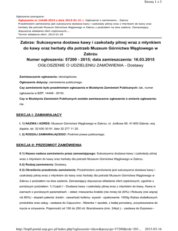 Strona 1 z 3 Ogłoszenie powiązane: Ogłoszenie nr 14448-2015 z dnia 2015-01-21 r. Ogłoszenie o zamówieniu - Zabrze Przedmiotem zamówienia jest sukcesywna dostawa kawy i czekolady pitnej wraz z młynkiem do kawy oraz herbaty dla potrzeb Muzeum Górnictwa Węglowego w Zabrzu z podziałem na dwa zadania. Zamawiający dopuszcza składanie ofert częściowych,... Termin składania ofert: 2015-01-29 Zabrze: Sukcesywna dostawa kawy i czekolady pitnej wraz z młynkiem do kawy oraz herbaty dla potrzeb Muzeum Górnictwa Węglowego w Zabrzu Numer ogłoszenia: 57200 - 2015; data zamieszczenia: 16.03.2015 OGŁOSZENIE O UDZIELENIU ZAMÓWIENIA - Dostawy Zamieszczanie ogłoszenia: obowiązkowe. Ogłoszenie dotyczy: zamówienia publicznego. Czy zamówienie było przedmiotem ogłoszenia w Biuletynie Zamówień Publicznych: tak, numer ogłoszenia w BZP: 14448 - 2015r. Czy w Biuletynie Zamówień Publicznych zostało zamieszczone ogłoszenie o zmianie ogłoszenia: nie. SEKCJA I: ZAMAWIAJĄCY I. 1) NAZWA I ADRES: Muzeum Górnictwa Węglowego w Zabrzu, ul. Jodłowa 59, 41-800 Zabrze, woj. śląskie, tel. 32 630 30 91, faks 32 277 11 25. I. 2) RODZAJ ZAMAWIAJĄCEGO: Podmiot prawa publicznego. SEKCJA II: PRZEDMIOT ZAMÓWIENIA II.1) Nazwa nadana zamówieniu przez zamawiającego: Sukcesywna dostawa kawy i czekolady pitnej wraz z młynkiem do kawy oraz herbaty dla potrzeb Muzeum Górnictwa Węglowego w Zabrzu. II.2) Rodzaj zamówienia: Dostawy. II.3) Określenie przedmiotu zamówienia: Przedmiotem zamówienia jest sukcesywna dostawa kawy i czekolady pitnej wraz z młynkiem do kawy oraz herbaty dla potrzeb Muzeum Górnictwa Węglowego w Zabrzu z podziałem na dwa zadania. Zamawiający dopuszcza składanie ofert częściowych, zgodnie z poniższym podziałem: 1) Część I - Dostawa kawy i czekolady pitnej wraz z młynkiem do kawy, Kawa w ziarnach o poniższych parametrach: - skład: mieszanka Arabiki (nie mniej niż 20%) i Robusty (nie więcej niż 80%) - stopień palenia: średni - zawartość kofeiny: wysoki - opakowanie: 1000g Wykaz dodatkowych produktów oraz usług - zastawa do Capuccino - filiżanka + spodek, z białej porcelany, przystosowana do mycia w zmywarce. Pojemność od 150 do 250 ml. Brandowana (min. 24kpl.); - zastawa do Espresso - http://bzp0.portal.uzp.gov.pl/index.php?ogloszenie=show&pozycja=57200&rok=201... 2015-03-16 Strona 2 z 3 filiżanka + spodek z białej gastronomicznej porcelany, przystosowana do mycia w zmywarce. Poj. Maks. 70 ml. Brandowana (min. 24kpl.); - szklanka do wody do Espresso - pojemność maks. 90 ml. Brandowana (min. 24szt.); - szklanka do Machiatto z uchem, przeznaczona do mycia w zmywarce. Pojemność od 250 do 350ml. Brandowana (min. 24 szt.); - szklanka do Latte z uchem, przeznaczona do mycia w zmywarce. Pojemność maks. 250-350ml; Brandowana (min. 24szt.); - usługa serwisowania ekspresu: przegląd techniczny (2 razy w okresie obowiązywania umowy), sprawdzanie ustawienia młynka do kawy i jego regulacja w razie potrzeby, czyszczenie i odkamienianie ekspresu 2) Część II - Dostawa herbaty. Czarne herbaty gatunkowe Dilmah Premium Ceylon, Dilmah Ceylon Gold, Dilmah Ceylon Supreme, Dilmah English Breakfast, Dilmah English Aftrenoon, Dilmah Herbata Earl Grey Czarne herbaty aromatyzowane Dilmah Herbata Cytrynowa, Dilmah Herbata Lychee, Dilmah Herbata Malinowa, Dilmah Herbata Czarna Porzeczka, Dilmah Herbata Malinowa, Dilmah Herbata Truskawkowa, Dilmah Herbata Imbir & Miód, Dilmah Herbata Mango & Truskawka, Dilmah Herbata Gruszka-Pomarańcza, Dilmah Herbata Jagoda & Wanilia, Dilmah Herbata Mięta Pieprzowa. Herbaty zielone Dilmach Pure Green, Dilmah Herbata ZielonaJaśminowa Wykaz dodatkowych produktów: - prezentery do ekspozycji herbat szt. 4; - filiżanki brandowane wraz ze spodkami i przykrywkami, nadającymi się do mycia w zmywarce -pojemność max 250ml (min. 24szt.); - czajniczki do herbaty, nadające się do mycia w zmywarce -pojemność max 500ml (min. 12szt.). Podane ilości produktów w poszczególnych częściach (I, II) są szacunkowe i w trakcie realizacji zamówienia mogą ulec zmniejszeniu. Podane ilości służą wyłącznie do porównania ofert oraz wyboru oferty najkorzystniejszej , tzn. że nie stanowią ostatecznego rozmiaruzamówienia i nie mogą stanowić podstaw do zgłaszania roszczeń z tytułu niezrealizowanych dostaw albo podstaw do odmowy realizacji dostaw. Zamawiający nie będzie ponosił ujemnych skutków finansowych spowodowanych zmniejszeniem ilości i wartości dostaw. Każdy produkt winien być wyprodukowany i wprowadzony do obrotu zgodnie z normami systemu HACCP. Wykonawca ponosi odpowiedzialność za wady jakościowe dostarczanych produktów (ukryte, nie ukryte) i za uszkodzenia powstałe w wyniku ich transportu oraz zobowiązany jest do niezwłocznej (w okresie 24 godzin od zgłoszenia) wymiany wadliwego towarowe we własnym zakresie i na własny koszt. Dostawy realizowane będą na podstawie bieżących zamówień składanych przez uprawnionego pracownika Zamawiającego (telefonicznie, pisemnie lub elektronicznie) składanych z minimum dwudniowym wyprzedzeniem. Wykonawca będzie dostarczał przedmiot zamówienia do miejsc wskazanych przez Zamawiającego. Dostawa, rozładunek i wniesienie realizowane będą na koszt dostawy wkalkulowany w cenę dostarczanych towarów. Dostarczane produkty spełniać muszą określone prawem wymogi dla tych produktów, w tym wymogi zdrowotne. Materiał opakowaniowy winny być dopuszczony do kontaktu z żywnością. Produkty oznakowane mają być zgodnie z wymaganiami rozporządzenia w sprawie oznakowania środków spożywczych (Dz. U. z 2007 r. Nr 137, poz. 966), tzn. muszą zawierać: nazwę, wykaz i ilość składników lub kategorii składników, zawartość netto w opakowaniu, datę minimalnej trwałości lub termin przydatności do spożycia, warunki przechowywania, firmę i adres producenta lub przedsiębiorcy paczkującego środek spożywczy, nazwę i adres producenta. Dostarczane produk