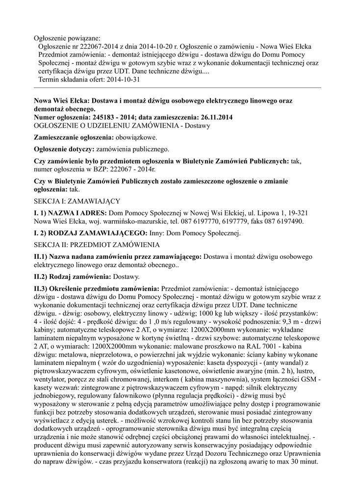 Ogłoszenie powiązane: Ogłoszenie nr 222067-2014 z dnia 2014-10-20 r. Ogłoszenie o zamówieniu - Nowa Wieś Ełcka Przedmiot zamówienia: - demontaż istniejącego dźwigu - dostawa dźwigu do Domu Pomocy Społecznej - montaż dźwigu w gotowym szybie wraz z wykonanie dokumentacji technicznej oraz certyfikacja dźwigu przez UDT. Dane techniczne dźwigu.... Termin składania ofert: 2014-10-31 Nowa Wieś Ełcka: Dostawa i montaż dźwigu osobowego elektrycznego linowego oraz demontaż obecnego. Numer ogłoszenia: 245183 - 2014; data zamieszczenia: 26.11.2014 OGŁOSZENIE O UDZIELENIU ZAMÓWIENIA - Dostawy Zamieszczanie ogłoszenia: obowiązkowe. Ogłoszenie dotyczy: zamówienia publicznego. Czy zamówienie było przedmiotem ogłoszenia w Biuletynie Zamówień Publicznych: tak, numer ogłoszenia w BZP: 222067 - 2014r. Czy w Biuletynie Zamówień Publicznych zostało zamieszczone ogłoszenie o zmianie ogłoszenia: tak. SEKCJA I: ZAMAWIAJĄCY I. 1) NAZWA I ADRES: Dom Pomocy Społecznej w Nowej Wsi Ełckiej, ul. Lipowa 1, 19-321 Nowa Wieś Ełcka, woj. warmińsko-mazurskie, tel. 087 6197770, 6197779, faks 087 6197490. I. 2) RODZAJ ZAMAWIAJĄCEGO: Inny: Dom Pomocy Społecznej. SEKCJA II: PRZEDMIOT ZAMÓWIENIA II.1) Nazwa nadana zamówieniu przez zamawiającego: Dostawa i montaż dźwigu osobowego elektrycznego linowego oraz demontaż obecnego.. II.2) Rodzaj zamówienia: Dostawy. II.3) Określenie przedmiotu zamówienia: Przedmiot zamówienia: - demontaż istniejącego dźwigu - dostawa dźwigu do Domu Pomocy Społecznej - montaż dźwigu w gotowym szybie wraz z wykonanie dokumentacji technicznej oraz certyfikacja dźwigu przez UDT. Dane techniczne dźwigu. - dźwig: osobowy, elektryczny linowy - udźwig; 1000 kg lub większy - ilość przystanków: 4 - ilość dojść: 4 - prędkość dźwigu: do 1 ,0 m/s regulowany - wysokość podnoszenia: 9,3 m - drzwi kabiny; automatyczne teleskopowe 2 AT, o wymiarze: 1200X2000mm wykonanie: wykładane laminatem niepalnym wyposażone w kortynę świetlną - drzwi szybowe: automatyczne teleskopowe 2 AT, o wymiarach: 1200X2000mm wykonanie: malowane proszkowo na RAL 7001 - kabina dźwigu: metalowa, nieprzelotowa, o powierzchni jak wyjdzie wykonanie: ściany kabiny wykonane laminatem niepalnym ( wzór do uzgodnienia) wyposażenie: kaseta dyspozycji - (anty wandal) z piętrowskazywaczem cyfrowym, oświetlenie kasetonowe, oświetlenie awaryjne (min. 2 h), lustro, wentylator, poręcz ze stali chromowanej, interkom ( kabina maszynownia), system łączności GSM kasety wezwań: zintegrowane z piętrowskazywaczem cyfrowym - napęd: silnik elektryczny jednobiegowy, regulowany falownikowo (płynna regulacja prędkości) - dźwig musi być wyposażony w sterowanie z pełną edycją parametrów umożliwiające pełny dostęp i programowanie funkcji bez potrzeby stosowania dodatkowych urządzeń, sterowanie musi posiadać zintegrowany wyświetlacz z edycją usterek. - możliwość wzrokowej kontroli stanu lin bez potrzeby stosowania dodatkowych urządzeń - oprogramowanie sterownika dźwigu musi być integralną częścią urządzenia i nie może stanowić odrębnej części obciążonej prawami do własności intelektualnej. producent dźwigu musi zapewnić autoryzowany serwis konserwacyjny posiadający odpowiednie uprawnienia do konserwacji dźwigów wydane przez Urząd Dozoru Technicznego oraz Uprawnienia do napraw dźwigów. - czas przyjazdu konserwatora (reakcji) na zgłoszoną awarię to max 30 minut. - dźwig musi być wyposażony w system umożliwiający dojazd do najbliższego przystanku i otwarcie drzwi. - zbiorczość góra dół - dźwig musi być wyposażony w system ograniczonego dostępu PROX NET i 100 kart dostępowych. - dźwig musi być wyposażony w system informacji głosowej. - dźwig powinien spełniać wymagania dostępności dla osób niepełnosprawnych. - po wstępnej weryfikacji konstrukcji dźwigów stwierdzono bardzo dobry stan wsporników oraz prowadnic i nie ma potrzeby ich wymiany. Oferent powinien określić potrzebę lub jej brak renowacja malowania szybu i maszynowni. - dźwig powinien być przystosowany do zainstalowania systemu monitoringu kabiny. - dostawca dźwigu opracuje kompletną dokumentację zawierającą również weryfikację konstrukcji szybu dźwigowego i maszynowni oraz protokół części budowlanej dźwigu ( poświadczenie wytrzymałości szybu i maszynowni). - szyb: wymiary wewnętrzne (istniejący) - podszybia: głębokość 1200 mm - nadszybie:wysokość 3200 mm - maszynownia: górna- (istniejąca) - wentylacja: grawitacyjna nawiewno- wywiewna maszynowni i wywiewna szybu ( istniejąca) - wymiary kabiny istniejącej 150 cmx250 cm.. II.4) Wspólny Słownik Zamówień (CPV): 42.41.61.00-6, 45.31.31.00-5. SEKCJA III: PROCEDURA III.1) TRYB UDZIELENIA ZAMÓWIENIA: Przetarg nieograniczony III.2) INFORMACJE ADMINISTRACYJNE • Zamówienie dotyczy projektu/programu finansowanego ze środków Unii Europejskiej: nie SEKCJA IV: UDZIELENIE ZAMÓWIENIA IV.1) DATA UDZIELENIA ZAMÓWIENIA: 12.11.2014. IV.2) LICZBA OTRZYMANYCH OFERT: 2. IV.3) LICZBA ODRZUCONYCH OFERT: 0. IV.4) NAZWA I ADRES WYKONAWCY, KTÓREMU UDZIELONO ZAMÓWIENIA: • LIFT SERVICE S.A. Lubelska Wytwórnia Dźwigów Osobowych, ul. Roztocze 6, 20-722 Lublin, kraj/woj. lubelskie. IV.5) Szacunkowa wartość zamówienia (bez VAT): 110000,00 PLN. IV.6) INFORMACJA O CENIE WYBRANEJ OFERTY ORAZ O OFERTACH Z NAJNIŻSZĄ I NAJWYŻSZĄ CENĄ • Cena wybranej oferty: 116640,00 • Oferta z najniższą ceną: 116640,00 / Oferta z najwyższą ceną: 202642,50 • Waluta: PLN.