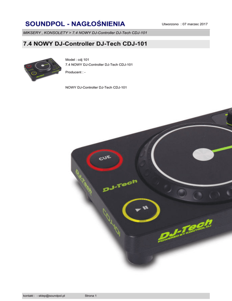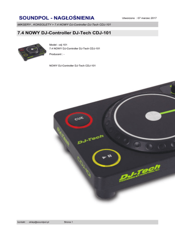 SOUNDPOL - NAGŁOŚNIENIA MIKSERY , KONSOLETY > 7.4 NOWY DJ-Controller DJ-Tech CDJ-101 7.4 NOWY DJ-Controller DJ-Tech CDJ-101 Model : cdj 101 7.4 NOWY DJ-Controller DJ-Tech CDJ-101 Producent : - NOWY DJ-Controller DJ-Tech CDJ-101 kontakt : - [email protected] Strona 1 Utworzono : 07 marzec 2017 SOUNDPOL - NAGŁOŚNIENIA MIKSERY , KONSOLETY > 7.4 NOWY DJ-Controller DJ-Tech CDJ-101 7.4 NOWY DJ-Controller DJ-Tech CDJ-101 kontakt : - [email protected] Strona 2 Utworzono : 07 marzec 2017 SOUNDPOL - NAGŁOŚNIENIA MIKSERY , KONSOLETY > 7.4 NOWY DJ-Controller DJ-Tech CDJ-101 7.4 NOWY DJ-Controller DJ-Tech CDJ-101 kontakt : - [email protected] Strona 3 Utworzono : 07 marzec 2017 SOUNDPOL - NAGŁOŚNIENIA Utworzono : 07 marzec 2017 MIKSERY , KONSOLETY > 7.4 NOWY DJ-Controller DJ-Tech CDJ-101 7.4 NOWY DJ-Controller DJ-Tech CDJ-101 DANE TECHNICZNE: :USB-MIDI DJ kontroler z 8 wybieranych kanałów MIDI - Do pracy z oprogramowaniem obsługującym MIDI jak traktor, Deckadance, Ableton, Mixvibes wysokiej jakości i wysokiej rozdzielczości 13cm (5 ") krążek z regulacją czułości Ultra kompaktowy rozmiar - mieści się w torbie na laptopa nadaje się do użytku z komputerami z systemem Windows i MacOpis Kontroler DJ-Tech DJ CDJ-101 :Złącza: 1 x interfejs USBPrzepustowość: 7 komunikaty MIDISterowanie: 1 x 100mm tłumiki, koło jog, 2 przyciski, 1 x obrotowy przycisk z "push, aby przełączyć" funkcji częściowo oświetlony kran Zasilanie: poprzez USB lub zasilacz 6V (brak w zestawie) Dostawa DJ Controller DJ-Tech CDJ-101:1 Jednostka x1 x kabel USB1 x płyta CD z oprogramowaniemNiemiecki obsługi (inne języki: w tym angielski, francuski, włoski) Wymiary kontrolera DJ-Tech DJ CDJ-101:21 x 6,6 x 14cm (SxWxG)Waga: 0,6 kg Cena : 150,00 zł Brutto ( 121,95 zł Netto) Dostępność: Produkt dostępny w naszym sklepie od 11 sierpień 2014 kontakt : - [email protected] Strona 4