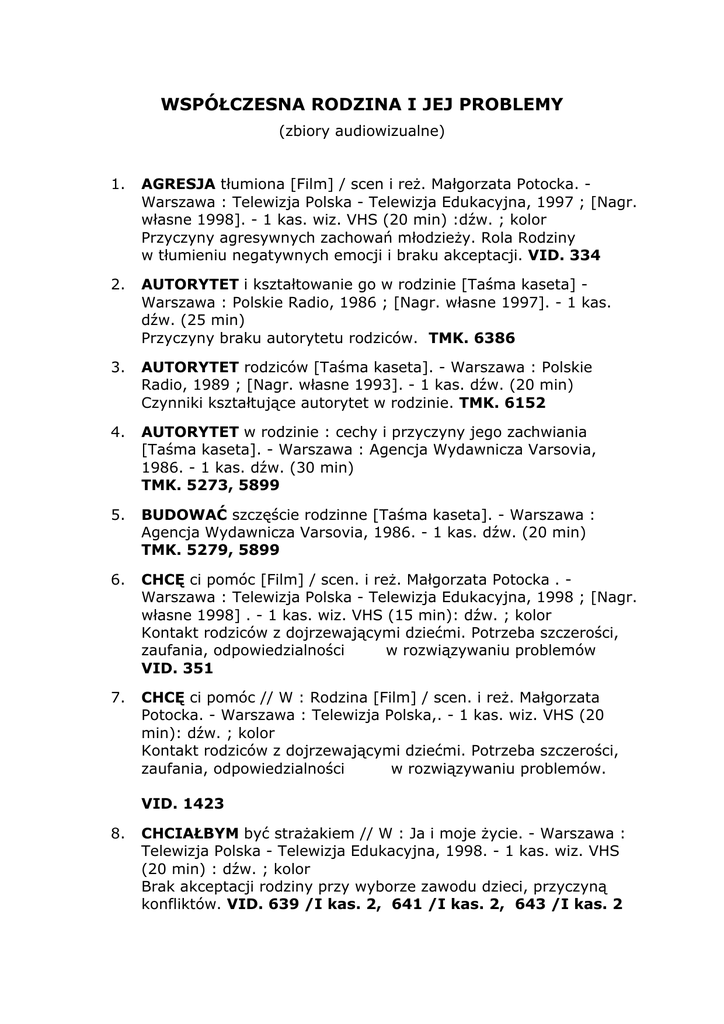 WSPÓŁCZESNA RODZINA I JEJ PROBLEMY (zbiory audiowizualne) 1. AGRESJA tłumiona [Film] / scen i reż. Małgorzata Potocka. Warszawa : Telewizja Polska - Telewizja Edukacyjna, 1997 ; [Nagr. własne 1998]. - 1 kas. wiz. VHS (20 min) :dźw. ; kolor Przyczyny agresywnych zachowań młodzieży. Rola Rodziny w tłumieniu negatywnych emocji i braku akceptacji. VID. 334 2. AUTORYTET i kształtowanie go w rodzinie [Taśma kaseta] Warszawa : Polskie Radio, 1986 ; [Nagr. własne 1997]. - 1 kas. dźw. (25 min) Przyczyny braku autorytetu rodziców. TMK. 6386 3. AUTORYTET rodziców [Taśma kaseta]. - Warszawa : Polskie Radio, 1989 ; [Nagr. własne 1993]. - 1 kas. dźw. (20 min) Czynniki kształtujące autorytet w rodzinie. TMK. 6152 4. AUTORYTET w rodzinie : cechy i przyczyny jego zachwiania [Taśma kaseta]. - Warszawa : Agencja Wydawnicza Varsovia, 1986. - 1 kas. dźw. (30 min) TMK. 5273, 5899 5. BUDOWAĆ szczęście rodzinne [Taśma kaseta]. - Warszawa : Agencja Wydawnicza Varsovia, 1986. - 1 kas. dźw. (20 min) TMK. 5279, 5899 6. CHCĘ ci pomóc [Film] / scen. i reż. Małgorzata Potocka . Warszawa : Telewizja Polska - Telewizja Edukacyjna, 1998 ; [Nagr. własne 1998] . - 1 kas. wiz. VHS (15 min): dźw. ; kolor Kontakt rodziców z dojrzewającymi dziećmi. Potrzeba szczerości, zaufania, odpowiedzialności w rozwiązywaniu problemów VID. 351 7. CHCĘ ci pomóc // W : Rodzina [Film] / scen. i reż. Małgorzata Potocka. - Warszawa : Telewizja Polska,. - 1 kas. wiz. VHS (20 min): dźw. ; kolor Kontakt rodziców z dojrzewającymi dziećmi. Potrzeba szczerości, zaufania, odpowiedzialności w rozwiązywaniu problemów. VID. 1423 8. CHCIAŁBYM być strażakiem // W : Ja i moje życie. - Warszawa : Telewizja Polska - Telewizja Edukacyjna, 1998. - 1 kas. wiz. VHS (20 min) : dźw. ; kolor Brak akceptacji rodziny przy wyborze zawodu dzieci, przyczyną konfliktów. VID. 639 /I kas. 2, 641 /I kas. 2, 643 /I kas. 2 9. DOJRZAŁOŚĆ społeczna [Film] / scen. Anna Kurowska, Andrzej Jaczewski. - Warszawa : Telewizja Polska - Telewizja Edukacyjna, 1990 ; [Nagr. własne 1992]. - 1 kas. wiz. VHS (20 min) : dźw. ; kolor Program Edukacyjny omawiający zagadnienia związane z decyzjami o małżeństwie, macierzyństwie i odpowiedzialności za rodzinę. VID. 29 10. DZIECI i rodzice - jak szukać porozumienia [Film]. - Warszawa: Wydawnictwo Naukowe PWN, 2000. - 1 kas. wiz. VHS ( 13 min): dźw. ; kolor Interesujący program koncentrujący się na przyczynach braku porozumienia we wzajemnych relacjach rodziców i dzieci. Prezentuje przykłady konfliktów i sposoby ich rozwiązywania. VID. 949 979 11. DZIECI maltretowane i molestowane : jak o tym mówić [Film]. Warszawa : Wydawnictwo Naukowe PWN , 1998. - 1 kas. wiz,. VHS (30 min) : dźw. ; kolor Program przybliża problematykę dziecka maltretowanego fizycznie, wykorzystywanego seksualnie oraz zaniedbywanego przez rodziców i opiekunów. VID. 593, 1020 12. DZIECI rodzące dzieci : blaski i cienie wczesnego macierzyństwa [Film]. - Warszawa : Wydawnictwo Naukowe PWN, 1999. - 1 kas. wiz. VHS (17 min) : dźw. ; kolor Program dostarcza informacji na temat skali, przyczyn i konsekwencji wczesnego macierzyństwa. VID. 843 13. DZIECI z rozbitych rodzin [Film] / scen. Izabela Dukaczewska. Warszawa : Telewizja Polska - Telewizja Edukacyjna, 1993 ; [Nagr. własne 1993]. - 1 kas. wiz. VHS (20 min): dźw. ; kolor Normy i zasady współżycia rodzinnego. Audycja z udziałem dzieci z niepełnych rodzin i ich spojrzenie na rozwód rodziców. VID. 74 14. DZIECKO w rodzinie alkoholowej. Cz. 1, Alkohol w gnieździe rodzinnym [Film] / oprac. Jerzy Mellibruda. - Warszawa : Instytut Psychologii Zdrowia, 1997. - 1 kas. wiz. VHS (30 min): dźw, ; kolor Wideo-wykłady o problematyce związanej ze zjawiskami alkoholizmu w rodzinach oraz szkodach jakie alkoholizm wywołuje w życiu rodziny. VID. 1580/1 15. DZIECKO w rodzinie alkoholowej. Cz. 2, Pomaganie dzieciom alkoholików [Film] / oprac. Jerzy Mellibruda. - Warszawa : Instytut Psychologii Zdrowia, 1997. - 1 kas. wiz. VHS (30 min): dźw, ; kolor + druk Program wskazuje zagrożenia dzieci oraz potrzebę pomocy i opieki nad dziećmi z rodzin nadużywających alkoholu. VID. 1580/3 16. DZIECKO w rodzinie alkoholowej. Cz. 3, Dorośli potomkowie alkoholików [Film] / oprac. Jerzy Mellibruda. - Warszawa : Instytut Psychologii Zdrowia, 1997. - 1 kas. wiz. VHS (30 min): dźw, ; kolor + druk Problemy związane z dziedziczeniem choroby alkoholowej. VID. 1580/3 17. DZWONIĘ do was, bo mam taki problem // W : Ja i moje życie [Film] / scen. i reż. Małgorzata Potocka ; teksty poradnika Maria Trawiska . - Warszawa : Telewizja Polska - Telewizja Edukacyjna, 1998. - 1 kas. wiz. VHS (20 min): dźw. ; kolor + poradnik Pomoc w skomplikowanych sytuacjach rodzinnych i emocjonalnych. VID. 639/1, 641/1, 643/1, 1422 18. GDY twoje dziecko dojrzewa [Film] / oprac. Zbigniew Starowicz. Warszawa : Film Video ; Studio R.W., 1993. - 1 kas. viz. VHS (60 min): dźw. ; kolor Wykład dla rodziców na temat dojrzewania dzieci i problemów z tym okresem związanych. VID. 181 19. GWAŁT rodzi gwałt [Film] / scen. i reż. Małgorzata Potocka. Warszawa : Telewizja Polska - Telewizja Edukacyjna, 1998 ; [Nagr. własne 1998]. - 1 kas. wiz. VHS (20 min): dźw. ; kolor Geneza i przyczyny agresywnych zachowań dzieci. VID. 345 20. JAK SOBIE radzić z problemami w bliskich związkach. Cz. 1, Rozpoznawanie i zrozumienie [Film] / oprac. Jerzy Mellibruda . Warszawa : Instytut Psychologii Zdrowia, 1997. - 1 kas. wiz. VHS (25 min) : dźw. ; kolor + druk Wideoprogram porusza zagadnienia związane z określeniem przyczyn narastających problemów w związkach małżeńskich lub nieformalnych. VID. 1574 /1 21. JAK SOBIE radzić z problemami w bliskich związkach. Cz. 2, Wyzwania i zadania [Film] / oprac. Jerzy Mellibruda . - Warszawa : Instytut Psychologii Zdrowia, 1997. - 1 kas. wiz. VHS (25 min) : dźw. ; kolor + druk Wideoprogram porusza zagadnienia związane z naprawianiem popełnianych bł