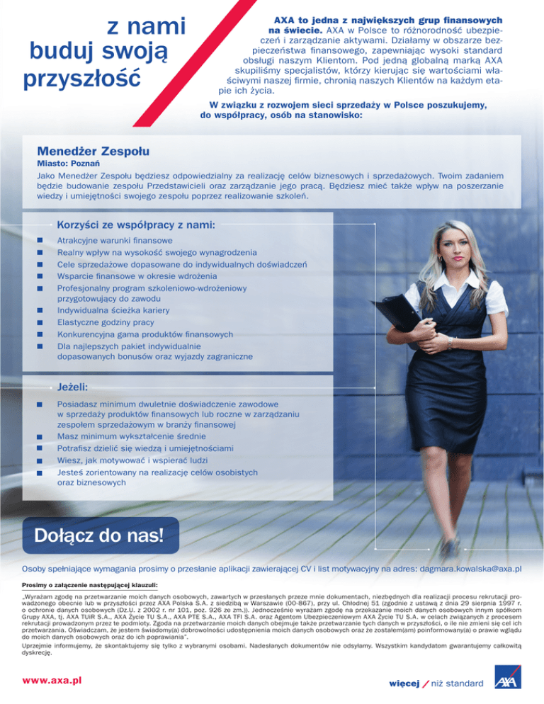 z nami buduj swoją przyszłość AXA to jedna z największych grup finansowych na świecie. AXA w Polsce to różnorodność ubezpieczeń i zarządzanie aktywami. Działamy w obszarze bezpieczeństwa finansowego, zapewniając wysoki standard obsługi naszym Klientom. Pod jedną globalną marką AXA skupiliśmy specjalistów, którzy kierując się wartościami właściwymi naszej firmie, chronią naszych Klientów na każdym etapie ich życia. W związku z rozwojem sieci sprzedaży w Polsce poszukujemy, do współpracy, osób na stanowisko: Menedżer Zespołu Miasto: Poznań Jako Menedżer Zespołu będziesz odpowiedzialny za realizację celów biznesowych i sprzedażowych. Twoim zadaniem będzie budowanie zespołu Przedstawicieli oraz zarządzanie jego pracą. Będziesz mieć także wpływ na poszerzanie wiedzy i umiejętności swojego zespołu poprzez realizowanie szkoleń. Korzyści ze współpracy z nami: Atrakcyjne warunki finansowe Realny wpływ na wysokość swojego wynagrodzenia Cele sprzedażowe dopasowane do indywidualnych doświadczeń Wsparcie finansowe w okresie wdrożenia Profesjonalny program szkoleniowo-wdrożeniowy przygotowujący do zawodu Indywidualna ścieżka kariery Elastyczne godziny pracy Konkurencyjna gama produktów finansowych Dla najlepszych pakiet indywidualnie dopasowanych bonusów oraz wyjazdy zagraniczne Jeżeli: Posiadasz minimum dwuletnie doświadczenie zawodowe w sprzedaży produktów finansowych lub roczne w zarządzaniu zespołem sprzedażowym w branży finansowej Masz minimum wykształcenie średnie Potrafisz dzielić się wiedzą i umiejętnościami Wiesz, jak motywować i wspierać ludzi Jesteś zorientowany na realizację celów osobistych oraz biznesowych Dołącz do nas! Osoby spełniające wymagania prosimy o przesłanie aplikacji zawierającej CV i list motywacyjny na adres: [email protected] Prosimy o załączenie następującej klauzuli: „Wyrażam zgodę na przetwarzanie moich danych osobowych, zawartych w przesłanych przeze mnie dokumentach, niezbędnych dla realizacji procesu rekrutacji prowadzonego obecnie lub w przyszłości przez AXA Polska S.A. z siedzibą w Warszawie (00-867), przy ul. Chłodnej 51 (zgodnie z ustawą z dnia 29 sierpnia 1997 r. o ochronie danych osobowych (Dz.U. z 2002 r. nr 101, poz. 926 ze zm.)). Jednocześnie wyrażam zgodę na przekazanie moich danych osobowych innym spółkom Grupy AXA, tj. AXA TUiR S.A., AXA Życie TU S.A., AXA PTE S.A., AXA TFI S.A. oraz Agentom Ubezpieczeniowym AXA Życie TU S.A. w celach związanych z procesem rekrutacji prowadzonym przez te podmioty. Zgoda na przetwarzanie moich danych obejmuje także przetwarzanie tych danych w przyszłości, o ile nie zmieni się cel ich przetwarzania. Oświadczam, że jestem świadomy(a) dobrowolności udostępnienia moich danych osobowych oraz że zostałem(am) poinformowany(a) o prawie wglądu do moich danych osobowych oraz do ich poprawiania”. Uprzejmie informujemy, że skontaktujemy się tylko z wybranymi osobami. Nadesłanych dokumentów nie odsyłamy. Wszystkim kandydatom gwarantujemy całkowitą dyskrecję. www.axa.pl więcej niż standard