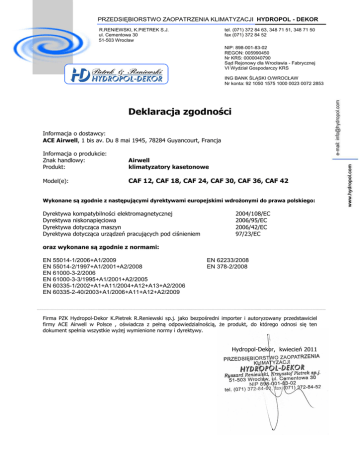 PRZEDSIĘBIORSTWO ZAOPATRZENIA KLIMATYZACJI HYDROPOL - DEKOR R.RENIEWSKI, K.PIETREK S.J. ul. Cementowa 30 51-503 Wrocław tel. (071) 372 84 63, 348 71 51, 348 71 50 fax (071) 372 84 52 NIP: 898-001-83-02 REGON: 005990450 Nr KRS: 0000040790 Sąd Rejonowy dla Wrocławia - Fabrycznej VI Wydział Gospodarczy KRS ING BANK ŚLĄSKI O/WROCŁAW Nr konta: 92 1050 1575 1000 0023 0072 2853 Deklaracja zgodności Informacja o dostawcy: ACE Airwell, 1 bis av. Du 8 mai 1945, 78284 Guyancourt, Francja Informacja o produkcie: Znak handlowy: Produkt: Airwell klimatyzatory kasetonowe Model(e): CAF 12, CAF 18, CAF 24, CAF 30, CAF 36, CAF 42 Wykonane są zgodnie z następującymi dyrektywami europejskimi wdrożonymi do prawa polskiego: Dyrektywa Dyrektywa Dyrektywa Dyrektywa kompatybilności elektromagnetycznej niskonapięciowa dotycząca maszyn dotycząca urządzeń pracujących pod ciśnieniem 2004/108/EC 2006/95/EC 2006/42/EC 97/23/EC oraz wykonane są zgodnie z normami: EN 55014-1/2006+A1/2009 EN 55014-2/1997+A1/2001+A2/2008 EN 61000-3-2/2006 EN 61000-3-3/1995+A1/2001+A2/2005 EN 60335-1/2002+A1+A11/2004+A12+A13+A2/2006 EN 60335-2-40/2003+A1/2006+A11+A12+A2/2009 EN 62233/2008 EN 378-2/2008 Firma PZK Hydropol-Dekor K.Pietrek R.Reniewski sp.j. jako bezpośredni importer i autoryzowany przedstawiciel firmy ACE Airwell w Polsce , oświadcza z pełną odpowiedzialnością, że produkt, do którego odnosi się ten dokument spełnia wszystkie wyżej wymienione normy i dyrektywy. Hydropol-Dekor, kwiecień 2011