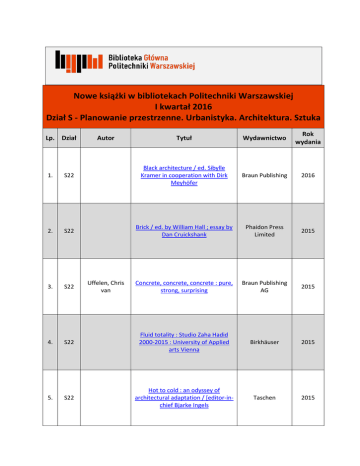 Nowe książki w bibliotekach Politechniki Warszawskiej I kwartał 2016 Dział S - Planowanie przestrzenne. Urbanistyka. Architektura. Sztuka Lp. Dział Autor Tytuł Wydawnictwo Rok wydania Braun Publishing 2016 1. S22 Black architecture / ed. Sibylle Kramer in cooperation with Dirk Meyhöfer 2. S22 Brick / ed. by William Hall ; essay by Dan Cruickshank Phaidon Press Limited 2015 3. S22 Concrete, concrete, concrete : pure, strong, surprising Braun Publishing AG 2015 4. S22 Fluid totality : Studio Zaha Hadid 2000-2015 : University of Applied arts Vienna Birkhäuser 2015 5. S22 Hot to cold : an odyssey of architectural adaptation / [editor-inchief Bjarke Ingels Taschen 2015 Uffelen, Chris van 6. S22 Piątek, Grzegorz Lukier i mięso : wokół architektury w Stowarzyszenie 40 Polsce po 1989 roku 000 Malarzy 2015 2015 7. S22 SuperLux : smart light art, design and architecture for cities / editor Davina Thames & Hudson Jackson 8. S23 Stowarzyszenie Doliwa-Klepacki, Dwory i dworki oraz ich właściciele w "Nauka, Edukacja, Zbigniew M. województwie świętokrzyskim. T. 1 Rozwój" 2013 9. S23 Doliwa-Klepacki, Dwory i dworki oraz ich właściciele w Zbigniew M. województwie świętokrzyskim. T. 2 Wyższa Szkoła Biznesu i Przedsiębiorczości 2016 10. S23 Arczyńska, Monika Form follows freedom : architektura dla kultury w Polsce 2000+ Międzynarodowe Centrum Kultury 2015 11. S23 Kramer, Sibylle Green, hidden and above : the most exceptional treehouses Braun Publishing AG 2015 12. S23 Uffelen, Chris van Link it! : masterpieces of bridge design Braun Publishing AG 2015 13. S04 Bania, Zbigniew Sztuka polska. [5], Późny barok, rokoko, klasycyzm (XVIII wiek) Wydawnictwo Arkady 2016 S10 Współczesne uwarunkowania gospodarowania przestrzenią szanse i zagrożenia dla zrównoważonego rozwoju : organizacja gospodarowania przestrzenią Oficyna Wydawnicza Politechniki Warszawakiej 2014 S10 Współczesne uwarunkowania gospodarowania przestrzenią szanse i zagrożenia dla zrównoważonego rozwoju : proces inwestycyjny Oficyna Wydawnicza Politechniki Warszawskiej 2014 S10 Współczesne uwarunkowania gospodarowania przestrzenią szanse i zagrożenia dla zrównoważonego rozwoju : planowanie przestrzenne Oficyna Wydawnicza Politechniki Warszawskiej 2014 S10 Współczesne uwarunkowania gospodarowania przestrzenią szanse i zagrożenia dla zrównoważonego rozwoju : społeczny wymiar gospodarowania przestrzenią Oficyna Wydawnicza Politechniki Warszawskiej 2014 14. 15. 16. 17. 18. S12 19. S12 20. S12 21. S12 22. S12 23. S12 Sohn, Dehyun Zawada, Dariusz Abriszewski, Krzysztof Go slow and curvy : understanding the philosophy of the cittaslow slowcity phenomenon Springer International Publishing Switzerland 2015 Locating gentrification in the Global East / guest eds. Hyun Bang Shin, Loretta Lees (…) University of Glasgow 2016 Miasto jako produkt skumulowany CeDeWu.pl 2016 My i oni : przestrzenie wspólne, projektowanie dla wspólnoty / autorzy: Rodrigo Perez De Arce (…) Fundacja Bęc Zmiana 2014 Smutek konkretu : materializacja idei : dziury w całym Fundacja Bęc Zmiana 2015 The rise of city cultures in the Central Europe / edited by Ewa Rewers Polish Scientific Publishers PWN 2015 Urbanistyka i architektura w zintegrowanym gospodarowaniu wodami Oficyna Wydawnicza Politechniki Warszawskiej 2016 2015 S12 Solarek, Krystyna. 25. S12 Michael Meier & Christoph Franz Warszawskie zdroje Centrum Sztuki Współczesnej Zamek Ujazdowski 26. S12 Łakomy, Katarzyna Willa w krajobrazie miasta przemysłowego Wydawnictwo Politechniki Krakowskiej 2015 27. S14 Kombol, Meaghan 30/30 : landscape architecture Phaidon Press 2015 28. S14 AutoCAD w architekturze krajobrazu / pod redakcją Piotra Sikorskiego i Macieja Żołnierczuka (…) Wydawnictwo SGGW 2015 29. S14 Historical ground : the role of history in contemporary landscape architecture Routledge/Taylor & Francis Group 2014 24. Hunt, John Dixon Modernism and landscape architecture : 1890-1940 / ed. by Therese O'Malley and Joachim Wolschke-Bulmahn National Gallery of Art. 2015 Aleksander & Maria Markiewicz : architekci = architects Wydawnictwo Salix alba 2014 Architektura jest najważniejsza : rozmowy / [przeprowadziła Ewa Mańkowska-Grin] EMG 2015 30. S14 31. S20 32. S20 33. S20 Jodidio, Philip Calatrava : Santiago Calatrava : complete works 1979 - today Taschen 2015 34. S20 Lach, Edward EL Studio Muzeum Architektury we Wrocławiu 2015 35. S20 Pallasmaa, Juhani Myśląca dłoń : egzystencjalna i ucieleśniona mądrość w architekturze Instytut Architektury 2015 Barucki, Tadeusz 36. S20 Jodidio, Philip . Shigeru Ban : complete works 19852015 Taschen 2015 Instytut Historii Sztuki Uniwersytetu Wrocławskiego 2015 37. S21 Wąs, Cezary Architektura a dekonstrukcja : przypadek Petera Eisenmana i Bernarda Tschumiego 38. S21 Grabowski, Wojciech Archi-traf : opowieści o architekturze Śląska i Zagłębia Śląsk 2015 39. S21 Badania architektoniczne : historia i perspektywy rozwoju / pod redakcją Mariana Arszyńskiego Wydział Sztuk Pięknych 2015 40. S21 Samusik, Katarzyna Dwory i pałace Polski północnowschodniej Fundacja Sąsiedzi 2015 41. S21 Hensbergen, Gijs van Gaudi : geniusz z Barcelony Wydawnictwo Marginesy 2015 Przed wojną i pałacem Dom Spotkań z Historią, Instytucja Kultury m.st. Warszawy 2015 42. S21 Stopa, Magdalena 43. S21 Karpińska, Marta Wacław Nowakowski Instytut Architektury 2015 44. S21 Cęckiewicz, Witold Witold Cęckiewicz. T. 1, Rozmowy o architekturze : projekty Instytut Architektury 2015 Witold Cęckiewicz. T. 2, Socrealizm, socmodernizm, postmodernizm : eseje / pod redakcją Marty Karpińskiej Instytut Architektury 2015 45. S21 46. S21 Czarnecki, Władysław Wspomnienia architekta Wydawnictwo Miejskie Posnania 2015 47. S22 Frampton, Kenneth A genealogy of modern architecture : comparative critical analysis of built form Lars Müller Publishers 2015 48. S22 Wright, Frank Lloyd Architektura nowoczesna : wykłady Wydawnictwo Karakter 2016 2015 