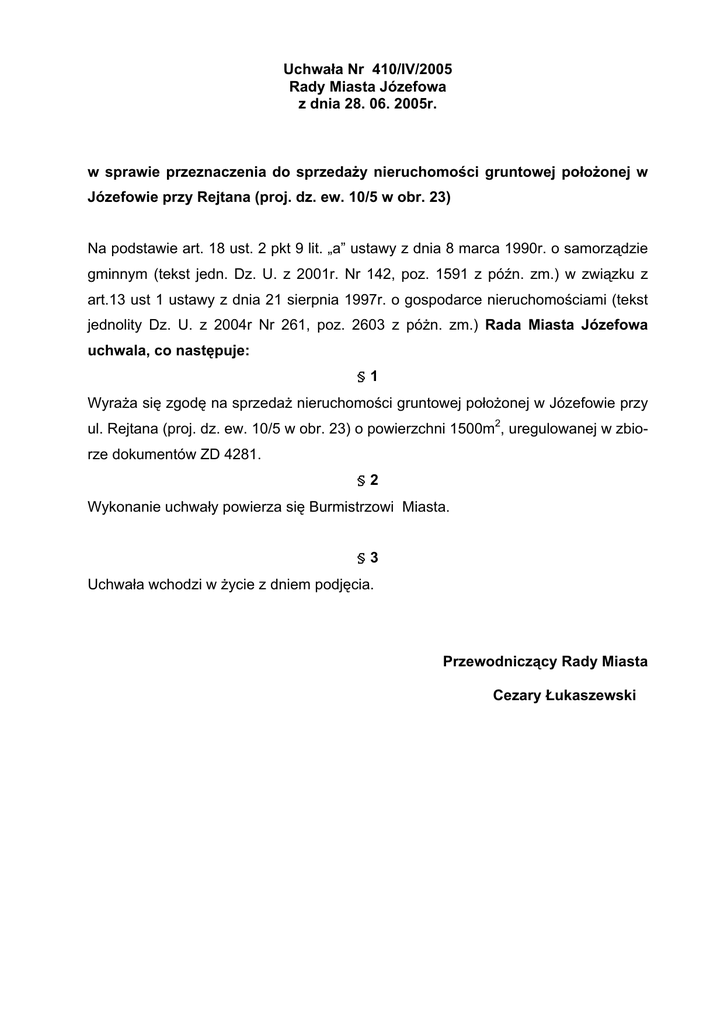 8FKZDáD1U,9 Rady Miasta Józefowa z dnia 28. 06. 2005r. Z VSUDZLH SU]H]QDF]HQLD GR VSU]HGD*\ QLHUXFKRPRFL JUXQWRZHM SRáR*RQHM Z Józefowie przy Rejtana (proj. dz. ew. 10/5 w obr. 23) Na podstawie art. 18 ust. 2 SNWOLWÄD´XVWDZ\]GQLDPDUFDURVDPRU]G]LH gminnym (tekst jedn. Dz. U. z 2001r. Nr 142, poz. 1591 z Sy(Q ]P Z ]ZL]NX ] DUWXVWXVWDZ\]GQLDVLHUSQLDURJRVSRGDUFHQLHUXFKRPRFLDPLWHNVW jednolity Dz. U. z 2004r Nr 261, poz. 2603 z Sy*Q ]P Rada Miasta Józefowa XFKZDODFRQDVW SXMH §1 :\UD*DVL ]JRG QDVSU]HGD*QLHUXFKRPRFLJUXQWRZHMSRáR*RQHMZ-y]HIRZLHSU]\ ul. Rejtana (proj. dz. ew. 10/5 w obr. 23) o powierzchni 1500m2, uregulowanej w zbiorze dokumentów ZD 4281. §2 :\NRQDQLHXFKZDá\SRZLHU]DVL %XUPLVWU]RZL0LDVWD §3 8FKZDáDZFKRG]LZ*\FLH]GQLHPSRGM FLD 3U]HZRGQLF]F\5DG\0LDVWD Cezary àXNDV]HZVNL Uzasadnienie GRXFKZDá\,9 Rady Miasta Józefowa Z VSUDZLH SU]H]QDF]HQLD GR VSU]HGD*\ QLHUXFKRPRFL JUXQWRZHM SRáR*RQHM Z Józefowie przy Rejtana (proj. dz. ew. 10/5 w obr. 23) 1LHUXFKRPRFLVWDQRZLFDZáDVQRü0LDVWD-y]HIRZDSRáR*RQDZ-y]HIRZLHSU]\ul. Rejtana uregulowana jest prawnie w zbiorze dokumentów ZD 4281 prowadzonym przez 6G5HMRQRZ\Z2WZRFNX LVWDQRZLG]LDáN HZLGHQF\MQQU]REU EXRSRZLHU]FKQL 5402m2. :HGáXJ XVWDOH RERZL]XMFHJR PLHMVFRZHJR SODQX RJyOQHJR ]DJRVSRGDURZDQLD przestrzennego miasta -y]HIRZD ]DWZLHUG]RQHJR 8FKZDá 5DG\ 0LDVWD Józefowa Nr 69/IV/03 z dnia 9 maja 2003r. w sprawie zmiany miejscowego planu zagospodarowania przestrzennego miasta Józefowa etap III A ( Dz.Urz. Wojew. Mazowieckiego Nr 190, poz. QLHUXFKRPRü SRáR*RQD MHVW QD WHUHQLH R]QDF]RQ\P V\PEROHP 5/] 3U]H]QDF]eniem podstawowym jednostki jest las z dopuszczeniem zabudowy mieszkaniowej jednoroG]LQQHMUHDOL]RZDQHMZIRUPLH]DEXGRZ\ZROQRVWRMFHMOXEEOL(QLDF]HM = QLHUXFKRPRFL ]RVWDáD Z\G]LHORQD JHRGH]\QLH G]LDáND R]QDF]RQD QXPHUHP 10/5 o powierzchni 1500m2±DWUDNF\MQLHMV]DGODSU]\V]á\FKLQZHVWRUyZ =E\FLHG]LDáNLXPR*OLZLSR]\VNDQLHQLH]E GQ\FKURGNyZILQDQVRZ\FKQDFHOHLQZe- VW\F\MQHRUD]UHDOL]DFM ]DGDSU]HZLG]LDQ\FKZEXG*HFLH0LDVWD 1LHUXFKRPRüSU]HZLG]LDQDMHVWGR]E\FLDZEXG*HFLHPLDVWDQDURN :]ZL]NX]SRZ\*V]\PZQRV] RSRGM FLHSU]H]5DG 0LDVWDXFKZDá\ZSRZ\*V]HM sprawie.