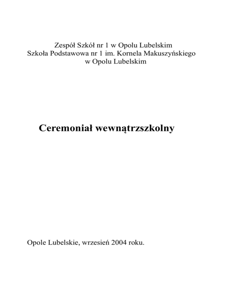 Zespół Szkół nr 1 w Opolu Lubelskim Szkoła Podstawowa nr 1 im. Kornela Makuszyńskiego w Opolu Lubelskim Ceremoniał wewnątrzszkolny Opole Lubelskie, wrzesień 2004 roku. -2- Spis treści : Wstęp Symbole szkoły Sztandar szkoły Hymn szkoły Pasowanie na ucznia szkoły podstawowej Pożegnanie absolwentów Uroczystości szkolne Stałe uroczystości wpisane w harmonogram pracy szkoły. Dekoracja budynku szkoły flagami państwowymi i Unii Europejskiej. -3Wstęp. Głównym zadaniem szkoły jest wszechstronny rozwój młodego człowieka podczas odpowiedzi proces nauczania i wychowania. Szkoła ma również przygotować do aktywnego życia w odpowiedzialnym i ofiarnym społeczeństwie obywatelskim. Podstawą funkcjonowania w społeczeństwie jest znajomość podstawowych reguł i zasad kultury bycia i kultury języka. Dlatego obok wiedzy i umiejętności przekazywanych na zajęciach lekcyjnych i pozalekcyjnych należy uczyć dzieci i młodzież podstawowych zasad postępowania w różnych miejscach i sytuacjach, poczynając od reguł i norm dotyczących organizacji szkolnych imprez świąt i uroczystości. Zbiorem ustanowionych i obowiązujących w szkole norm zachowania w czasie uroczystości szkolnych jest Ceremoniał Szkolny, który stanowi integralną część tradycji i programu wychowawczego placówki. Opisuje między innymi symbole szkoły i formy celebracji sztandaru. Zadaniem ceremoniału jest również pomoc w organizacji ślubowań i uroczystości. -4Symbole szkoły. Zespół Szkół nr 1 w Opolu Lubelskim posiada : a) b) c) d) Patrona szkoły podstawowej – Kornela Makuszyńskiego, Sztandar Hymn szkoły Ceremoniał Szkolny. Sztandar Szkoły Sztandar Szkolny jest symbolem szkoły, symbolem społeczności szkolnej, symbolem Małej Ojczyzny, jaką jest szkoła i jej najbliższe środowisko. Uroczystości z udziałem sztandaru wymagają powagi zachowania, a przechowywanie, transport i przygotowanie sztandaru do prezentacji właściwych postaw jego poszanowania. 1. Sztandar jest przechowywany w centralnym, najważniejszym miejscu szkoły w zamkniętej oszklonej obustronnie gablocie, tuż obok symboli państwowych ( godło i flaga ) oraz symboli patrona 9 popiersie i portret). W tym samym miejscu znajdują się insygnia pocztu sztandarowego. 2. Poczet sztandarowy tworzą uczniowie gimnazjum, o nienagannej postawie i godni tego zaszczytu. Skład pocztu sztandarowego : · Chorąży : jeden uczeń · zastępca chorążego: jeden uczeń · asysta : dwie uczennice Kandydatury składu pocztu sztandarowego zgłaszane są do dyrektora szkoły przez opiekuna samorządu uczniowskiego za zgodą wychowawcy, nauczycieli i rodziców wybranych uczniów. Kadencja pocztu trwa jeden rok – począwszy od ślubowania absolwentów w dniu uroczystego zakończenia roku szkolnego klas trzecich gimnazjum. Po skończeniu kadencji uczniowie tworzący poczet sztandarowy otrzymują pamiątkowe dyplomy oraz nagrody książkowe, a ich nazwiska zostają wpisane do kroniki szkoły. Decyzją rady pedagogicznej uczniowie mogą być odwołani ze składu pocztu sztandarowego. W takim przypadku należy dokonać kolejnego wyboru. -53. Insygnia pocztu sztandarowego to : · biało – czerwone szarfy założone przez prawe ramię · białe rękawiczki · okolicznościowe czapki uczniowskie. Uczniowie uczestnicząc w uroczystościach szkolnych i pozaszkolnych, powinni być ubrani odświętnie : chłopcy : białe koszule i ciemne spodnie, dziewczęta : białe bluzki i ciemne spódnice. 4. Sztandar uczestnicy w najważniejszych uroczystościach szkolnych. Opuszcza miejsce uroczystości przed częścią artystyczną. 5. Poczet sztandarowy pełni funkcję reprezentacyjną. Wraz z opiekunem i Dyrektorem Szkoły bierze udział w następujących uroczystościach gminnych i powiatowych : a) b) c) d) święto Odzyskania Niepodległości rocznica Uchwalenia Konstytucji 3 Maja święta i uroczystości religijne, udział na zaproszenie we mszach i uroczystościach rocznicowych 6. Poczet sztandarowy uczestniczy również we mszach świętych z okazji uroczystości rozpoczęcia i zakończenia roku szkolnego. 7. Postawy sztandaru i pocztu sztandarowego : · „zasadnicza” na baczność, chorąży trzyma przed sobą sztandar w pozycji pionowej, jest to również postawa przyjmowana przez asystę w czasie salutowania i prezentowania sztandaru oraz w trakcie marszu, · „prezentuj” chorąży unosi sztandar pionowo do góry, ta postawa przyjmowana jest tuż przed wprowadzeniem, wyprowadzeniem i wystąpieniem pocztu sztandarowego, · „salutowanie sztandarem” – chorąży trzyma sztandar przed sobą pod kątem około 45 stopni, sztandar znajduje się w tej postawie w momencie ślubowania, składania przyrzeczeń, w kościele w czasie Podniesienia, Komunii Świętej i błogosławieństwa oraz odczytywania apelu poległych, czy -6· „na ramię” - · „spocznij” - salwy honorowej, w czasie marszu sztandar znajduje się na prawym ramieniu chorążego pod kątem około 45 stopni, postawa pocztu sztandarowego. 8. Ceremoniał przekazania opieki nad sztandarem odbywa się w czasie uroczystego zakończenia roku szkolnego klas trzecich gimnazjum. Najpierw występuje poczet sztandarowy ze sztandarem, a następnie wychodzi nowy skład pocztu i ustawia się w następującym porządku: chorąży i jego zastępca z przodu sztandaru, asysta przodem do bocznych płaszczyzn sztandaru. Jako pierwszy zabiera głos trzecioklasista – dotychczasowy chorąży pocztu sztandarowego, który mówi : Przekazujemy Wam sztandar – symbol Zespołu Szkół nr 1 w Opolu Lubelskim. Opiekujcie się nim godnie reprezentujcie naszą szkołę. Na co drugoklasista – chorąży nowego pocztu sztandarowego odpowiada : Przyjmujemy od Was sztandar szkoły Obiecujemy dbać o niego, sumiennie wypełniać swoje obowiązki i być godnymi reprezentantami „Jedynki” Po tych słowach dotychczasowa asysta przekazuje insygnia. Chorąży salutuje sztandarem, nowy chor