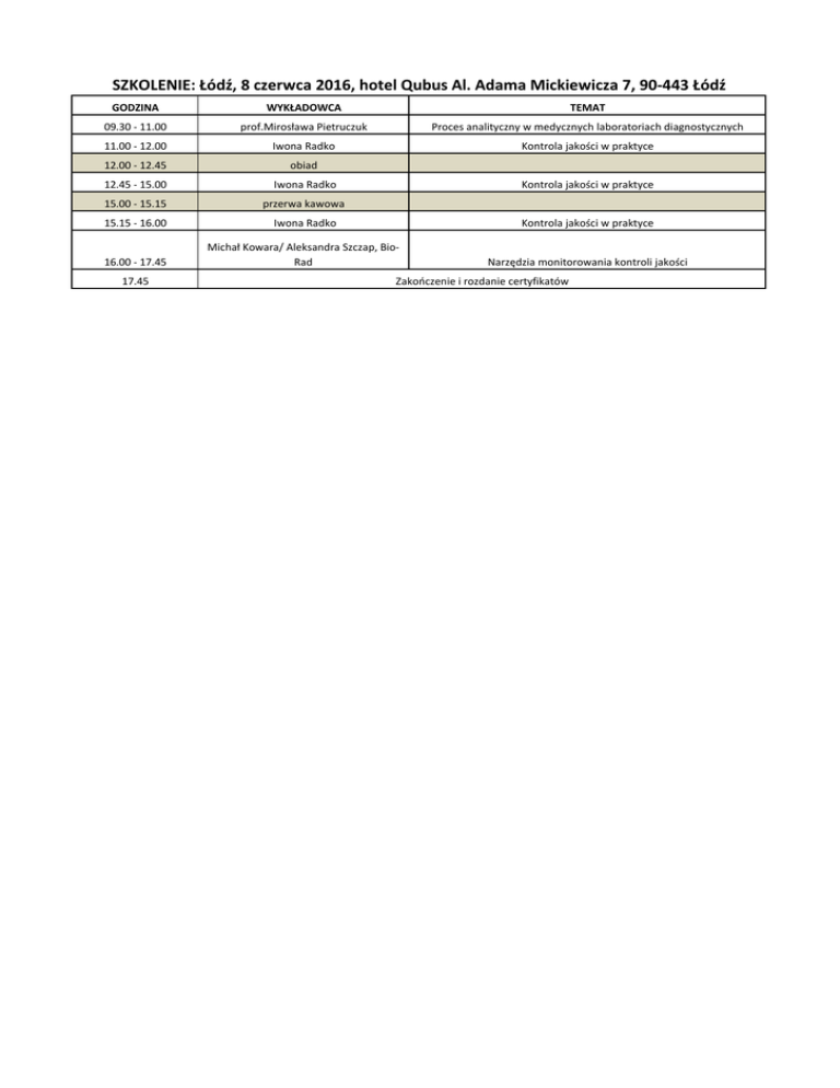 SZKOLENIE: Łódź, 8 czerwca 2016, hotel Qubus Al. Adama Mickiewicza 7, 90-443 Łódź GODZINA WYKŁADOWCA TEMAT 09.30 - 11.00 prof.Mirosława Pietruczuk Proces analityczny w medycznych laboratoriach diagnostycznych 11.00 - 12.00 Iwona Radko Kontrola jakości w praktyce 12.00 - 12.45 obiad 12.45 - 15.00 Iwona Radko 15.00 - 15.15 przerwa kawowa 15.15 - 16.00 Iwona Radko Kontrola jakości w praktyce 16.00 - 17.45 Michał Kowara/ Aleksandra Szczap, BioRad Narzędzia monitorowania kontroli jakości 17.45 Kontrola jakości w praktyce Zakończenie i rozdanie certyfikatów