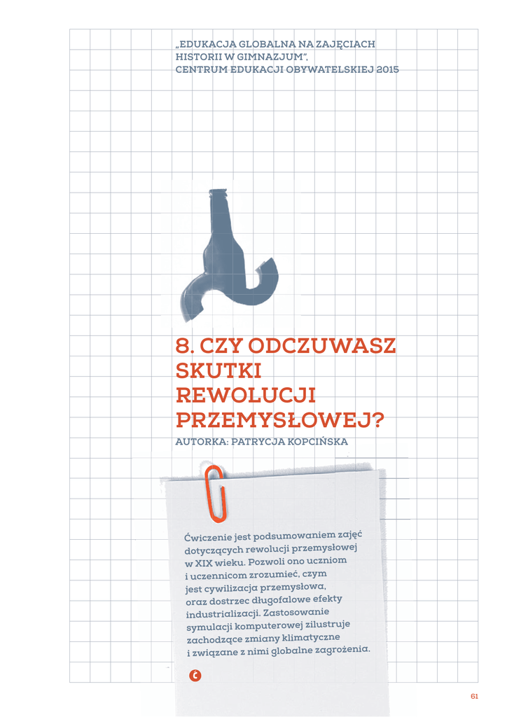 „EDUKACJA GLOBALNA NA ZAJĘCIACH HISTORII W GIMNAZJUM”, CENTRUM EDUKACJI OBYWATELSKIEJ 2015 8. CZY ODCZUWASZ SKUTKI REWOLUCJI PRZEMYSŁOWEJ? AUTORKA: PATRYCJA KOPCIŃSKA Ćwiczenie jest podsumowaniem zajęć dotyczących rewolucji przemysłowej w XIX wieku. Pozwoli ono uczniom i uczennicom zrozumieć, czym jest cywilizacja przemysłowa, oraz dostrzec długofalowe efekty industrializacji. Zastosowanie symulacji komputerowej zilustruje zachodzące zmiany klimatyczne i związane z nimi globalne zagrożenia. Õ 61 Zagadnienia: Zasoby naturalne Zrównoważony rozwój Zdrowie 8. CZY ODCZUWASZ SKUTKI REWOLUCJI PRZEMYSŁOWEJ? Czas trwania: 30 minut min 0 4 4 Cele ćwiczenia: Opiszesz pozytywne i negatywne skutki uprzemysłowienia. Poznasz znaczenie pojęć: cywilizacja przemysłowa, industrializacja, urbanizacja. Dostrzeżesz długofalowe efekty uprzemysłowienia w skali globalnej. Związek z podstawą programową: II, III, 31.1, 31.2, 31.3 Środki dydaktyczne i materiały: Rzutnik i komputer z dostępem do Internetu PRZEBIEG ĆWICZENIA: 1. Poproś uczennice i uczniów o wymienienie głównych wynalazków i gałęzi przemysłu dynamicznie rozwijających się od XIX wieku. Zapytaj o surowce, rynki zbytu, transport itp. Wprowadź terminy: cywilizacja przemysłowa, industrializacja i urbanizacja. 2. Narysuj na tablicy poniższą tabelkę i poproś młodzież o podanie skutków uprzemysłowienia. Zaproponuj, aby zrobiła to metodą kuli śniegowej. Najpierw uczniowie i uczennice powinni przedstawić sobie propozycje w parach, potem pary łączą się w czwórki, a na koniec w ósemki. Każda z ósemek ma ustalić wspólnie propozycje i zapisać je w tabeli na tablicy. 12 8 Jakie skutki niesie uprzemysłowienie? Skutki pozytywne Skutki negatywne 3. Podsumuj ćwiczenie, wskazując na najistotniejsze pozytywne skutki uprzemysłowienia. Pod- 15 3 kreśl, że industrializacja doprowadziła do zmian w środowisku już w XIX wieku. Wówczas odnotowywano wzrost zanieczyszczenia powietrza i wody, bardzo szybko zmniejszały się też powierzchnie lasów, masowo wycinanych na potrzeby przemysłu. Rozpoczęła się też ogromna eksploatacja nieodnawialnych zasobów naturalnych, w tym głównie węgla i ropy. Działalność człowieka i dalszy rozwój cywilizacji przemysłowej doprowadził do trwałych zmian klimatycznych na Ziemi. Do podsumowania możesz wykorzystać materiały zamieszczone w publikacji CEO „Lekcja z klimatem”, w szczególności propozycję „Wehikuł czasu”: http://bit.ly/lekcjazklimatem. 4. Upewnij się, czy młodzież dostrzega związki przyczynowo-skutkowe między rozwojem cy25 10 wilizacji przemysłowej a zmianami klimatycznymi, i następnie zaproponuj, aby przeprowadziła symulacyjne doświadczenie. Uruchom „Symulator zmian klimatu” i postępuj według jego wskazówek (http://ziemianarozdrozu.pl/symulator). Symulator zmian klimatu pomoże Ci dowiedzieć się i zrozumieć: problem wzrostu temperatury, emisji dwutlenku węgla, w jaki sposób uruchomione przez nas sprzężenia zwrotne wpłyną na zmianę klimatu. Zaprezentuje, jak może wyglądać przyszłość Ziemi, gdy temperatura będzie rosnąć o kolejne stopnie oraz co zrobić, by uniknąć katastrofy. 30 5 5. Zaproponuj młodzieży, aby w kilku zdaniach udzieliła pisemnej odpowiedzi na pytanie będące tytułem ćwiczenia: „Czy odczuwasz skutki rewolucji przemysłowej?”. 62 8. CZY ODCZUWASZ SKUTKI REWOLUCJI PRZEMYSŁOWEJ?