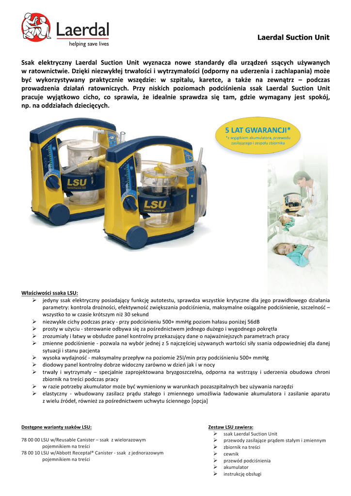 ! ! Laerdal Suction Unit !! ! ! ! Ssak% elektryczny% Laerdal% Suction% Unit% wyznacza% nowe% standardy% dla% urządzeń% ssących% używanych%% w%ratownictwie.%Dzięki%niezwykłej%trwałości%i%wytrzymałości%(odporny%na%uderzenia%i%zachlapania)%może% być% wykorzystywany% praktycznie% wszędzie:% w% szpitalu,% karetce,% a% także% na% zewnątrz% –% podczas% prowadzenia% działań% ratowniczych.% Przy% niskich% poziomach% podciśnienia% ssak% Laerdal% Suction% Unit% pracuje% wyjątkowo% cicho,% co% sprawia,% że% idealnie% sprawdza% się% tam,% gdzie% wymagany% jest% spokój,%% np.%na%oddziałach%dziecięcych.! ! ! ! ! ! ! ! ! ! ! ! ! ! ! ! % % % Ssak%z%jednorazowym%zbiornikiem% % % Ssak%z%wielorazowym%zbiornikiem% % % % % % Właściwości%ssaka%LSU:% ! jedyny!ssak!elektryczny!posiadający!funkcję!autotestu,!sprawdza!wszystkie!krytyczne!dla!jego!prawidłowego!działania! parametry:!kontrola!drożności,!efektywność!zwiększania!podciśnienia,!maksymalne!osiągalne!podciśnienie,!szczelność!–! wszystko!to!w!czasie!krótszym!niż!30!sekund! ! niezwykle!cichy!podczas!pracy!D!przy!podciśnieniu!500+!mmHg!poziom!hałasu!poniżej!56dB! ! prosty!w!użyciu!D!sterowanie!odbywa!się!za!pośrednictwem!jednego!dużego!i!wygodnego!pokrętła! ! zrozumiały!i!łatwy!w!obsłudze!panel!kontrolny!przekazujący!dane!o!najważniejszych!parametrach!pracy! ! zmienne!podciśnienie!D!pozwala!na!wybór!jednej!z!5!najczęściej!używanych!wartości!siły!ssania!odpowiedniej!dla!danej! sytuacji!i!stanu!pacjenta! ! wysoka!wydajność!D!maksymalny!przepływ!na!poziomie!25l/min!przy!podciśnieniu!500+!mmHg! ! diodowy!panel!kontrolny!dobrze!widoczny!zarówno!w!dzień!jak!i!w!nocy! ! trwały! i! wytrzymały! –! specjalnie! zaprojektowana! bryzgoszczelna,! odporna! na! wstrząsy! i! uderzenia! obudowa! chroni! zbiornik!na!treści!podczas!pracy! ! w!razie!potrzeby!akumulator!może!być!wymieniony!w!warunkach!pozaszpitalnych!bez!używania!narzędzi! ! elastyczny! D! wbudowany! zasilacz! prądu! stałego! i! zmiennego! umożliwia! ładowanie! akumulatora! i! zasilanie! aparatu!! z!wielu!źródeł,!również!za!pośrednictwem!uchwytu!ściennego![opcja]% % % % Dostępne%warianty%ssaków%LSU:% % 78!00!00!LSU!w/Reusable!Canister!–!ssak!!z!wielorazowym!! pojemnikiem!na!treści! 78!00!10!LSU!w/Abbott!Receptal®!Canister!D!ssak!!z!jednorazowym! pojemnikiem!na!treści! ! ! ! !!!!!Zestaw%LSU%zawiera:% ! ssak!Laerdal!Suction!Unit! ! przewody!zasilające!prądem!stałym!i!zmiennym! ! zbiornik!na!treści! ! cewnik! ! przewód!podciśnienia! ! akumulator! ! instrukcję!obsługi! ! ! ! ! Ssak%LSU%spełnia%normę%IP34D% %i%może%być%używany%nawet%podczas% ulewnego%deszczu%bez%ryzyka%awarii% Wygodne%i%duże%pokrętło,%dzięki% któremu%ssak%LSU%może%być% obsługiwany%nawet%w%grubych% rękawicach% Prosty'w'obsłudze'i'czytelny' panel'kontrolny' % % % % % % % % % % Materiały%zużywalne:% % Możliwość%zamocowania%ssaka% LSU%na%ścianie%–%mocowanie% ścienne%z%zasilaniem% 78!12!00!Aerosol!Filter!for!LSU!Reusable!Canister!–!filtr!do!ssaka!LSU!z!wielorazowym!pojemnikiem!! 78!12!01!Vacuum!Tube!for!LSU!Abbott!Canister!–!pojemnik!jednorazowy!do!ssaka!LSU! 77!04!61!Abbott!Disposable!Liner!–!wkładka!jednorazowa!do!ssaka!LSU!z!jednorazowym!pojemnikiem%% 78!10!02!kulka!zaworu!przelewowego!! Praktyczne%miejsce%na%zwinięcie% cewnika%skraca%czas% przygotowania%aparatu%do%pracy% Akcesoria%dostępne%do%ssaka%LSU:% % 78!12!02!High!Efficiency!Filtration!kit!for!LSU!Abbott!Canister!–!!zestaw!filtrujący!o!wysokiej!! ! wydajności!do!jednorazowego!pojemnika! 78!26!00!Wall!Bracket!w/DCDPower!Cord!D!mocowanie!ścienne!!z!zasilaniem!prądem!stałym! 78!26!20!Wall!Bracket!w/ACDPower!Cord!D!mocowanie!ścienne!!z!zasilaniem!prądem!zmiennym! 78!20!00!Carrying!Bag!D!torba!transportowa!miękka!! 78!23!00!Shoulder!Strap!D!pasek!na!ramię!z!zaczepami!! 78!24!00!Side!Pouch!D!torebka!boczna!! 78!04!40!External!Charge!kit!D!zewnętrzna!ładowarka!!akumulatora! Pomocne%ilustracje%przedstawiające% sposób%użytkowania%ssaka% zamieszczone%na%obudowie% Laerdal Medical Poland Sp. z o.o. ul. Hutnicza 6 40-241 Katowice tel. 32 493 70 20 fax 32 493 70 22 [email protected] Oddział Białystok tel. 85 874 21 52 [email protected] Oddział Poznań tel. 61 899 82 01 [email protected] Region Gdańsk tel. 601 29 09 17 [email protected] www.laerdal.pl ! Region Warszawa tel. 721 32 78 80 [email protected] Region Wrocław tel. 601 21 83 01 [email protected]