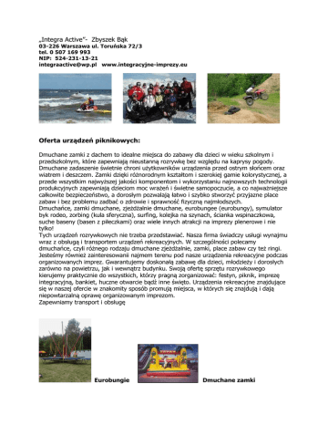 „Integra Active”- Zbyszek Bąk 03-226 Warszawa ul. Toruńska 72/3 tel. 0 507 169 993 NIP: 524-231-13-21 [email protected] www.integracyjne-imprezy.eu Oferta urządzeń piknikowych: Dmuchane zamki z dachem to idealne miejsca do zabawy dla dzieci w wieku szkolnym i przedszkolnym, które zapewniają nieustanną rozrywkę bez względu na kaprysy pogody. Dmuchane zadaszenie świetnie chroni użytkowników urządzenia przed ostrym słońcem oraz wiatrem i deszczem. Zamki dzięki różnorodnym kształtom i szerokiej gamie kolorystycznej, a przede wszystkim najwyższej jakości komponentom i wykorzystaniu najnowszych technologii produkcyjnych zapewniają dzieciom moc wrażeń i świetne samopoczucie, a co najważniejsze całkowite bezpieczeństwo, a dorosłym pozwalają łatwo i szybko stworzyć przyjazne place zabaw i bez problemu zadbać o zdrowie i sprawność fizyczną najmłodszych. Dmuchańce, zamki dmuchane, zjeżdżalnie dmuchane, eurobungee (eurobungy), symulator byk rodeo, zorbing (kula sferyczna), surfing, kolejka na szynach, ścianka wspinaczkowa, suche baseny (basen z piłeczkami) oraz wiele innych atrakcji na imprezy plenerowe i nie tylko! Tych urządzeń rozrywkowych nie trzeba przedstawiać. Nasza firma świadczy usługi wynajmu wraz z obsługą i transportem urządzeń rekreacyjnych. W szczególności polecamy dmuchańce, czyli różnego rodzaju dmuchane zjeżdżalnie, zamki, place zabaw czy też ringi. Jesteśmy również zainteresowanii najmem terenu pod nasze urządzenia rekreacyjne podczas organizowanych imprez. Gwarantujemy doskonałą zabawę dla dzieci, młodzieży i dorosłych zarówno na powietrzu, jak i wewnątrz budynku. Swoją ofertę sprzętu rozrywkowego kierujemy praktycznie do wszystkich, którzy pragną zorganizować: festyn, piknik, imprezę integracyjną, bankiet, huczne otwarcie bądź inne święto. Urządzenia rekreacyjne znajdujące się w naszej ofercie w znakomity sposób promują miejsca, w których się znajdują i dają niepowtarzalną oprawę organizowanym imprezom. Zapewniamy transport i obsługę Eurobungie Dmuchane zamki Piłkarzyki Symulator video 3D Statek piracki Gąsienica Zjeżdżalnie Trampoliny Maskotki Rodeo Ścianka wspinaczkowa Krowa do dojenia Sumo i wiele innych….