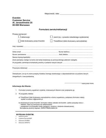 Miejscowość, data: ___________________________________ Eventim Customer Service Al. Jerozolimskie 25 00-508 Warszawa Formularz zwrotu/reklamacji Proszę zaznaczyć: reklamacja zwrot (np. z powodu odwołanego wydarzenia) bilet drukowany przez Eventim TicketDirect (bilet drukowany samodzielnie) Imię i nazwisko: .............................................................................................................................................................. ....................................................................................................................................................................................... Adres email: …………………………………………………………….. Numer telefonu:.................................................... Numer zamówienia: ………………………………………………..…… Ilość biletów:........................................................ Nazwa imprezy/spektaklu: ............................................................................................................................................. Zwrot pieniędzy nastąpi na konto (lub kartę kredytową) za pomocą którego płatność nastąpiła. W przypadku zamknięcia konta/karty prosimy o podanie nowych danych: ................................................................... ....................................................................................................................................................................................... Przyczyna reklamacji: ................................................................................................................................................... ....................................................................................................................................................................... Oświadczam, że są mi znane przepisy Kodeksu karnego skarbowego o odpowiedzialności za podanie danych niezgodnych z rzeczywistością. ______________________________ czytelny podpis Klienta Informacja dla Klienta: 1. Formularz prosimy wypełniać czytelnie, drukowanymi literami oraz podpisanie go. 2. W przypadku biletów: a) TicketDirect (bilet drukowany samodzielnie w domu) wypełniony, podpisany formularz należy wysłać na adres [email protected] b) drukowanych przez Evenitm: formularz należy odesłać do Eventim (adres powyżej) wraz z: - biletami, które są zwracane lub reklamowane; - paragonem (w przypadku braku paragonu, prosimy o złożenie oświadczenia). Na kopercie prosimy dopisać: ZWROT/REKLAMACJA WYPEŁNIA EVENTIM: 1. Kwota do zwrotu: 2. Customer Service/ZASP: 3. Dokonano STORNA: 4. Dokonano ZWROTU: