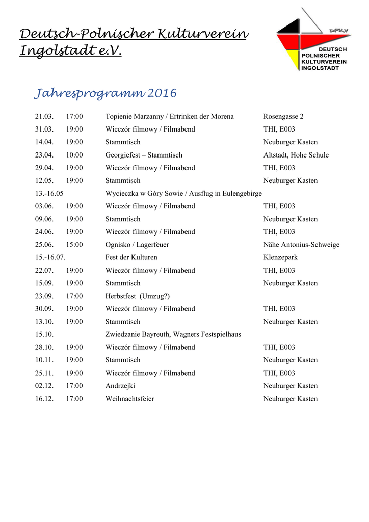 Deutsch-Polnischer Kulturverein Ingolstadt eV Jahresprogramm 2016