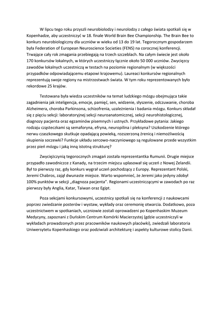 W lipcu tego roku przyszli neurobiolodzy i neurolodzy z całego świata spotkali się w Kopenhadze, aby uczestniczyć w 18. finale World Brain Bee Championship. The Brain Bee to konkurs neurobiologiczny dla uczniów w wieku od 13 do 19 lat. Tegorocznym gospodarzem była Federation of European Neuroscience Societies (FENS) na corocznej konferencji. Trwające cały rok zmagania przebiegają na trzech szczeblach. Na całym świecie jest około 170 konkursów lokalnych, w których uczestniczy łącznie około 50 000 uczniów. Zwycięzcy zawodów lokalnych uczestniczą w testach na poziomie regionalnym (w większości przypadków odpowiadającemu etapowi krajowemu). Laureaci konkursów regionalnych reprezentują swoje regiony na mistrzostwach świata. W tym roku reprezentowanych było rekordowe 25 krajów. Testowana była wiedza uczestników na temat ludzkiego mózgu obejmująca takie zagadnienia jak inteligencja, emocje, pamięć, sen, widzenie, słyszenie, odczuwanie, choroba Alzheimera, choroba Parkinsona, schizofrenia, uzależnienia i badania mózgu. Konkurs składał się z pięciu sekcji: laboratoryjnej sekcji neuroanatomicznej, sekcji neurohistologicznej, diagnozy pacjenta oraz egzaminów pisemnych i ustnych. Przykładowe pytania: Jakiego rodzaju cząsteczkami są semaforyna, efryna, neuropilina i pleksyna? Uszkodzenie którego nerwu czaszkowego skutkuje opadającą powieką, rozszerzoną źrenicą i niemożliwością skupienia soczewki? Funkcje układu sercowo-naczyniowego są regulowane przede wszystkim przez pień mózgu i jaką inną istotną strukturę? Zwyciężczynią tegorocznych zmagań została reprezentantka Rumunii. Drugie miejsce przypadło zawodniczce z Kanady, na trzecim miejscu uplasował się uczeń z Nowej Zelandii. Był to pierwszy raz, gdy konkurs wygrał uczeń pochodzący z Europy. Reprezentant Polski, Jeremi Chabros, zajął dwunaste miejsce. Warto wspomnieć, że Jeremi jako jedyny zdobył 100% punktów w sekcji „diagnoza pacjenta”. Regionami uczestniczącymi w zawodach po raz pierwszy były Anglia, Katar, Taiwan oraz Egipt. Poza sekcjami konkursowymi, uczestnicy spotkali się na konferencji z naukowcami poprzez zwiedzanie posterów i wystaw, wykłady oraz ceremonię otwarcia. Dodatkowo, poza uczestnictwem w spotkaniach, uczniowie zostali oprowadzeni po Kopenhaskim Muzeum Medycyny, zapoznani z Duńskim Centrum Komórki Macierzystej (gdzie uczestniczyli w wykładach prowadzonych przez pracowników naukowych placówki), zwiedzali laboratoria Uniwersytetu Kopenhaskiego oraz podziwiali architekturę i aspekty kulturowe stolicy Danii.