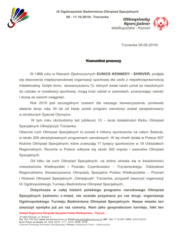 IX Ogólnopolski Badmintona Olimpiad Specjalnych 08 - 11.10.2015r. Trzcianka Trzcianka 28.09.2015r K Koom muunniikkaatt pprraassoow wyy W 1968 roku w Stanach Zjednoczonych EUNICE KENNEDY - SHRIVER, podjęła się stworzenia międzynarodowej organizacji sportowej dla osób z niepełnosprawnością intelektualną. Dzięki temu stowarzyszeniu Ci, których świat nauki uznał za niezdolnych do udziału w rywalizacji sportowej, mogą brać udział w zawodach, przeżywając radość i dumę ze swoich osiągnięć. Rok 2015 jest szczególnym czasem dla naszego stowarzyszenia, ponieważ właśnie teraz mija 30 lat od kiedy polski program narodowy został zarejestrowany w strukturach Special Olympics. W tym roku obchodzimy też jubileusz 15 – lecia działalności Klubu Olimpiad Specjalnych Olimpijczyk Trzcianka. Obecnie ruch Olimpiad Specjalnych to ponad 4 miliony sportowców na całym Świecie, w około 200 akredytowanych programach narodowych. W tej chwili działa w Polsce 507 Klubów Olimpiad Specjalnych, które zrzeszają 17 tysięcy sportowców w 18 Oddziałach Regionalnych. Rocznie w Polsce odbywa się około 300 imprez i zawodów Olimpiad Specjalnych. Od kilku lat ruch Olimpiad Specjalnych, na dobre utrwala się w świadomości mieszkańców Wielkopolski i Powiatu Czarnkowsko - Trzcianeckiego. Oddziałowi Regionalnemu Stowarzyszenia Olimpiady Specjalne Polska Wielkopolskie – Poznań i Klubowi Olimpiad Specjalnych „Olimpijczyk” Trzcianka, przypadł zaszczyt organizacji IX Ogólnopolskiego Turnieju Badmintona Olimpiad Specjalnych. Dotychczas w całej historii polskiego programu narodowego Olimpiad Specjalnych żadnemu z miast, nie została przyznana po raz drugi, organizacja Ogólnopolskiego Turnieju Badmintona Olimpiad Specjalnych. Nasze miasto ten zaszczyt spotyka już po raz czwarty. Nam jako gospodarzom turnieju, fakt ten Oddział Regionalny Olimpiady Specjalne Polska Wielkopolskie – Poznań; 61-663 Poznań, ul. Żniwna 1, Tel. 602 758 902; www.olimpiadypoznan.pl; Email:[email protected]; NIP 526 17 35 097; KRS: 0000190280 Bank Pekao nr konta: 62 1240 6218 1111 0010 6098 5706 Członek Polskiego Komitetu Olimpijskiego; Prezes: Katarzyna Frank – Niemczycka IX Ogólnopolski Badmintona Olimpiad Specjalnych 08 - 11.10.2015r. Trzcianka dostarcza wiele satysfakcji, ale jednocześnie stanowi zobowiązanie do podejmowania nowych wyzwań, zmierzających do zapewnienia profesjonalnej realizacji założeń ruchu Special Olympics. W turnieju weźmie udział 70 zawodników i 23 trenerów, reprezentujących 16 oddziałów regionalnych z całego kraju. Społeczną pracę w Komitecie Organizacyjnym podjęło kilkanaście osób, których wspomagać będzie 30 wolontariuszy. Nad sprawnym przebiegiem zawodów czuwać będą sędziowie z Polskiego Związku Badmintona. Patronat honorowy nad naszym turniejem przyjął Burmistrz Trzcianki Pan Krzysztof Czarnecki. Swój przyjazd na ceremonię otwarcia potwierdzili już Liderzy Zespołu Lombard – Grzegorz Stróżniak i Marta Cugier . W trakcie tej uroczystości przewidywane są również występy tancerzy z Wałeckiej Szkoły Tańca Towarzyskiego: „Astra-Luna“, występy artystów ze Szkoły Tańca Towarzyskiego: „Hajdasz“ oraz występ zespołu wokalnego z Gimnazjum nr 1 w Trzciance. Ceremonia Otwarcia IX Ogólnopolskiego Turnieju Badmintona Olimpiad Specjalnych, odbędzie się w dniu 8 października 2015r., w godzinach 20.00-21.30 w hali sportowo – widowiskowej w Trzciance, mieszczącej się na ul. Żeromskiego 28. Tuż przed Ceremonią Otwarcia o godzinie 19.00 rozpocznie się konferencja prasowa, na którą serdecznie Państwa zapraszamy. Więcej szczegółowych informacji związanych z przygotowaniem konferencji, ceremonią otwarcia i całym przebiegiem turnieju, możecie Państwo uzyskać od Pani Anny Marii Wyrzykowskiej – pełniącej funkcję Przewodniczącej Komitetu Organizacyjnego – tel 604-578-073 oraz Pani Natalii Nowak – Dyrektora Oddziału Regionalnego Wielkopolskie-Poznań Stowarzyszenia Olimpiady Specjalne Polska – tel 602-758-902 Prosimy także o kontakt z powyżej wymienionymi Osobami, w celu ustalenia dalszych szczegółów dotyczących umieszczenia w hali sportowo – widowiskowej w Trzciance, banerów reklamowych Redakcji/Czasopism, które Państwo reprezentujecie. Oddział Regionalny Olimpiady Specjalne Polska Wielkopolskie – Poznań; 61-663 Poznań, ul. Żniwna 1, Tel. 602 758 902; www.olimpiadypoznan.pl; Email:[email protected]; NIP 526 17 35 097; KRS: 0000190280 Bank Pekao nr konta: 62 1240 6218 1111 0010 6098 5706 Członek Polskiego Komitetu Olimpijskiego; Prezes: Katarzyna Frank – Niemczycka IX Ogólnopolski Badmintona Olimpiad Specjalnych 08 - 11.10.2015r. Trzcianka W imieniu niepełnosprawnych intelektualnie sportowców, zwracamy się z gorącą i serdeczną prośbą o wsparcie naszych działań organizacyjnych, przy realizacji tego szlachetnego przedsięwzięcia. Jesteśmy głęboko przekonani, że nasze wspólne działania przyczynią się do tego, że turniej ten stanowić będzie istotny komponent w rehabilitacji społecznej osób niepełnosprawnych intelektualnie, bowiem na zawodach Olimpiad Specjalnych, ludzie stają się sobie bliżsi, zapominają o różnicy wieku, wykształceniu, pełnionych rolach społecznych. Jednak najpiękniejszym obrazem sportowej rywalizacji jest widok radości, malujący się na twarzach zawodników. Tego się nie zapomina – to nawet chce się przeżyć. Z wyrazami szacunku Przemysław Przybylski /delegat techniczny turnieju/ Oddział Regionalny Olimpiady Specjalne Polska Wielkopolskie – Poznań; 61-663 Poznań, ul. Żniwna 1, Tel. 602 758 902; www.olimpiadypoznan.pl; Email:[email protected]; NIP 526 17 35 097; KRS: 0000190280 Bank Pekao nr konta: 62 1240 6218 1111 0010 6098 5706 Członek Polskiego Komitetu Olimpijskiego; Prezes: Katarzyna Frank – Niemczycka