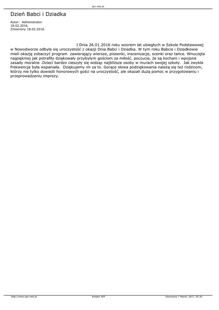 spn.nets.pl Dzień Babci i Dziadka Autor: Administrator 18.02.2016. Zmieniony 18.02.2016. I Dnia 26.01.2016 roku wzorem lat ubiegłych w Szkole Podstawowej w Nowodworze odbyła się uroczystość z okazji Dnia Babci i Dziadka. W tym roku Babcie i Dziadkowie mieli okazję zobaczyć program zawierający wiersze, piosenki, inscenizacje, scenki oraz tańce. Wnuczęta najpiękniej jak potrafiły dziękowały przybyłym gościom za miłość, poczucie, że są kochani i wpojone zasady moralne .Dzieci bardzo cieszyły się widząc najbliższe osoby w murach swojej szkoły. Jak zwykle frekwencja była wspaniała. Dziękujemy im za to. Gorące słowa podziękowania należą się też rodzicom, którzy nie tylko dowieźli honorowych gości na uroczystość, ale okazali dużą pomoc w przygotowaniu i przeprowadzeniu imprezy. http://www.spn.nets.pl Kreator PDF Utworzono 7 March, 2017, 05:30