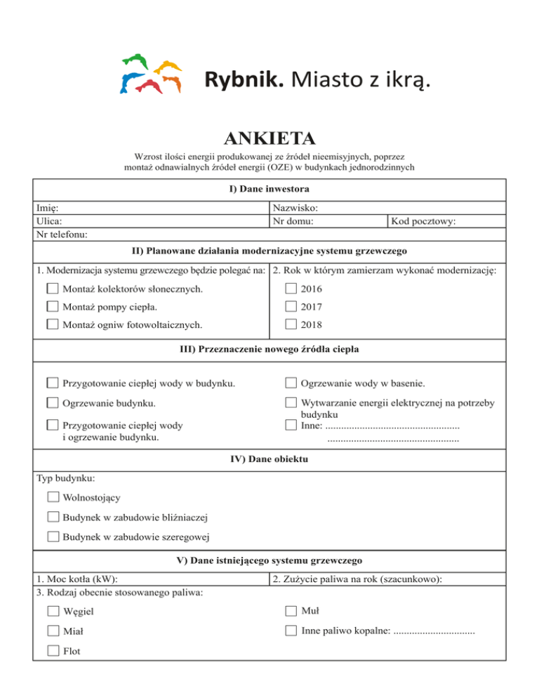 ANKIETA Wzrost ilości energii produkowanej ze źródeł nieemisyjnych, poprzez montaż odnawialnych źródeł energii (OZE) w budynkach jednorodzinnych I) Dane inwestora Imię: Ulica: Nr telefonu: Nazwisko: Nr domu: Kod pocztowy: II) Planowane działania modernizacyjne systemu grzewczego 1. Modernizacja systemu grzewczego będzie polegać na: 2. Rok w którym zamierzam wykonać modernizację: Montaż kolektorów słonecznych. 2016 Montaż pompy ciepła. 2017 Montaż ogniw fotowoltaicznych. 2018 III) Przeznaczenie nowego źródła ciepła Przygotowanie ciepłej wody w budynku. Ogrzewanie wody w basenie. Ogrzewanie budynku. Wytwarzanie energii elektrycznej na potrzeby budynku Inne: ................................................... .................................................. Przygotowanie ciepłej wody i ogrzewanie budynku. IV) Dane obiektu Typ budynku: Wolnostojący Budynek w zabudowie bliźniaczej Budynek w zabudowie szeregowej V) Dane istniejącego systemu grzewczego 1. Moc kotła (kW): 3. Rodzaj obecnie stosowanego paliwa: 2. Zużycie paliwa na rok (szacunkowo): Węgiel Muł Miał Inne paliwo kopalne: ............................... Flot 4. Aktualne zużycie energii elektrycznej na rok (kWh): 5. Obecny sposób przygotowania ciepłej wody użytkowej w budynku: Kocioł na paliwo stałe (cały rok) Inne: ................................................... .................................................. Bojler elektryczny (cały rok) .................................................. Kocioł na paliwo stałe w okresie zimowym, w okresie letnim przez bojler elektryczny VI) DEKLARUJĘ SWÓJ UDZIAŁ W PROJEKCIE WZROSTU ILOŚCI ENERGII PRODUKOWANEJ ZE ŹRÓDEŁ NIEEMISYJNYCH POPRZEZ MONTAŻ INSTALACJI ODNAWIALNYCH ŹRÓDEŁ ENERGII W BUDYNKACH JEDNORODZINNYCH. Data ................................... Podpis ................................... VII) Wyrażam zgodę na przetwarzanie moich danych osobowych zawartych w ankiecie na potrzeby określenia działań Urzędu Miasta Rybnika w zakresie wzrostu ilości energii produkowanej ze źródeł nieemisyjnych poprzez montaż instalacji OZE w budynkach jednorodzinnych. Dane osobowe wykorzystane będą zgodnie z ustawą o ochronie danych osobowych z dnia 29 sierpnia 1997 r (tekst jednolity Dz. U. z 2002 r. nr 101 poz. 926 ze zmianami) Data ................................... Podpis ................................... Objaśnienia do ankiety: W części I ankiety należy podać swoje dane osobowe wypełniając wykropkowane pola drukowanymi literami. W części II ankiety należy zaznaczyć krzyżyk przy odpowiedniej pozycji. Punkt 1 dotyczy informacji, o tym jaki rodzaj modernizacji systemu grzewczego chcieliby Państwo przeprowadzić w budynku. Do wyboru są: montaż kolektorów słonecznych, montaż pompy ciepła, montaż ogniw fotowoltaicznych. Punkt 2 W punkcie tym należy zakreślić rok, w którym chcieliby Państwo przeprowadzić modernizację systemu grzewczego. Część III W tej części ankiety należy podać informację o tym, jakim celom ma służyć modernizacja obiektu. Należy zwrócić uwagę, że kolektory słoneczne mogą być wykorzystywane do przygotowania ciepłej wody użytkowej lub/i wody w basenie, pompa ciepła do przygotowania ciepłej wody użytkowej i/lub ogrzewania budynku, zaś moduły fotowoltaiczne do wytwarzania energii elektrycznej. Część IV W części tej proszę o zakreślenie jednego z typów budynku, pozostawionych do wyboru. Część V ankiety dotyczy danych związanych z obecnym sposobem przygotowania ciepła do ogrzewania budynku oraz przygotowania ciepłej wody użytkowej. Punkt 1 W punkcie należy podać moc kotła (można odnaleźć na tabliczce znamionowej urządzenia). Punkt 2 Należy podać szacunkowe zużycie paliwa. Punkt 3 Należy wskazać rodzaj wykorzystywanego paliwa. Punkt 4 W punkcie należy podać ilość zużywanej energii elektrycznej w ciągu roku. Punkt należy wypełnić tylko w przypadku, kiedy w punkcie 2.1. zaznaczono montaż ogniw fotowoltaicznych. Punkt 5 W punkcie należy wskazać sposób przygotowania ciepłej wody użytkowej w budynku. W przypadku zaznaczenia „inny” bardzo proszę o wpisanie sposobu. Część VI oraz VII ankiety dotyczy deklaracji o udziale w projekcie wzrostu ilości energii produkowanej ze źródeł nieemisyjnych, poprzez montaż instalacji odnawialnych źródeł energii (OZE) w budynkach jednorodzinnych. W miejscach wykropkowanych należy wpisać datę oraz czytelnie się podpisać. Wypełnienie części VI oraz VII jest niezbędne i warunkuje chęć udziału składającego w programie. Wypełnioną ankietę należy złożyć w Kancelarii Urzędu Miasta Rybnika, ul. B. Chrobrego 2 lub wysłać listem na adres: Urząd Miasta Rybnika Wydział Ekologii, ul. B. Chrobrego 2, 44-200 Rybnik lub mailem na adres: [email protected] Ankietę należy dostarczyć do Urzędu Miasta we wskazany powyżej sposób w terminie do 30.09.2015 r. UWAGA. ANKIETA SKIEROWANA JEST DO MIESZKAŃCÓW, KTÓRZY OGRZEWANIE BUDYNKU LUB/I PRZYGOTOWANIE C.W.U. REALIZUJĄ PRZEZ KOTŁY NA PALIWO KOPALNE (WĘGIEL, MIAŁ, MUŁ, FLOT ITP.)