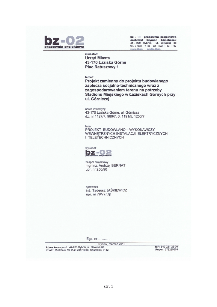 str. 1 ZAWARTOŚĆ TECZKI Strona tytułowa Zawartość teczki Opis projektu – część elektryczna Obliczenia techniczne – część elektryczna Opis projektu – część teletechniczna str.nr.1 str.nr.2 str.nr.3-6 str.nr.7 str.nr.8-22 ZAŁĄCZNIKI Zał.1.1. Warunki przyłączenia do sieci wydane przez VDP str.nr 23 CZĘŚĆ RYSUNKOWA Rys.nr.1 Rys.nr.2 Rys.nr.3 Rys.nr.4 Rys.nr.5 Rys.nr.6 Rys.nr.7 Rys.nr.8 Rys.nr.9 Rys.nr.10 Rys.nr.11 Rys.nr.12 Rys.nr.13 Plan zagospodarowania terenu Schemat ideowy instalacji elektrycznych Plan ułożenia bednarki - rzut fundamentów Plan inst. elektrycznych - rzut parteru Plan inst. elektrycznych - rzut piętra Plan instalacji odgromowej - rzut dachu Schemat ideowy tablicy TP Schemat ideowy rozdzielki RK Schemat ideowy połączeń sterownika Plan inst. niskonapięciowych - rzut parteru Plan inst. niskonapięciowych - rzut piętra Schemat ideowy instalacji sygnalizacji włamania Schemat ideowy szafy SBG str.nr.24 str.nr.25 str.nr.26 str.nr.27 str.nr.28 str.nr.29 str.nr.30 str.nr.31 str.nr.32 str.nr.33 str.nr.34 str.nr.35 str.nr.36 Informacja BIOZ Uwaga. Projekt związany: Projekt budowlano-wykonawczy zaplecza socjalno-technicznego wraz z zagospodarowaniem terenu na potrzeby Stadionu Miejskiego w Łaziskach Górnych część elektryczna - opracowany przez COMTAREX Biuro Sp z o.o. w Katowicach z grudnia 2008r. str. 2 2.OPIS TECHNICZNY 2.1.PODSTAWA OPRACOWANIA - Zlecenie Inwestora - Podkłady budowlane - Obowiązujące normy i przepisy przy projektowaniu instalacji elektrycznych w budownictwie ogólnym 2.2.ZAKRES PROJEKTU Niniejszy projekt obejmuje następujące instalacje: - oświetlenia podstawowego - oświetlenia ewakuacyjnego - gniazd wtyczkowych - siłową - odgromową - przepięciową - ochrony od porażeń elektrycznych 2.3.CHARAKTERYSTYKA OBIEKTU Obiekt wykonany jest metodą tradycyjną. Powierzchnia zabudowy wynosi 250 m2. Kubatura pomieszczeń budynku wynosi 1664 m3. 2.4.DANE ENERGETYCZNE Rodzaj przyłącza - kablowe Układ sieci: TN-C-S Napięcie zasilania - 400/230 V Moc zainstalowana: Pi = 55kW Moc maksymalna: Pm = 40kW Ochrona od porażeń - samoczynne wyłączenie 2.5.ZASILANIE I ROZDZIAŁ ENERGII ELEKTRYCZNEJ W pomieszczeniu szatni 07 na parterze zabudować tablicę wyłącznika pożarowego prądu T-WPP. Na parterze budynku w Korytarzu 01 zabudować tablicę główną TG. Od tablicy T-WPP do tablicy TG ułożyć kabel typu 4xYKY 35 mm/2 w rurze PCV 75. Z tablicy TG zasilić rozdzielkę RK w kotłowni oraz tablicę TP na piętrze budynku. Z tablicy TG zasilić wszystkie obwody w projektowanych pomieszczeniach na parterze a z tablicy TP zasilić obwody na piętrze budynku. Schemat ideowy przedstawiono na rys.nr 2. Uwaga. Zewnętrzny kabel zasilający typu YAKY 4x70 mm2 (ujęty w projekcie opracowanym przez COMTAREX Biuro Sp z o.o. w Katowicach z grudnia 2008r.) należy przedłużyć o 10 metrów stosując mufę kablową. 2.6.GŁÓWNY WYŁĄCZNIK PRĄDU Przycisk wyłącznika pożarowego prądu znajdować się będzie w komunikacji przy wejściu do budynku. Odłącza on całość instalacji elektrycznej wewnętrznej spod napięcia. Tablicę wyłącznika pożarowego prądu zabudować w szatni 07 na parterze budynku. Z tablicy T-WPP do wyłącznika WPP ułożyć kabel HDGs 3x1,5 mm2 pod tynkiem. Zastosować kabel o odporności ogniowej PH 90. str. 3 2.7.POMIAR ENERGII Pomiar energii elektrycznej nie jest objęty projektem. 2.8.INSTALACJE OŚWIETLENIA PODSTAWOWEGO Instalację oświetlenia podstawowego wykonać przewodem YDYżo 3(5)x1,5 mm2. Instalacje zasilić z tablic rozdzielczych. Przewody układać pod tynkiem. Zastosowano oprawy żarowe i świetlówkowe. Typy i rozmieszczenie opraw przedstawiono na planach sytuacyjnych. Natężenie oświetlenia przyjęto zgodnie z normą PN-EN 12464-1. Przyjęto następujące minimalne wartości natężenia oświetlenia: - korytarze - 100 lux - szatnie, umywalnie - 200 lux - sale, pokój sędziów - 300 lux 2.9.INSTALACJA GNIAZD WTYCZKOWYCH. Instalację gniazd wtyczkowych wykonać analogicznie do instalacji oświetlenia ogólnego. Zastosować przewód YDYżo 3x2,5 mm2. Gniazda wtyczkowe instalować w pod tynkiem. Gniazda umieścić na wysokosci 0,3 m nad podłogą.. 2.10. INSTALACJA OSWIETLENIA EWAKUACYJNEGO W obiekcie przewidziano oświetlenie ewakuacyjne. W oprawach oświetlenia podstawowego zabudować człony ewakuacyjne. Oprawy zasilić przewodem YDYżo 4(5)x1,5 mm2 pt. Załączanie opraw odbywać się będzie bezpośrednio po zaniku napięcia z własnych akumulatorów. Lokalizację projektowanych opraw przedstawiono na planie parteru Oprawy będą świecić 3 godziny od chwili zaniku napięcia. Natężenie oświetlenia nie będzie mniejsze niż 1 lux. Zastosować oprawy z autotestem. 2.11.INSTALACJA W KOTŁOWNI 2.11.1.ZASILANIE KOTŁOWNI Z projektowanej tablicy TG znajdującej się na parterze budynku należy wyprowadzić kabel typu YKYżo 5x4 mm2 zasilić nim projektowaną rozdzielkę RK w kotłowni. 2.11.2.INSTALACJE OŚWIETLENIA I GNIAZD WTYCZKOWYCH Dla oświetlenia pomieszczeń kotłowni należy wykonać obwód oświetleniowy. Zastosować przewód YDYżo 3x1,5 mm2. Przewód ułożyć pod tynkiem. Zastosować oprawy zgodnie z rys.nr.3. Wyłączniki instalować na wysokości 1,45 m od posadzki. Obwód gniazd wtyczkowych wykonać przewodem YDYżo 3x2,5 mm2. Gniazda instalować na wysokości 1 m od posadzki. Odległość gniazd wtyczkowych od rur CO i gazowych nie może być mniejsza od 0,6 m. 2.11.3.STEROWANIE UKŁADEM C.O. Do sterowania układem centralnego ogrzewania przewidziano sterownik Vitotronic. Sterownik umieścić w kotłowni w miejscu przedstawionym na planie sytuacyjnym. Część elektryczna obejmuje wykonanie zasilania regulatora i pomp. Sterowanie automatyczne odbywa się ze sterownika. str. 4 2.12.INSTALACJA PRZECIWPORAŻENIOWA Jako system ochrony przeciwporażeniowej (ochrona przed dotykiem pośrednim) zastosowano samoczynne wyłaczenie zasilania (PN-IEC 60364-4-41). Układ sieci: TN-C-