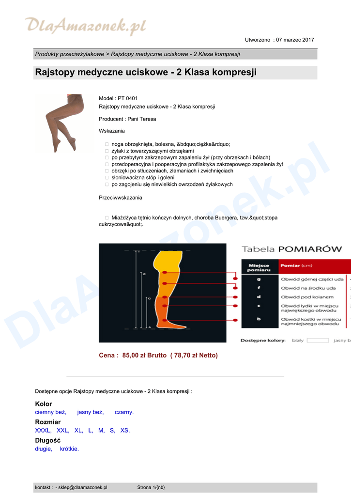 Utworzono : 07 marzec 2017 Produkty przeciwżylakowe > Rajstopy medyczne uciskowe - 2 Klasa kompresji Rajstopy medyczne uciskowe - 2 Klasa kompresji Model : PT 0401 Rajstopy medyczne uciskowe - 2 Klasa kompresji Producent : Pani Teresa Wskazania l p . k e � noga obrzęknięta, bolesna, „ciężka” � żylaki z towarzyszącymi obrzękami � po przebytym zakrzepowym zapaleniu żył (przy obrzękach i bólach) � przedoperacyjna i pooperacyjna profilaktyka zakrzepowego zapalenia żył � obrzęki po stłuczeniach, złamaniach i zwichnięciach � słoniowacizna stóp i goleni � po zagojeniu się niewielkich owrzodzeń żylakowych Przeciwwskazania n o z a � Miażdżyca tętnic kończyn dolnych, choroba Buergera, tzw."stopa cukrzycowa". m A a l D Cena : 85,00 zł Brutto ( 78,70 zł Netto) Dostępne opcje Rajstopy medyczne uciskowe - 2 Klasa kompresji : Kolor ciemny beż, jasny beż, czarny. Rozmiar XXXL, XXL, XL, L, M, S, XS. Długość długie, krótkie. kontakt : - [email protected] Strona 1/{nb} Utworzono : 07 marzec 2017 Produkty przeciwżylakowe > Rajstopy medyczne uciskowe - 2 Klasa kompresji Rajstopy medyczne uciskowe - 2 Klasa kompresji Dostępność: Produkt dostępny w naszym sklepie od 03 październik 2012 l p . k e m A a l D kontakt : - [email protected] n o z a Strona 2/{nb}