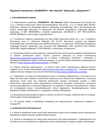 Regulamin Rywalizacji „HAMMERITE - Nie rdzewiej” (dalej jako: „Regulamin”) 1. POSTANOWIENIA OGÓLNE. 1.1. Organizatorem rywalizacji „HAMMERITE - Nie rdzewiej” (dalej: „Rywalizacja”) jest Axisnet Sp. z o.o. z siedzibą w Warszawie, adres do korespondencji: Axisnet Sp. z o.o.; ul. Pańska 98/1, 00-837, Warszawa, wpisana do Krajowego Rejestru Sądowego prowadzonego przez Sąd Rejonowy dla miasta stołecznego Warszawy w Warszawie, XII Wydział Gospodarczy Krajowego Rejestru Sądowego, nr KRS: 0000350045, o kapitale zakładowym: 218.500,00 zł, NIP: 769-218-99-38, REGON 100846231, zwana dalej „Organizatorem”. 1.2. Fundatorem nagród w Rywalizacji jest Akzo Nobel Decorative Paints Sp. z o.o. z siedzibą w Warszawie, przy ul. Wybrzeże Gdyńskie 6D, 01-531 Warszawa, wpisana do Rejestru Przedsiębiorców prowadzonego przez Sąd Rejonowy dla m. st. Warszawy, XII Wydział Gospodarczy Krajowego Rejestru Sądowego, pod numerem KRS 0000020951, NIP: 118-00-47-014, REGON: 010413361, kapitał zakładowy: 70 874 000,00 zł, zwana dalej „Fundatorem”. 1.3. Rywalizacja będzie przeprowadzona za pośrednictwem autoryzowanej aplikacji udostępnionej w serwisie Endomondo Sports Tracker („Serwis”), pobranej ze strony internetowej https://www.endomondo.com/download lub ze sklepu z aplikacjami mobilnymi . Informacje o Rywalizacji publikowane będą w serwisie Facebook, w ramach profilu Rywalizacji dostępnego pod adresem www.facebook.dom/HammeritePL („Fanpage”). 1.4. Wykaz systemów operacyjnych , na których może zostać zainstalowana aplikacja Serwisu znajduje się na stronie internetowej http://www.endomondo.com/features/ . Instrukcja działania aplikacji Serwisu znajduje się na stronie internetowej http://www.endomondo.com/help. 1.5. Organizator ma prawo do dokonywania zmian w niniejszym Regulaminie, o ile zmiany te nie będą naruszały praw nabytych uczestników Rywalizacji oraz istotnej treści Regulaminu. Przyczyną dokonania zmian może być wyłącznie konieczność korekty oczywistych omyłek, a także konieczność zapewnienia zasad sprawiedliwej konkurencji pomiędzy uczestnikami. Uczestnicy zostaną powiadomieni o zmianach Regulaminu z co najmniej 7-dniowym wyprzedzeniem i będzie im przysługiwało prawo niezaakceptowania zmian Regulaminu. Niezaakceptowanie zmian Regulaminu będzie równoznaczne z rezygnacją z udziału w Rywalizacji. 1.6. Rywalizacja przeprowadzona będzie w dniach od 2015-07-01 godz. 00.00 do 2015-07-14 godz. 23.59 („Okres Trwania Rywalizacji”). 1.7. Do wzięcia udziału w Rywalizacji niezbędne jest dysponowanie urządzeniem mobilnym z funkcją GPS. 2. UCZESTNICTWO W RYWALIZACJI. 2.1. Udział w Rywalizacji może wziąć każda pełnoletnia osoba fizyczna będąca przed rozpoczęciem Rywalizacji zarejestrowanym użytkownikiem Serwisu. 2.2. Udziału w Rywalizacji nie mogą wziąć pracownicy lub osoby powiązane z Organizatorem lub Fundatorem oraz członkowie ich najbliższych rodzin (małżonkowie, zstępni, wstępni, rodzeństwo). 3. NAGRODY. 3.1. Nagrody główne w Rywalizacji stanowią: 1) nagroda pierwszego stopnia (1 szt.) – Kamera GoPro Hero o łącznej wartości około 550 zł. 2) nagroda drugiego stopnia (1 szt.) – Ipod Shuffle o łącznej wartości około 250 zł. 3) nagroda trzeciego stopnia (1 szt.) – Plecak Salomon Trial o łącznej wartości około 180 zł. 4) nagrody czwartego stopnia za miejsca 4.-10. (7 szt.) Pendrive BODMAN 44036 8GB o wartości około 25zł każdy. 3.2. Nagrody w Rywalizacji nie podlegają zamianie na inne nagrody rzeczowe ani na ich równowartość pieniężną. 3.3 Nagrody w Rywalizacji zostaną przekazane zwycięzcom we wskazany poniżej przez Organizatora sposób i terminie. 4. ZASADY I PRZEBIEG RYWALIZACJI. 4.1. Udział w Rywalizacji wymaga spełnienia poniższych warunków: a) Dołączenie do Rywalizacji poprzez Serwis w Okresie Trwania Rywalizacji, b) Zaakceptowanie Regulaminu, c) Udzielenie zgody na przesyłanie informacji dotyczących Rywalizacji na adres e-mail udostępniony w Serwisie, d) Odbycie w Okresie Trwania Rywalizacji, treningów w następujących kategoriach sportowych: Kolarstwo, Kolarstwo górskie, Jazda na rowerze, Jazda na wózku inwalidzkim oraz zarejestrowanie tego treningu w aplikacji udostępnionej przez Serwis. 4.2. Trening musi być zarejestrowany przez uczestnika Rywalizacji z wykorzystaniem technologii GPS – treningi dodawane ręcznie nie będą brane pod uwagę w wynikach Rywalizacji. 4.3. Organizator zastrzega sobie prawo do odmowy wydania nagrody lub całkowitego usunięcia Uczestnika z Rywalizacji, w przypadku wykrycia prób oszustwa, w szczególności polegających na jeździe z włączoną aplikacją samochodem lub innym pojazdem mechanicznym o napędzie silnikowym (w tym wózkach inwalidzkich o napędzie silnikowym), używaniu jednego zarejestrowanego konta przez wiele osób, używaniu wielu zarejestrowanych kont przez jedną osobę oraz jeździe na innych niż rower lub wózek inwalidzki bez napędu silnikowego pojazdach mechanicznych. Może to nastąpić bez uprzedniej informacji oraz bez podania przyczyn i bez możliwości ponownego wzięcia udziału w danej Rywalizacji. 4.4. Podczas korzystania z usług Serwisu uczestnicy Rywalizacji są odpowiedzialni za wszelkie ryzyko związane z uprawianą aktywnością fizyczną, w szczególności Organizator, Fundator ani Serwis nie ponoszą odpowiedzialności za jakiekolwiek szkody na osobie lub mieniu powstałe w związku z udziałem uczestnika w Rywalizacji. 5. WYŁONIENIE ZWYCIĘZCÓW I PRZYZNANIE NAGRÓD. 5.1. Spośród wszystkich uczestników, którzy spełnili wymogi określone w ust. 4.1 oraz 4.2 Regulaminu i nie zostali wykluczeni z udziału w Rywalizacji, Organizator nagradza zwycięzców, którzy osiągnęli kolejno największą ilość przejechanych kilometrów łącznie w podanych dyscyplinach, przyznając im miejsca od 1 do 10. Liczbę kilometrów określa się na podstawie danych zarejestrowanych w ramac