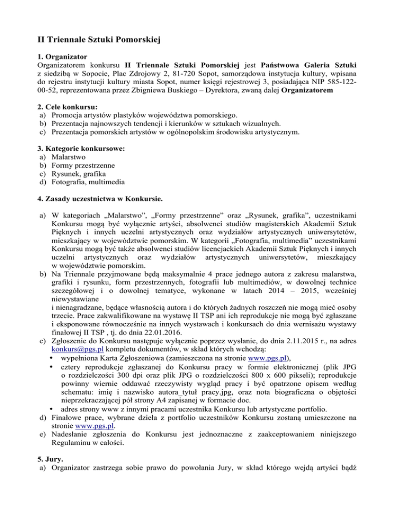 II Triennale Sztuki Pomorskiej 1. Organizator Organizatorem konkursu II Triennale Sztuki Pomorskiej jest Państwowa Galeria Sztuki z siedzibą w Sopocie, Plac Zdrojowy 2, 81-720 Sopot, samorządowa instytucja kultury, wpisana do rejestru instytucji kultury miasta Sopot, numer księgi rejestrowej 3, posiadająca NIP 585-12200-52, reprezentowana przez Zbigniewa Buskiego – Dyrektora, zwaną dalej Organizatorem 2. Cele konkursu: a) Promocja artystów plastyków województwa pomorskiego. b) Prezentacja najnowszych tendencji i kierunków w sztukach wizualnych. c) Prezentacja pomorskich artystów w ogólnopolskim środowisku artystycznym. 3. Kategorie konkursowe: a) Malarstwo b) Formy przestrzenne c) Rysunek, grafika d) Fotografia, multimedia 4. Zasady uczestnictwa w Konkursie. a) W kategoriach „Malarstwo”, „Formy przestrzenne” oraz „Rysunek, grafika”, uczestnikami Konkursu mogą być wyłącznie artyści, absolwenci studiów magisterskich Akademii Sztuk Pięknych i innych uczelni artystycznych oraz wydziałów artystycznych uniwersytetów, mieszkający w województwie pomorskim. W kategorii „Fotografia, multimedia” uczestnikami Konkursu mogą być także absolwenci studiów licencjackich Akademii Sztuk Pięknych i innych uczelni artystycznych oraz wydziałów artystycznych uniwersytetów, mieszkający w województwie pomorskim. b) Na Triennale przyjmowane będą maksymalnie 4 prace jednego autora z zakresu malarstwa, grafiki i rysunku, form przestrzennych, fotografii lub multimediów, w dowolnej technice szczegółowej i o dowolnej tematyce, wykonane w latach 2014 – 2015, wcześniej niewystawiane i nienagradzane, będące własnością autora i do których żadnych roszczeń nie mogą mieć osoby trzecie. Prace zakwalifikowane na wystawę II TSP ani ich reprodukcje nie mogą być zgłaszane i eksponowane równocześnie na innych wystawach i konkursach do dnia wernisażu wystawy finałowej II TSP , tj. do dnia 22.01.2016. c) Zgłoszenie do Konkursu następuje wyłącznie poprzez wysłanie, do dnia 2.11.2015 r., na adres [email protected] kompletu dokumentów, w skład których wchodzą: • wypełniona Karta Zgłoszeniowa (zamieszczona na stronie www.pgs.pl), • cztery reprodukcje zgłaszanej do Konkursu pracy w formie elektronicznej (plik JPG o rozdzielczości 300 dpi oraz plik JPG o rozdzielczości 800 x 600 pikseli); reprodukcje powinny wiernie oddawać rzeczywisty wygląd pracy i być opatrzone opisem według schematu: imię i nazwisko autora_tytuł pracy.jpg, oraz nota biograficzna o objętości nieprzekraczającej pół strony A4 zapisanej w formacie doc. • adres strony www z innymi pracami uczestnika Konkursu lub artystyczne portfolio. d) Finałowe prace, wybrane dzieła z portfolio uczestników Konkursu zostaną umieszczone na stronie www.pgs.pl. e) Nadesłanie zgłoszenia do Konkursu jest jednoznaczne z zaakceptowaniem niniejszego Regulaminu w całości. 5. Jury. a) Organizator zastrzega sobie prawo do powołania Jury, w skład którego wejdą artyści bądź krytycy sztuki, uznani w ogólnopolskim środowisku artystycznym. Jury ma zapewnioną całkowitą niezależność podejmowania decyzji; jego werdykt jest ostateczny, nie można go poddawać w wątpliwość ani się od niego odwoływać. Skład jury zostanie ustalony do 30 września 2015 r. b) Jury, na podstawie nadesłanych przez Uczestników drogą elektroniczną kompletów dokumentów, wyłoni do dnia 30.11.2015 roku finalistów Konkursu. c) Prace zakwalifikowane do finału zostaną zaprezentowane na stronie internetowej www.pgs.pl oraz na wystawie, której towarzyszyć będzie katalog, w wersji polsko-angielskiej. d) Finaliści prześlą Organizatorowi Konkursu oryginały prac do dnia 12.12.2015 r. na finał, który odbędzie się 22.01.2015 r. Spośród nadesłanych prac Jury wyłoni laureatów Konkursu. Organizator zastrzega sobie, że rozstrzygnięcie konkursu w poszczególnych kategoriach nastąpi w przypadku, gdy do udziału zgłosi się co najmniej dziesięciu artystów w poszczególnych kategoriach. 6. Nagrody. a) Nagrodą w każdej z czterech kategorii będzie indywidualna wystawa w PGS, w terminie między styczniem 2017 – grudniem 2018 wraz z 72 stronicowym katalogiem w jęz. polskim i angielskim. (W przypadku przyznania nagrody artyście, który w 2013 – 2015 r. wystawiał swoje prace w PGS na wystawie indywidualnej, zorganizowanie wystawy będzie możliwe po upływie 5 lat, od ostatniej prezentacji). b) Organizator dopuszcza możliwość przyznania nagrody Grand Prix Triennale (spośród laureatów 4 kategorii). c) Organizator będzie czynił starania o pozyskanie nagród finansowych ze strony MKiDN, Marszałka Województwa, Prezydentów Sopotu, Gdańska i Gdyni. 7. Harmonogram Konkursu. a) 1.10. - 2.11.2015 r. – nadsyłanie zgłoszeń na adres [email protected] b) Do 30.11.2015 r. - wybór finalistów Konkursu i publikacja ich nazwisk na stronie Konkursu c) 7.12.-11.12.2015 r. – dostarczenie przez uczestników oryginałów prac do siedziby Organizatora na adres: Państwowa Galeria Sztuki w Sopocie, Plac Zdrojowy 2, 81-720 Sopot. d) 22.01.2016 r. – ogłoszenie nazwisk laureatów Konkursu podczas wernisażu wystawy finałowej. 8. Postanowienia końcowe. a) Prace zgłoszone na Konkurs powinny być odpowiednio opisane przez autora - uczestnika Konkursu: imię i nazwisko autora, tytuł, rok powstania, technika i wartość oraz odpowiednio zabezpieczone do transportu. b) Uczestnicy Konkursu nadsyłają prace wybrane do finału na koszt własny i zobowiązani są do ich odebrania do 25.03.2016 r. Za prace nieodebrane w terminie pobierana będzie opłata magazynowa w kwocie 10 zł dziennie. c) Uczestnicy Konkursu wyrażają zgodę na publikację swoich nazwisk oraz na reprodukowanie zgłoszonej do Konkursu pracy w całości lub fragmencie na www.pgs.pl oraz w innych mediach, w ramach promocji Konkursu. d) Finaliści Konkursu zobowiązani są do udzielania wywiadów zainteresowanym mediom, ws