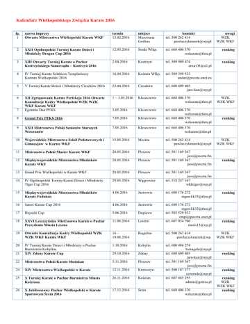Kalendarz Wielkopolskiego Związku Karate 2016 lp. 1 nazwa imprezy Otwarte Mistrzostwa Wielkopolski Karate WKF termin 13.02.2016 miejsce Murowana Goślina kontakt tel. 500 262 414 [email protected] uwagi WZK WZK WKF 2 XXII Ogólnopolski Turniej Karate Dzieci i Młodzieży Dragon Cup 2016 12.03.2016 Środa Wlkp. tel. 668 406 370 [email protected] ranking 3 XIII Otwarty Turniej Karate o Puchar Kostrzyńskiego Samorządu – Kostrzyn 2016 2.04.2016 Kostrzyn tel. 509 909 474 [email protected] ranking 4 IV Turniej Karate Szlakiem Templariuszy Koźmin Wielkopolski 2016 16.04.2016 Koźmin Wlkp. tel. 509 399 533 [email protected] 5 V Turniej Karate Dzieci i Młodzieży Cieszków 2016 23.04.2016 Cieszków tel. 608 609 405 [email protected] 6 1 – 3.05.2016 Kleszczewo tel. 668 406 370 [email protected] 7 XII Zgrupowanie Karate Perfekcja 2016 Otwarte Konsultacje Kadry Wielkopolski WZK WZK WKF Karate WKF Egzamin Dan PFKS 3.05.2016 Kleszczewo 8 Grand Prix PFKS 2016 7.05.2016 Kleszczewo tel. 668 406 370 [email protected] tel. 668 406 370 [email protected] 9 XXII Mistrzostwa Polski Seniorów Starszych Weteranów 7.05.2016 Kleszczewo tel. 668 406 370 [email protected] 10 Wojewódzkie Mistrzostwa Szkół Podstawowych i Gimnazjów w Karate WKF 15.05.2016 Mosina tel. 500 262 414 [email protected] 11 Mistrzostwa Polski Master Karate WKF 28.05.2016 Pleszew 12 Międzywojewódzkie Mistrzostwa Młodzików Karate WKF 28.05.2016 Pleszew tel. 501 169 367 [email protected] tel. 501 169 367 [email protected] 13 Grand Prix Wielkopolski w Karate WKF 28.05.2016 Pleszew 14 IV Ogólnopolski Turniej Karate Dzieci i Młodzieży Tiger Cup 2016 29.05.2016 Wągrowiec 15 Międzywojewódzkie Mistrzostwa Młodzików Karate Fudokan 4.06.2016 Jastrowie tel. 608 176 272 [email protected] 16 Satori Karate Cup 2016 4.06.2016 Jastrowie 17 Hayashi Cup 5.06.2016 Dopiewo 18 XXVI Leszczyńskie Mistrzostwa Karate o Puchar Prezydenta Miasta Leszna 11.06.2016 Leszno tel. 608 176 272 [email protected] tel. 503 529 933 [email protected] tel. 607 034 706 [email protected] 19 Otwarte Konsultacje Kadry Wielkopolski WZK WZK WKF Karate WKF 16 – 19.08.2016 Rogoźno tel. 500 262 414 pawlaczykmarek@wp. 20 1.10.2016 Kobylin 21 IV Turniej Karate Dzieci i Młodzieży o Puchar Burmistrza Kobylina XIV Zduny Karate Cup 29.10.2016 Zduny 22 Mistrzostwa Polski Karate Shotokan 5.11.2016 Pleszew 24 XIV Mistrzostwa Wielkopolski w Karate 12.11.2016 Krotoszyn 25 X Turniej Karate o Puchar Burmistrza Miasta Kościana 26.11.2016 Kościan tel. 600 486 274 [email protected] tel. 608 609 405 [email protected] tel. 501 169 367 [email protected] tel. 500 187 377 [email protected] tel. 607 665 295 [email protected] 26 X Jubileuszowy Puchar Wielkopolski w Karate Sportowym Śrem 2016 17.12.2016 Śrem WZK WZK WKF ranking WZK WZK WKF ranking tel. 501 169 367 [email protected] tel. 518 247 167 [email protected] tel. 668 406 370 [email protected] ranking ranking WZK WZK WKF ranking ranking ranking WZK WZK WKF ranking