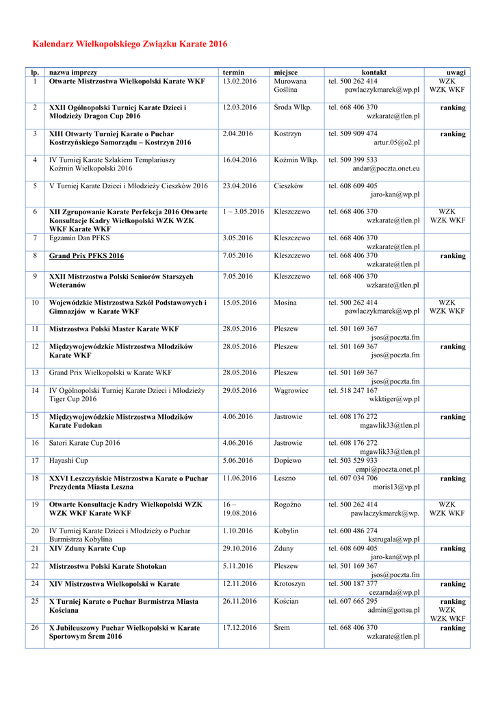 Kalendarz Wielkopolskiego Związku Karate 2016