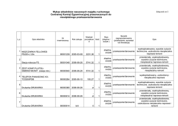 Wykaz składników rzeczowych majątku ruchomego Centralnej Komisji Egzaminacyjnej przeznaczonych do nieodpłatnego przekazania/darowania L.p Opis składnika 1 NISZCZARKA FELLOWES PS220-c 3,9x Nr inwentarzowy 90001239 Rok zakupu 2005-03-08 Wartość początkow Ilość a 2231,38 1 2 Stacja robocza FS 3 ZEST.KOMP.FUJITSUSIMENS+MONIT (stacja rob.) 4 TELEFON PANASONIC KXTCD200PDB 90001048 90000940 90000284 2008-08-26 2008-08-26 90000385 193,27 2008-08-26 zł 2008-08-26 zł 6 Drukarka-DRUKARKA 90000614 5741,32 2005-06-10 5 Drukarka-DRUKARKA 5741,32 1 1 1 1 1 Stan (zbędne / zużyte ) Załącznik nr 2 Sposób zagospodarowania (przekazanie, sprzedaż lub likwidacja) zbędna, przekazanie/darowanie zużyta wyeksploatowana, wysokie zużycie techniczne, uszkodzona nieopłacalna naprawa-remont zbędna, przekazanie/darowanie zużyta przestarzały, wyeksploatowany, wysokie zużycie techniczne, nieopłacalna naprawa-remont zbędny, przekazanie/darowanie zużyty przestarzały, wyeksploatowany, wysokie zużycie techniczne, nieopłacalny remont zbędny, przekazanie/darowanie zużyty wyeksploatowany, uszkodzonynieopłacalna naprawa zbędna, przekazanie/darowanie zużyta wyeksploatowana, wysokie zużycie techniczne, uszkodzona nieopłacalna naprawa-remont zbędny, przekazanie/darowanie zużyty zbędna, przekazanie/darowanie zużyta 7 Drukarka-DRUKARKA 90000614 b/d 0 1 Opis przestarzały, wyeksploatowany, wysokie zużycie techniczne, nieopłacalna naprawa-remont przestarzała, wyeksploatowana, wysokie zużycie techniczne, uszkodzona nieopłacalna naprawa i remont zbędna, przekazanie/darowanie zużyta 8 Drukarka-DRUKARKA 90001780 b/d 0 1 przestarzała, wyeksploatowana, wysokie zużycie techniczne, uszkodzona nieopłacalna naprawa i remont Uwagi: Wszystkie komputery, stacje robocze posiadają wymontowany dysk HDD (brak systemu operacyjnego), w niektórych brakuje pamięci RAM oraz napędu CD