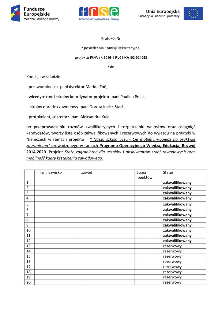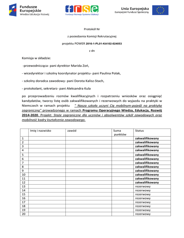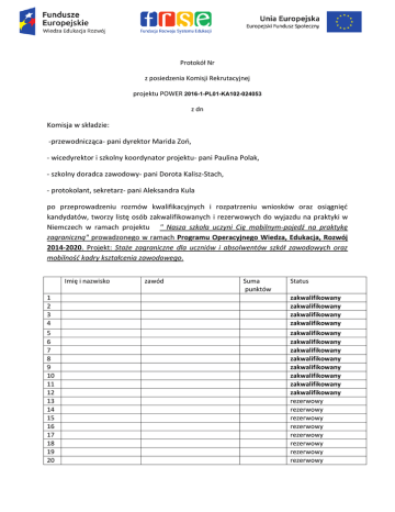 Protokół Nr z posiedzenia Komisji Rekrutacyjnej projektu POWER 2016-1-PL01-KA102-024053 z dn Komisja w składzie: -przewodnicząca- pani dyrektor Marida Zoń, - wicedyrektor i szkolny koordynator projektu- pani Paulina Polak, - szkolny doradca zawodowy- pani Dorota Kalisz-Stach, - protokolant, sekretarz- pani Aleksandra Kula po przeprowadzeniu rozmów kwalifikacyjnych i rozpatrzeniu wniosków oraz osiągnięć kandydatów, tworzy listę osób zakwalifikowanych i rezerwowych do wyjazdu na praktyki w Niemczech w ramach projektu " Nasza szkoła uczyni Cię mobilnym-pojedź na praktykę zagraniczną" prowadzonego w ramach Programu Operacyjnego Wiedza, Edukacja, Rozwój 2014-2020. Projekt: Staże zagraniczne dla uczniów i absolwentów szkół zawodowych oraz mobilność kadry kształcenia zawodowego. Imię i nazwisko 1 2 3 4 5 6 7 8 9 10 11 12 13 14 15 16 17 18 19 20 zawód Suma punktów Status zakwalifikowany zakwalifikowany zakwalifikowany zakwalifikowany zakwalifikowany zakwalifikowany zakwalifikowany zakwalifikowany zakwalifikowany zakwalifikowany zakwalifikowany zakwalifikowany rezerwowy rezerwowy rezerwowy rezerwowy rezerwowy rezerwowy rezerwowy rezerwowy Załączniki do niniejszego protokołu stanowią: 1. Formularze zgłoszeniowe uczniów część A i B 2. Formularze z przeprowadzonych rozmów kwalifikacyjnych Komisja rekrutacyjna: Marida Zoń.......................................................................................... Paulina Polak....................................................................................... Dorota Kalisz Stach ............................................................................. Paulina Glanowska .............................................................................. Aleksandra Kula ..................................................................................