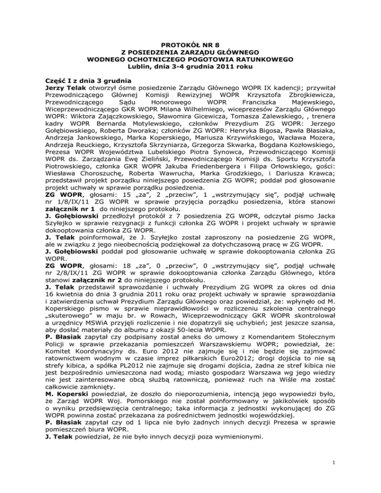 PROTOKÓŁ NR 8 Z POSIEDZENIA ZARZĄDU GŁÓWNEGO WODNEGO OCHOTNICZEGO POGOTOWIA RATUNKOWEGO Lublin, dnia 3-4 grudnia 2011 roku Część I z dnia 3 grudnia Jerzy Telak otworzył ósme posiedzenie Zarządu Głównego WOPR IX kadencji; przywitał Przewodniczącego Głównej Komisji Rewizyjnej WOPR Krzysztofa Zbrojkiewicza, Przewodniczącego Sądu Honorowego WOPR Franciszka Majewskiego, Wiceprzewodniczącego GKR WOPR Milana Wilhelmiego, wiceprezesów Zarządu Głównego WOPR: Wiktora Zajączkowskiego, Sławomira Gicewicza, Tomasza Zalewskiego, , trenera kadry WOPR Bernarda Motylewskiego, członków Prezydium ZG WOPR: Jerzego Gołębiowskiego, Roberta Dworaka; członków ZG WOPR: Henryka Bigosa, Pawła Błasiaka, Andrzeja Jankowskiego, Marka Koperskiego, Mariusza Krzywińskiego, Wacława Mozera, Andrzeja Reuckiego, Krzysztofa Skrzyniarza, Grzegorza Skwarka, Bogdana Kozłowskiego, Prezesa WOPR Województwa Lubelskiego Piotra Synowca, Przewodniczącego Komisji WOPR ds. Zarządzania Ewę Zieliński, Przewodniczącego Komisji ds. Sportu Krzysztofa Piotrowskiego, członka GKR WOPR Jakuba Friedenbergera i Filipa Orłowskiego, gości: Wiesława Choroszuchę, Roberta Wawrucha, Marka Grodzkiego, i Dariusza Krawca; przedstawił projekt porządku niniejszego posiedzenia ZG WOPR; poddał pod głosowanie projekt uchwały w sprawie porządku posiedzenia. ZG WOPR, głosami: 15 „za”, 2 „przeciw”, 1 „wstrzymujący się”, podjął uchwałę nr 1/8/IX/11 ZG WOPR w sprawie przyjęcia porządku posiedzenia, która stanowi załącznik nr 1 do niniejszego protokołu. J. Gołębiowski przedłożył protokół z 7 posiedzenia ZG WOPR, odczytał pismo Jacka Szyłejko w sprawie rezygnacji z funkcji członka ZG WOPR i projekt uchwały w sprawie dokooptowania członka ZG WOPR. J. Telak poinformował, że J. Szyłejko został zaproszony na posiedzenie ZG WOPR, ale w związku z jego nieobecnością podziękował za dotychczasową pracę w ZG WOPR. J. Gołębiowski poddał pod głosowanie uchwałę w sprawie dokooptowania członka ZG WOPR. ZG WOPR, głosami: 18 „za”, 0 „przeciw”, 0 „wstrzymujący się”, podjął uchwałę nr 2/8/IX/11 ZG WOPR w sprawie dokooptowania członka Zarządu Głównego, która stanowi załącznik nr 2 do niniejszego protokołu. J. Telak przedstawił sprawozdanie i uchwały Prezydium ZG WOPR za okres od dnia 16 kwietnia do dnia 3 grudnia 2011 roku oraz projekt uchwały w sprawie sprawozdania i zatwierdzenia uchwał Prezydium Zarządu Głównego oraz powiedział, że: wpłynęło od M. Koperskiego pismo w sprawie nieprawidłowości w rozliczeniu szkolenia centralnego „skuterowego” w maju br. w Rowach, Wiceprzewodniczący GKR WOPR skontrolował a urzędnicy MSWiA przyjęli rozliczenie i nie dopatrzyli się uchybień; jest jeszcze szansa, aby dosłać materiały do albumu z okazji 50-lecia WOPR. P. Błasiak zapytał czy podpisany został aneks do umowy z Komendantem Stołecznym Policji w sprawie przekazania pomieszczeń Warszawskiemu WOPR; powiedział, że: Komitet Koordynacyjny ds. Euro 2012 nie zajmuje się i nie będzie się zajmować ratownictwem wodnym w czasie imprez piłkarskich Euro2012; drogi dojścia to nie są strefy kibica, a spółka PL2012 nie zajmuje się drogami dojścia, żadna ze stref kibica nie jest bezpośrednio umieszczona nad wodą; miasto gospodarz Warszawa wg jego wiedzy nie jest zainteresowane obcą służbą ratowniczą, ponieważ ruch na Wiśle ma zostać całkowicie zamknięty. M. Koperski powiedział, że doszło do nieporozumienia, intencją jego wypowiedzi było, że Zarząd WOPR Woj. Pomorskiego nie został poinformowany w jakikolwiek sposób o wyniku przedsięwzięcia centralnego; taka informacja z jednostki wykonującej do ZG WOPR powinna zostać przekazana za pośrednictwem jednostki wojewódzkiej. P. Błasiak zapytał czy od 1 lipca nie było żadnych innych decyzji Prezesa w sprawie pomieszczeń biura WOPR. J. Telak powiedział, że nie było innych decyzji poza wymienionymi. 1 K. Skrzyniarz powiedział, że jest to kwestia bardziej formalna, Zarząd nie może aprobować decyzji Prezesa nie znając ich; zapytał czy oprócz zrelacjonowanych zostały podjęte jeszcze jakieś inne decyzje Prezesa WOPR. J. Telak powiedział, że: przedstawił wszystkie decyzje Prezesa, są one transparentne i zamieszczone na stronie internetowej WOPR; wszystkie jednostki WOPR w Warszawie powinny być w jednym miejscu i tak jest; poddaje pod głosowanie uchwałę w sprawie sprawozdania i zatwierdzenia uchwał Prezydium ZG WOPR. ZG WOPR, głosami: 17 „za”, 0 „przeciw”, 2 „wstrzymujący się”, podjął uchwałę nr 3/8/IX/11 ZG WOPR w sprawie sprawozdania i zatwierdzenia uchwał Prezydium Zarządu Głównego, która stanowi załącznik nr 3 do niniejszego protokołu. W. Zajączkowski powiedział, że: WOPR przygotował i przekazał do MSWiA projekty 4 rozporządzeń, przekazany krótko po tym terminie przez MSWiA do konsultacji społecznej materiał nie uwzględniał projektów WOPR; wraz z zespołem zebrał od członków WOPR uwagi do projektów MSWiA; Konwent Marszałków Województw RP odesłał bez opinii projekt do MSWiA; w przyszłym tygodniu planowane jest spotkanie z przedstawicielem Ministerstwa Sportu i Turystyki w sprawie projektu; prosi o przekazanie ewentualnych uwag do rozporządzenia MSWiA lub projektów rozporządzeń WOPR, opublikowanych na stronie internetowej WOPR, do Śląskiego WOPR; zmiana prawa wymusza zmiany w Statucie WOPR, wraz z zespołem rozpoczął prace nad projektem zmian, z jednostek WOPR otrzymał uwagi jedynie od P. Błasiaka; prosi o dalsze wnioski; należy rozważyć dodatkowe posiedzenie ZG WOPR z udziałem prawnika w sprawie zmian w Statucie WOPR. T. Zalewski przedstawił odpowiedź MSWiA do zgłoszonych przez WOPR i Konwent Marszałów uwag, wiele z nich zostało uwzględnionych, część odrzucono jako niezgodne z Konstytucją ze względu na wykroczenie poza kompetencje. E. Zielinski przedstawiła sprawozdan