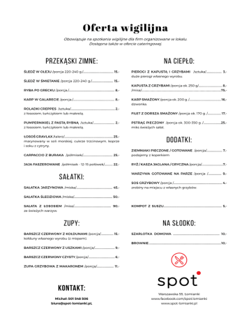 Oferta wigilijna Obowiązuje na spotkania wigilijne dla firm organizowane w lokalu. Dostępna także w ofercie cateringowej. Przekąski zimne: na ciepło: ŚLEDŹ W OLEJU /porcja 220-240 g./......................................... 15,- PIEROGI Z KAPUSTĄ I GRZYBAMI /sztuka/..................... 3,duże pierogi własnego wyrobu. ŚLEDŹ W ŚMIETANIE /porcja 220-240 g./............................. 15,RYBA PO GRECKU /porcja./.............................................................. 8,KARP W GALARECIE /porcja./........................................................ 8,ROLADKI CREPPES /sztuka/............................................................ 2,z łososiem, tuńczykiem lub makrelą. KAPUSTA Z GRZYBAMI /porcja ok. 250 g/................................ 8,/misa/.....................................................................................................75,KARP SMAŻONY /porcja ok. 200 g. /........................................... 16,dzwonka. FILET Z DORSZA SMAŻONY /porcja ok. 170 g. /.................. 17,- PUMPERNIKIEL Z PASTĄ RYBNĄ /sztuka/............................. 2,- PSTRĄG PIECZONY /porcja ok. 300-350 g. /........................25,- z łososiem, tuńczykiem lub makrelą. miks świeżych sałat. ŁOSOŚ GRAVLAX /talerz/.................................................................. 25,marynowany w soli morskiej, cukrze trzcinowym, koprze i soku z cytryny. dodatki: CARPACCIO Z BURAKA /półmisek/........................................ 25,- ZIEMNIAKI PIECZONE / GOTOWANE /porcja/..................... 7,podajemy z koperkiem JAJA FASZEROWANE /półmisek - 12-15 połówek/........... 22,- RYŻ / KASZA JAGLANA / GRYCZNA /porcja/.............................7,- Sałatki: WARZYWA GOTOWANE NA PARZE /porcja /.................. 9,- SAŁATKA JARZYNOWA /miska/................................................. 45,- SOS GRZYBOWY /porcja /.................................................................. 4.zrobiny na miejscu z własnych grzybów. SAŁATKA ŚLEDZIOWA /miska/.................................................... 50,SAŁATA Z ŁOSOSIEM /misa/.................................................. 90,ze świeżych warzyw. KOMPOT Z SUSZU............................................................................... 5,- zupy: na słodko: BARSZCZ CZERWONY Z KOŁDUNAMI /porcja/................. 15,kołduny własnego wyrobu (z mięsem). SZARLOTKA DOMOWA ............................................................... 10,BROWNIE .................................................................................................. 10,- BARSZCZ CZERWONY Z USZKAMI /porcja/........................... 9,BARSZCZ CZERWONY CZYSTY /porcja/.................................... 6,ZUPA GRZYBOWA Z MAKARONEM /porcja/....................... 11,- kontakt: Michał: 501 548 506 [email protected] Warszawska 55, Łomianki www.facebook.com/spot.lomianki www.spot-lomianki.pl Oferta wigilijna Przykładowe zestawy menu wigilijnego na spotkania dla firm organizowane w lokalu zestaw 1 ŚLEDŹ W OLEJU BARSZCZ CZERWONY CZYSTY SZARLOTKA DOMOWA SAŁATKA JARZYNOWA PIEROGI Z KAPUSTĄ I GRZYBAMI Nasza produkcja. KOMPOT Z SUSZU RYBA PO GRECKU KAPUSTA Z GRZYBAMI 55/osobę zestaw 2 ŚLEDŹ W OLEJU lub ŚLEDŹ W ŚMIETANIE BARSZCZ CZERWONY Z USZKAMI lub GRZYBOWA Z MAKARONEM SAŁATKA JARZYNOWA lub SAŁATKA ŚLEDZIOWA PIEROGI Z KAPUSTĄ I GRZYBAMI Nasza produkcja. RYBA PO GRECKU KAPUSTA Z GRZYBAMI ROLADKI CREPPES Z ŁOSOSIEM KARP SMAŻONY / dzwonka / lub FILET Z DORSZA SMAŻONY SZARLOTKA DOMOWA KOMPOT Z SUSZU 80/osobę zestaw 3 JAJA FASZEROWANE BARSZCZ CZERWONY Z KOŁDUNAMI lub GRZYBOWA Z MAKARONEM SZARLOTKA DOMOWA lub BROWNIE SAŁATKA JARZYNOWA lub SAŁATKA ŚLEDZIOWA lub SAŁATA Z ŁOSOSIEM PIEROGI Z KAPUSTĄ I GRZYBAMI Nasza produkcja. KOMPOT Z SUSZU KARP W GALARECIE KAPUSTA Z GRZYBAMI ŁOSOŚ GRAVLAX PSTRĄG SMAŻONY 96 /osobę