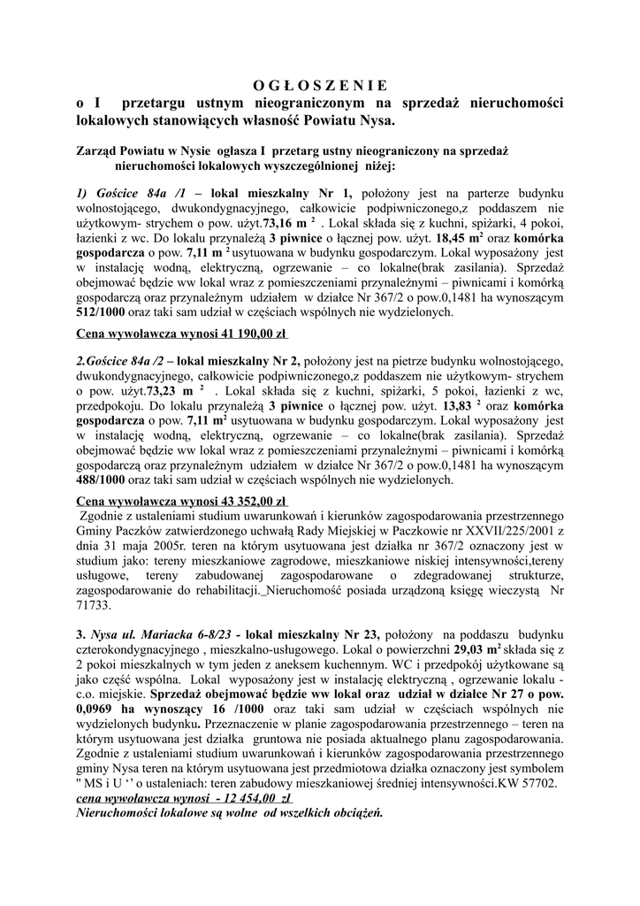 OGŁOSZENIE o I przetargu ustnym nieograniczonym na sprzedaż nieruchomości lokalowych stanowiących własność Powiatu Nysa. Zarząd Powiatu w Nysie ogłasza I przetarg ustny nieograniczony na sprzedaż nieruchomości lokalowych wyszczególnionej niżej: 1) Gościce 84a /1 – lokal mieszkalny Nr 1, położony jest na parterze budynku wolnostojącego, dwukondygnacyjnego, całkowicie podpiwniczonego,z poddaszem nie użytkowym- strychem o pow. użyt.73,16 m 2 . Lokal składa się z kuchni, spiżarki, 4 pokoi, łazienki z wc. Do lokalu przynależą 3 piwnice o łącznej pow. użyt. 18,45 m2 oraz komórka gospodarcza o pow. 7,11 m 2 usytuowana w budynku gospodarczym. Lokal wyposażony jest w instalację wodną, elektryczną, ogrzewanie – co lokalne(brak zasilania). Sprzedaż obejmować będzie ww lokal wraz z pomieszczeniami przynależnymi – piwnicami i komórką gospodarczą oraz przynależnym udziałem w działce Nr 367/2 o pow.0,1481 ha wynoszącym 512/1000 oraz taki sam udział w częściach wspólnych nie wydzielonych. Cena wywoławcza wynosi 41 190,00 zł 2.Gościce 84a /2 – lokal mieszkalny Nr 2, położony jest na pietrze budynku wolnostojącego, dwukondygnacyjnego, całkowicie podpiwniczonego,z poddaszem nie użytkowym- strychem o pow. użyt.73,23 m 2 . Lokal składa się z kuchni, spiżarki, 5 pokoi, łazienki z wc, przedpokoju. Do lokalu przynależą 3 piwnice o łącznej pow. użyt. 13,83 2 oraz komórka gospodarcza o pow. 7,11 m2 usytuowana w budynku gospodarczym. Lokal wyposażony jest w instalację wodną, elektryczną, ogrzewanie – co lokalne(brak zasilania). Sprzedaż obejmować będzie ww lokal wraz z pomieszczeniami przynależnymi – piwnicami i komórką gospodarczą oraz przynależnym udziałem w działce Nr 367/2 o pow.0,1481 ha wynoszącym 488/1000 oraz taki sam udział w częściach wspólnych nie wydzielonych. Cena wywoławcza wynosi 43 352,00 zł Zgodnie z ustaleniami studium uwarunkowań i kierunków zagospodarowania przestrzennego Gminy Paczków zatwierdzonego uchwałą Rady Miejskiej w Paczkowie nr XXVII/225/2001 z dnia 31 maja 2005r. teren na którym usytuowana jest działka nr 367/2 oznaczony jest w studium jako: tereny mieszkaniowe zagrodowe, mieszkaniowe niskiej intensywności,tereny usługowe, tereny zabudowanej zagospodarowane o zdegradowanej strukturze, zagospodarowanie do rehabilitacji. Nieruchomość posiada urządzoną księgę wieczystą Nr 71733. 3. Nysa ul. Mariacka 6-8/23 - lokal mieszkalny Nr 23, położony na poddaszu budynku czterokondygnacyjnego , mieszkalno-usługowego. Lokal o powierzchni 29,03 m2 składa się z 2 pokoi mieszkalnych w tym jeden z aneksem kuchennym. WC i przedpokój użytkowane są jako część wspólna. Lokal wyposażony jest w instalację elektryczną , ogrzewanie lokalu c.o. miejskie. Sprzedaż obejmować będzie ww lokal oraz udział w działce Nr 27 o pow. 0,0969 ha wynoszący 16 /1000 oraz taki sam udział w częściach wspólnych nie wydzielonych budynku. Przeznaczenie w planie zagospodarowania przestrzennego – teren na którym usytuowana jest działka gruntowa nie posiada aktualnego planu zagospodarowania. Zgodnie z ustaleniami studium uwarunkowań i kierunków zagospodarowania przestrzennego gminy Nysa teren na którym usytuowana jest przedmiotowa działka oznaczony jest symbolem '' MS i U ‘’ o ustaleniach: teren zabudowy mieszkaniowej średniej intensywności.KW 57702. cena wywoławcza wynosi - 12 454,00 zł Nieruchomości lokalowe są wolne od wszelkich obciążeń. Przetarg odbędzie się w dniu 14.10.2008 r. w siedzibie Starostwa Powiatowego w Nysie , Wydział Geodezji, Kartografii i Gospodarki Nieruchomościami przy ul. Parkowej 4 II piętro, pokój Nr 203 o godz : 00 − dla lokalu - Gościce nr84a/ 1 - . 9 0 − dla lokalu - Gościce nr 84a/ 2 -. 10 00 − dla lokalu - Nysa ul. Mariacka 6-8/ 23 - 11 Wadium w wysokości 10 % ceny wywoławczej należy wpłacić w gotówce oddzielnie na każdy lokal na konto Starostwa Powiatowego w Nysie BS w Otmuchowie O/ Nysa Nr 67 8872 1026 0031 4947 2000 0010 lub w kasie Starostwa przy ul. Moniuszki 9-10 /parter/ najpóźniej do dnia 8.10. 2008r. Wpłacone wadium zostanie zwrócone, jeżeli osoba wpłacająca nie wygra przetargu, zaliczone na poczet ceny nabycia jeżeli osoba wpłacająca przetarg wygra. W przypadku uchylenia się przez osobę, która wygrała przetarg od zawarcia umowy w formie aktu notarialnego wpłacone wadium przepada na rzecz sprzedającego. W przetargu mogą brać udział osoby fizyczne i prawne, które przedłożą przed przetargiem dowód wpłaty wadium. Osoba ,która wygra przetarg ponosi również koszty przygotowania lokalu do sprzedaży w wysokości : − dla lokali w Gościcach nr 84a/1i 84a/2 po - 427,00 zł. − dla lokalu w Nysie przy ul. Mariackiej 6-8/23 – 225,70 zł Szczegółowych informacji udziela Wydział Geodezji, Kartografii i Gospodarki Nieruchomościami ul. Parkowa 4 II p. pokój 203 tel. 077 4085234. Zastrzega się prawo odwołania przetargu bez podania przyczyn.