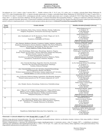 OBWIESZCZENIE Burmistrza Wąbrzeźna z dnia 8 kwietnia 2015 roku Na podstawie art. 16 § 1 ustawy z dnia 5 stycznia 2011 r. – Kodeks wyborczy (Dz. U. Nr 21, poz. 112 z późn. zm.), w związku z uchwałą Rady Miasta Wąbrzeźna Nr Xxiv/173/2 z dnia 30 października 2012 r. w sprawie obwodów głosowania w związku z uchwałami Rady Miasta Wąbrzeźno Nr XXXVIII/285/14 z dnia 27 marca 2014 r. i Nr XLII/311/14 z dnia 17 września 2014 r. zmieniającymi uchwałę w sprawie obwodów głosowania oraz w związku z uchwałą Nr V/24/15 Rady Miasta Wąbrzeźno z dnia 25 lutego 2015 r. w sprawie utworzenia odrębnego obwodu głosowania w wyborach Prezydenta Rzeczypospolitej Polskiej *), podaję do wiadomości publicznej informację o numerach i granicach obwodów głosowania, wyznaczonych siedzibach obwodowych komisji wyborczych oraz lokalach obwodowych komisji wyborczych dostosowanych do potrzeb wyborców niepełnosprawnych, w których zostanie przeprowadzone głosowanie w wyborach Prezydenta Rzeczypospolitej Polskiej: Numer obwodu 1 Granice obwodu ulice: Chełmińska, Dolna, Górna, Jeziorna, Mikołaja z Ryńska, Nadbrzeżna, Podgórna, Przejazdowa, Towarzystwa Jaszczurczego, Żeglarska 2 ulice: Grudziądzka od 1 do 49, Kasztanowa, Żwirki i Wigury od 1 do 25, Spokojna, Tysiąclecia, Grudziądzka od 50 końca 3 ulice: Bażancia, Bielikowa, Bociania, Cyrankowa, Gołębia, Jaskółcza, Jastrzębia, Kanarkowa, Kormoranowa, Krucza, Kukułcza, Łąbędzia, Orla, Pawia, Pelikanowa, Podzamcze, Przeopiórcza, Skowronkowa, Słowicza, Sokola, Sowia, Strusia, Szpakowa, Wodna, Wronia, Żurawia 4 ulice: Krasińskiego, Mickiewicza, Słowackiego, Sportowa, Targowa, Żwirki i Wigury od 26 do końca, 750-lecia Wąbrzeźna, biskupa Jana Dantyszka, Bolesława Szczuki, Cytrynowa, Czereśniowa, dr Józefa Szczepańskiego, Działkowa, Gruszkowa, ks. Ksawerego Połomskiego, Kwiatowa, Malinowa, Piękna, Poziomkowa, Truskawkowa, Wiśniowa, Wspólna 5 ulice: Generała Sikorskiego, Kopernika, Kościelna, Kościuszki, Mestwina, Plac Jana Pawła II Poniatowskiego, Pułaskiego, Toruńska, Żołnierza Polskiego 6 ulice: Generała Hallera 4,5,9, od 21 do końca, Generała Pruszyńskiego, Marii Konopnickiej, Okrężna, Pod Młynik, Wolności numery parzyste od 80 do końca i numery nieparzyste od 51 do końca, Generała Hallera 1,3,7,10,11,13,13A,15,15A, 17,19 7 ulice: 26 Stycznia, Królowej Jadwigi, Legionistów, Ojca Bernarda, Strażacka, Wolności numery parzyste od 2 do 78 i numery nieparzyste od 1 do 49 8 ulice: Matejki, Staszica, Żeromskiego, Sienkiewicza, Niedziałkowskiego 9 ulice: 1 Maja od 1 do 79, Dąbrowskiego, Partyzanta, 1 Maja od 80 do końca, Bukowa, Cisowa, Grabowa, Kętrzyńskiego, ks. Józefa Tischnera, Macieja Rataja, Osiedle Robotnicze, Witalisa Szlachcikowskiego, Władysława Reymonta, św. Floriana 10 ulice: Akacjowa, Budowlana, Jasna, Jaśminowa, Jesionowa, ks. gen. W Kiedrowskiego, Modrzewiowa, Polna, Świerkowa, Topolowa, Wierzbowa, 11 Listopada, Słoneczna, Za obwodnicą 11 Niepubliczny Zakład Opieki Zdrowotnej Nowy Szpital Sp. z .o.o. Siedziba obwodowej komisji wyborczej Szkoła Podstawowa nr 2 ul. Wolności 30 87-200 Wąbrzeźno tel. 693 320 062 Szkoła Podstawowa nr 3 ul. Tysiąclecia 1 87-200 Wąbrzeźno tel. 669 920 061 „lokal dostosowany do potrzeb wyborców niepełnosprawnych” Przedszkole Miejskie „Bajka” ul. Tysiąclecia 2a 87-200 Wąbrzeźno tel. 669 910 045 Miejski Zakład Energetyki Cieplnej Wodociągów i Kanalizacji Sp. z o.o. ul. Tysiąclecia 8A 87-200 Wąbrzeźno tel. 669 910 054 „lokal dostosowany do potrzeb wyborców niepełnosprawnych” Gimnazjum nr 1 im. Ks. Kardynała Stefana Wyszyńskiego ul. Wolności 11 87-200 Wąbrzeźno tel. 669 910 095 Wąbrzeski Dom Kultury ul. Wolności 47 87-200 Wąbrzeźno tel. 667 967 207 Zespół Szkół Zawodowych ul. Królowej Jadwigi 9 87-200 Wąbrzeźno tel.669 910 078 Centrum Kształcenia Praktycznego i Ustawicznego ul. Staszica 2 87-200 Wąbrzeźno tel.693 360 034 Przedszkole Miejskie „Bajka” ul. Żeromskiego 11 87-200 Wąbrzeźno tel.0693 360 062 „lokal dostosowany do potrzeb wyborców niepełnosprawnych” Komenda Powiatowa Państwowej Straży Pożarnej ul. św. Floriana 6 87-200 Wąbrzeźno tel. 693 360 074 „lokal dostosowany do potrzeb wyborców niepełnosprawnych” Niepubliczny Zakład Opieki Zdrowotnej Nowy Szpital Sp. z.o.o. w Wąbrzeźnie ul. Wolności 27 87-200 Wąbrzeźno tel. 693 360 096 Głosowanie w wyborach odbędzie się w dniu 10 maja 2015 r. w godz. 700 – 2100 . Wyborcy mogą głosować korespondencyjnie. Dla celów głosowania korespondencyjnego właściwe są obwodowe komisje wyborcze, które mają siedziby w lokalach dostosowanych do potrzeb wyborców niepełnosprawnych. Wyborcy niepełnosprawni o znacznym lub umiarkowanym stopniu niepełnosprawności w rozumieniu ustawy z dnia 27 sierpnia 1997 r. o rehabilitacji zawodowej i społecznej oraz zatrudnianiu osób niepełnosprawnych (Dz. U. z 2011 r. Nr 127, poz. 721, z późn. zm.) oraz wyborcy, którzy najpóźniej w dniu głosowania kończą 75 lat mogą udzielić pełnomocnictwa do głosowania w ich imieniu. Burmistrz Wąbrzeźna /-/ Leszek Kawski