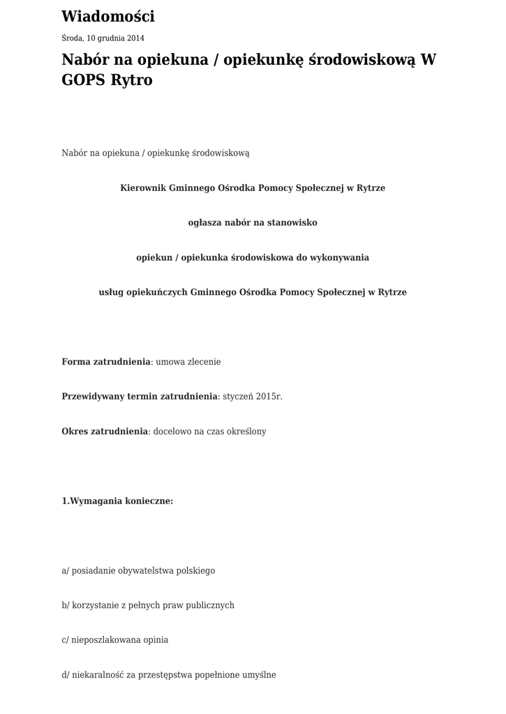 Wiadomości Środa, 10 grudnia 2014 Nabór na opiekuna / opiekunkę środowiskową W GOPS Rytro Nabór na opiekuna / opiekunkę środowiskową Kierownik Gminnego Ośrodka Pomocy Społecznej w Rytrze ogłasza nabór na stanowisko opiekun / opiekunka środowiskowa do wykonywania usług opiekuńczych Gminnego Ośrodka Pomocy Społecznej w Rytrze Forma zatrudnienia: umowa zlecenie Przewidywany termin zatrudnienia: styczeń 2015r. Okres zatrudnienia: docelowo na czas określony 1.Wymagania konieczne: a/ posiadanie obywatelstwa polskiego b/ korzystanie z pełnych praw publicznych c/ nieposzlakowana opinia d/ niekaralność za przestępstwa popełnione umyślne e/ posiadanie stanu zdrowia pozwalającego na zatrudnienie na określonym stanowisku f/ wykształcenie minimum średnie oraz posiadanie dyplomu ukończenia szkoły na jednym z kierunków: - pielęgniarka dyplomowana - opiekunka domowa - opiekunka środowiskowa - opiekun medyczny lub wykształcenie średnie z ukończonym kursem potwierdzającym posiadanie kwalifikacji niezbędnych do wykonywania zawodu opiekuna/ opiekunki środowiskowej, g/ znajomość przepisów ustawy z dnia 12 marca 2004r. o pomocy społecznej i innych aktów normatywnych związanych z pomocą społeczną, dotyczących usług opiekuńczych h/ wysoka kultura osobista i/ umiejętność pracy samodzielnej 2. Wymagania dodatkowe: a/ umiejętność skutecznego komunikowania się b/ umiejętność organizowania pracy w domu chorego c/ znajomość topografii Gminy Rytro d/ umiejętność i doświadczenie w pracy z osobami przewlekle chorymi, starszymi i niepełnosprawnymi e/ ukończone szkolenie w zakresie udzielania pierwszej pomocy (przedmedycznej). 3. Preferowane cechy osobowościowe kandydatów: a/ empatia b/ komunikatywność c/ odpowiedzialność d/ kreatywność e/ obowiązkowość f/ rzetelność g/ zaangażowanie i odporność na stres h/ uczciwość 4. Zakres wykonywanych zadań na stanowisku: - czynności higieniczno – pielęgnacyjne, - czynności gospodarcze, - czynności opiekuńcze, - czynności aktywizujące społecznie, - przygotowywanie lub dostarczanie podopiecznemu posiłków z dostosowaniem diety do stanu jego zdrowia, - prowadzenie niezbędnej dokumentacji, - współpraca z pracownikami socjalnymi oraz innymi instytucjami w zakresie wymiany informacji na temat środowiskami objętymi usługami opiekuńczymi, - inne zadania zlecone przez kierownika. - 5. Wymagane dokumenty: a/ CV ze zdjęciem b/ list motywacyjny List motywacyjny i CV należy opatrzyć klauzulą: „ Oświadczam, że wyrażam zgodę na przetwarzanie moich danych osobowych zawartych w ofercie pracy dla potrzeb niezbędnych do procesu rekrutacji zgodnie z ustawą z dnia 29 sierpnia 1997r. o ochronie danych osobowych (Dz. U. z 1997r. Nr 133, poz. 833 z późn.zm.). c/ kopie dokumentów potwierdzających wykształcenie, d/ kopie dokumentów poświadczających posiadanie kwalifikacji zawodowych (certyfikaty, uprawnienia, zaświadczenia o ukończeniu kursów i szkoleń, dyplomy), e/ kopie świadectw pracy, f/ oświadczenie o stanie zdrowia pozwalającym na zatrudnienie na danym stanowisku ( w przypadku zatrudnienia kandydat zostanie skierowany na badania lekarskie wstępne), g/ oświadczenie kandydata o korzystaniu z pełni praw publicznych, h/ oświadczenie o niekaralności za przestępstwo popełnione umyślnie ( w przypadku zatrudnienia kandydat zostanie zobowiązany do dostarczenia zaświadczenia z Krajowego Rejestru Karnego), i/ kopia dowodu osobistego. 6. Postępowanie dotyczące naboru: Nabór zostanie przeprowadzony w dwóch etapach postępowania: Etap I. Weryfikacja ofert pod względem formalnym oraz dokonanie wstępnej oceny merytorycznej. Etap II. Rozmowa kwalifikacyjna z wybranymi kandydatami w siedzibie GOPS w Rytrze i dokonanie wyboru pracownika. 7.Termin i sposób składania ofert: Dokumenty w zamkniętej kopercie z dopiskiem „Opiekun /opiekunka środowiskowa” należy składać osobiście w siedzibie Gminnego Ośrodka Pomocy Społecznej w Rytrze lub pocztą na adres: Gminny Ośrodek Pomocy Społecznej 33 – 343 Rytro, Rytro 265 w terminie od 10 grudnia 2014r. do 29 grudnia 2014r. O terminie rozmowy kwalifikacyjnej wybrani kandydaci zostaną powiadomieni telefonicznie. Informacja o wynikach konkursu zostanie umieszczona na tablicy informacyjnej GOPS Rytro i na stronie internetowej Gminy Rytro www.gmina @ rytro.pl Kierownik Gminnego Ośrodka Pomocy Społecznej w Rytrze Maria Halina Komenda Rytro, dnia 09 grudnia 2014r.