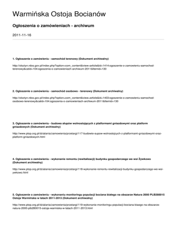 Warmińska Ostoja Bocianów Ogłoszenia o zamówieniach - archiwum 2011-11-16 1. Ogłoszenie o zamówieniu - samochód terenowy (Dokument archiwalny) http://olsztyn.rdos.gov.pl/index.php?option=com_content&view=article&id=1414:ogoszenie-o-zamowieniu-samochodterenowy&catid=104:ogoszenia-o-zamowieniach-archiwum-2011&Itemid=130 2. Ogłoszenie o zamówieniu - samochód osobowo - terenowy (Dokument archiwalny) http://olsztyn.rdos.gov.pl/index.php?option=com_content&view=article&id=1403:ogoszenie-o-zamowieniu-samochodosobowo-terenowy&catid=104:ogoszenia-o-zamowieniach-archiwum-2011&Itemid=130 3. Ogłoszenie o zamówieniu - budowa słupów wolnostojących z platformami gniazdowymi oraz platform gniazdowych (Dokument archiwalny) http://www.ptop.org.pl/dzialania/zamowienia/przetargi/117-budowie-supow-wolnostojcych-z-platformami-gniazdowymi-orazplatform-gniazdowych.html 4. Ogłoszenie o zamówieniu - wykonanie remontu (rewitalizacji) budynku gospodarczego we wsi Żywkowo (Dokument archiwalny) http://www.ptop.org.pl/dzialania/zamowienia/przetargi/118-wykonanie-remontu-rewitalizacji-budynku-gospodarczego-we-wsiywkowo.html 5. Ogłoszenie o zamówieniu - wykonaniu monitoringu populacji bociana białego na obszarze Natura 2000 PLB280015 Ostoja Warmińska w latach 2011-2013 (Dokument archiwalny) http://www.ptop.org.pl/dzialania/zamowienia/przetargi/119-wykonanie-monitoringu-populacji-bociana-biaego-na-obszarzenatura-2000-plb280015-ostoja-warmiska-w-latach-2011-2013.html 6. Ogłoszenie o zamówieniu - dostawa sprzętu pomiarowego, fotograficznego, optycznego, informatycznego i komputerowego http://olsztyn.rdos.gov.pl/index.php?option=com_content&view=article&id=1622:ogoszenie-o-zamowieniu-dostawasprztu-pomiarowego-fotograficznego-optycznego-informatycznego-i-komputerowego&catid=73:ogoszenia-ozamowieniach&Itemid=97 7. Ogłoszenie o zamówieniu - dostawia sprzętu rolniczego http://www.ptop.org.pl/dzialania/zamowienia/przetargi.html 8. Ogłoszenie o zamówieniu - dostawia sprzętu rolniczego 2 http://www.ptop.org.pl/dzialania/zamowienia/przetargi/185-ciagnik2.html 9. Dostawa 6 pilarek motorowych Husqvarna 450 e-series do użytku przez jednostki ochotniczych straży pożarnych wraz z przeszkoleniem z obsługi sprzętu. http://olsztyn.rdos.gov.pl/index.php?option=com_content&view=article&id=1703:dostawa-6-pilarek-motorowychhusqwarna-450-e-series-do-uytku-przez-jednostki-ochotniczych-stray-poarnych-wraz-z-przeszkoleniem-z-obsugisprztu&catid=110:rozpoznania-cenowe-archiwum-2012&Itemid=136 10. Ogłoszenie o zamówieniu - dostawa tablic, tabliczek i nalepek http://olsztyn.rdos.gov.pl/index.php?option=com_content&view=article&id=1689:ogoszenie-o-zamowieniu-usuga-polegajcana-opracowaniu-planow-zada-ochronnych-dla-6-obszarow-natura-2000-w-wojewodztwie-warmisko-mazurskim-w-ramachprojektu-opracowanie-pzo-dla-obszarow-natura2000-na-obszarze-polski-w-2012-roku-wraz-zzacznikami&catid=73:ogoszenia-o-zamowieniach&Itemid=97 11. Ogłoszenie o zamówieniu - dostawa tablic, tabliczek i nalepek http://olsztyn.rdos.gov.pl/index.php?option=com_content&view=article&id=1707:ogoszenie-ozamowieniu-dostawa-tablic-tabliczek-i-nalepek-informacyjnych&catid=111:zamowieniapubliczne-powyej-14-000-euro&Itemid=137 12. Konkurs na realizację usługi polegającej na realizacji filmu przyrodniczego według własnego scenariusza http://www.ptop.org.pl/dzialania/zamowienia/przetargi/226-film-o-bocianie-biaym.html http://www.ptop.org.pl/images/stories/life_ccc/film/zawiadomienie_o_wyborze_konkurs.pdf 13.Ogłoszenie o zamówieniu - dostawa wraz z dostarczeniem we wskazane miejsca 6 sztuk podnośników koszowych, hydraulicznych, zamontowanych na przyczepach, które będą przystosowane do holowania po drogach publicznych za pojazdami samochodowymi. http://olsztyn.rdos.gov.pl/index.php? option=com_content&view=article&id=1799:ogoszenie-o-zamowieniu-dostawa-wrazdostarczeniem-we-wskazane-miejsce-6-sztuk-podnonikow-koszowych-hydraulicznychzamontowanych-na-przyczepach-ktore-bd-przystosowane-do-holowania-po-drogachpublicznych-za-pojazdem-samochodowym&catid=112:zamowienia-publiczne-powyej14000-euro-archiwum&Itemid=138 14. Ogłoszenie o zamówieniu - remont (rewitalizacja) dachów budynków gospodarczych w Młynowie 38, Jarzeniu 9, Jarzeniu 11 oraz Jarzeniu 13 http://www.ptop.org.pl/dzialania/zamowienia/przetargi/306-remont-dachow.html 15. Ogłoszenie o zamówieniu-dostawa wraz z dostarczeniem we wskazane miejsca 6 sztuk podnośników koszowych, hydraulicznych, zamontowanych na przyczepach, które będą przystosowane do holowania po drogach publicznych za pojazdami samochodowymi http://olsztyn.rdos.gov.pl/index.php?option=com_content&view=article&id=1928:ogoszenie-ozamowieniu-dostawa-wraz-z-dostarczeniem-we-wskazane-miejsca-6-sztuk-podnonikowkoszowych-hydraulicznych-zamontowanych-na-przyczepach-ktore-bd-przystosowane-doholowania-po-drogach-publicznych-za-pojazdami-samochodowymi&catid=111:zamowieniapubliczne-powyej-14-000-euro&Itemid=137 16. Ogłoszenie o zamówieniu - budowa urządzeń wodnych piętrzących oraz stawów ziemnych dla płazów wokół wsi Żywkowo w związku z realizacją zadania C.1 Budowa 4 piętrzeń oraz C.2 Budowa 6 stawów ziemnych będących częścią projektu: nr LIFE09 NAT/PL/000253 „Ochrona populacji bociana białego na terenie obszaru Natura 2000 Ostoja Warmińska” http://www.ptop.org.pl/dzialania/zamowienia/przetargi/296-budowa-urzdze-wodnych-pitrzcychoraz-stawow-ziemnych-dla-pazow-woko-wsi-ywkowo.html 17. Ogłoszenie o zamówieniu-modernizacja urządzeń energetycznych na terenie obszaru Natura 2000 Ostoja Warmińska http://olsztyn.rdos.gov.pl/index.php?option=com_content&view=article&id=2172:ogoszenie-ozamowieniu-modernizacja-urzdze-energetycznych-na-terenie-obszaru-natura-2000-ostojawarmiska&catid=111:zamowienia-publiczne-powyej-14-000-euro&Itemid=137 18. Ogłoszenie o zamówieniu - zakup i dostarczenie 4 tablic typu roll-up http://olsztyn.rdos.gov.pl/index.php?option=com_content&view=article&id=2119:zakup-idostarczenie-4