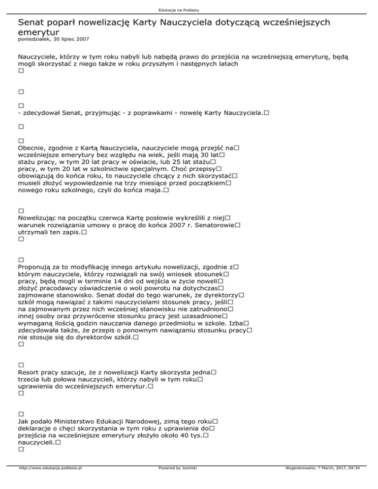 Edukacja na Podlasiu Senat poparł nowelizację Karty Nauczyciela dotyczącą wcześniejszych emerytur poniedziałek, 30 lipiec 2007 Nauczyciele, którzy w tym roku nabyli lub nabędą prawo do przejścia na wcześniejszą emeryturę, będą mogli skorzystać z niego także w roku przyszłym i następnych latach - zdecydował Senat, przyjmując - z poprawkami - nowelę Karty Nauczyciela. Obecnie, zgodnie z Kartą Nauczyciela, nauczyciele mogą przejść na wcześniejsze emerytury bez względu na wiek, jeśli mają 30 lat stażu pracy, w tym 20 lat pracy w oświacie, lub 25 lat stażu pracy, w tym 20 lat w szkolnictwie specjalnym. Choć przepisy obowiązują do końca roku, to nauczyciele chcący z nich skorzystać musieli złożyć wypowiedzenie na trzy miesiące przed początkiem nowego roku szkolnego, czyli do końca maja. Nowelizując na początku czerwca Kartę posłowie wykreślili z niej warunek rozwiązania umowy o pracę do końca 2007 r. Senatorowie utrzymali ten zapis. Proponują za to modyfikację innego artykułu nowelizacji, zgodnie z którym nauczyciele, którzy rozwiązali na swój wniosek stosunek pracy, będą mogli w terminie 14 dni od wejścia w życie noweli złożyć pracodawcy oświadczenie o woli powrotu na dotychczas zajmowane stanowisko. Senat dodał do tego warunek, że dyrektorzy szkół mogą nawiązać z takimi nauczycielami stosunek pracy, jeśli na zajmowanym przez nich wcześniej stanowisku nie zatrudniono innej osoby oraz przywrócenie stosunku pracy jest uzasadnione wymaganą ilością godzin nauczania danego przedmiotu w szkole. Izba zdecydowała także, że przepis o ponownym nawiązaniu stosunku pracy nie stosuje się do dyrektorów szkół. Resort pracy szacuje, że z nowelizacji Karty skorzysta jedna trzecia lub połowa nauczycieli, którzy nabyli w tym roku uprawienia do wcześniejszych emerytur. Jak podało Ministerstwo Edukacji Narodowej, zimą tego roku deklaracje o chęci skorzystania w tym roku z uprawienia do przejścia na wcześniejsze emerytury złożyło około 40 tys. nauczycieli. http://www.edukacja.podlasie.pl Powered by Joomla! Wygenerowano: 7 March, 2017, 04:34 Edukacja na Podlasiu Zapisy nowelizujące ustawę Karta Nauczyciela, dotyczące tych nauczycieli, którzy w tym roku uzyskali prawo do wcześniejszych emerytur, wcześniej znajdowały się w projekcie ustawy o emeryturach pomostowych. O wyłączenie ich i skierowanie w formie osobnego projektu do szybkiej ścieżki legislacyjnej zabiegały Związek Nauczycielstwa Polskiego i Sekcja Krajowa Oświaty i Wychowania NSZZ "Solidarność". Zgodnie z przygotowywanym projektem ustawy o emeryturach pomostowych z kwietnia tego roku, nauczyciele urodzeni po 31 grudnia 1948 r., a przed 1 stycznia 1969 r. będą mogli przejść na takie emerytury po osiągnięciu co najmniej wieku 55 lat dla kobiet i co najmniej 60 lat dla mężczyzn; ich okres składkowy musi wynieść co najmniej 20 lat dla kobiet i 25 lat dla mężczyzn, a okres pracy w szczególnym charakterze co najmniej 15 lat. W związku z przyjęciem przez Senat poprawek do nowelizacji Karty Nauczyciela trafi ona teraz z powrotem do Sejmu. PAP - Nauka w Polsce http://www.edukacja.podlasie.pl Powered by Joomla! Wygenerowano: 7 March, 2017, 04:34
