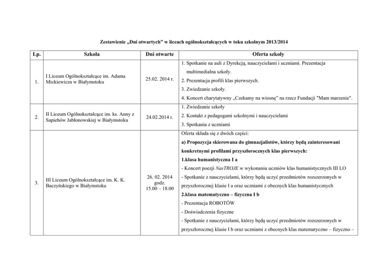 Zestawienie „Dni otwartych” w liceach ogólnokształcących w toku szkolnym 2013/2014 Lp. Szkoła Oferta szkoły Dni otwarte 1. Spotkanie na auli z Dyrekcją, nauczycielami i uczniami. Prezentacja 1. I Liceum Ogólnokształcące im. Adama Mickiewicza w Białymstoku multimedialna szkoły. 25.02. 2014 r. 2. Prezentacja profili klas pierwszych. 3. Zwiedzanie szkoły. 4. Koncert charytatywny „Czekamy na wiosnę” na rzecz Fundacji "Mam marzenie". 1. Zwiedzanie szkoły 2. II Liceum Ogólnokształcące im. ks. Anny z Sapiehów Jabłonowskiej w Białymstoku 24.02.2014 r. 2. Kontakt z pedagogami szkolnymi i nauczycielami 3. Spotkania z uczniami Oferta składa się z dwóch części: a) Propozycja skierowana do gimnazjalistów, którzy będą zainteresowani konkretnymi profilami przyszłorocznych klas pierwszych: 1.klasa humanistyczna I a - Koncert poezji NasTROJE w wykonaniu uczniów klas humanistycznych III LO 3. III Liceum Ogólnokształcące im. K. K. Baczyńskiego w Białymstoku 26. 02. 2014 godz. 15.00 – 18.00 - Spotkanie z nauczycielami, którzy będą uczyć przedmiotów rozszerzonych w przyszłorocznej klasie I a oraz uczniami z obecnych klas humanistycznych 2.klasa matematyczno – fizyczna I b - Prezentacja ROBOTÓW - Doświadczenia fizyczne - Spotkanie z nauczycielami, którzy będą uczyć przedmiotów rozszerzonych w przyszłorocznej klasie I b oraz uczniami z obecnych klas matematyczno – fizyczno – informatycznych 3.klasa matematyczno –geograficzna I c, Id - Prezentacja Trójka geografią silna - Spotkanie z nauczycielami, którzy będą uczyć przedmiotów rozszerzonych w przyszłorocznej klasie I c, I d oraz uczniami z obecnych klas matematyczno – geograficznych z rozszerzonym językiem angielskim 4.klasa biologiczno – chemiczna I e, I f, I h - Warsztaty chemiczne Chemia w Twoich rękach - Prezentacja: Biologiczna rola żelaza - Prezentacja: Co warto wiedzieć o węglowodanach? - Spotkanie z nauczycielami, którzy będą uczyć przedmiotów rozszerzonych w przyszłorocznej klasie I e, I f, I h oraz uczniami z obecnych klas biologiczno chemicznych 5.klasa dwujęzyczna z hiszpańskim językiem nauczania 0 g - Warsztaty językowe: Dwujęzyczna Trójka - Spotkanie z nauczycielem języka hiszpańskiego oraz uczniami z obecnych klas dwujęzycznych z hiszpańskim językiem nauczana b) Propozycja skierowana do gimnazjalistów zainteresowanych dodatkową ofertą III LO: 1.Spotkanie z Dyrektorem Szkoły 2.Język angielski dla wszystkich - Prezentacja projektów edukacyjnych - Spotkanie z nauczycielem języka angielskiego oraz uczniami, którzy uczestniczyli w projekcie „Enter your future” i sesji Europejskiego Parlamentu Młodzieży 3.„Trójka” pomaga – prezentacja działań charytatywnych powadzonych w ramach zespołu - Spotkanie z zespołem do działań charytatywnych „Trójka pomaga” – nauczycielami oraz uczniami, którzy biorą czynny udział w akcjach charytatywnych 4.Przedstawienie oferty pracy pedagoga szkolnego oraz psychologa w III LO 5.Prezentacja działalności Klubu Integracji Europejskiej - Spotkanie z opiekunem klubu oraz członkami zespołu – uczniami III LO 6. Wśród książek i artystycznych dążeń Prezentacja osiągnięć laureatów konkursów literackich i plastycznych (prezentacja tomików pokonkursowych z wierszami laureatów, zdjęć i dyplomów z konkursów, prezentacja kronik) - Prezentacja wystawy prac plastycznych uczennic III LO w ramach projektu „Nasze pasje” - Spotkanie z nauczycielami bibliotekarzami 4. IV Liceum Ogólnokształcące im. C. K. Norwida w Białymstoku 26.02.2014r. godz. 10.00 – 16.00 5. V Liceum Ogólnokształcące im. Jana III Sobieskiego w Białymstoku 28.02.2014 r. godz. 12.00- 16.30 - prezentacja stoisk o proponowanych profilach; - zorganizowane oprowadzanie gimnazjalistów po szkole połączone z prezentowaniem materiałów promocyjnych; - koncert dla gimnazjalistów; - możliwość obejrzenia rozgrywek piłki koszykowej (IV LO - PG Łapy); - lekcje otwarte; - interaktywna gra szkolna dla gimnazjalistów. 1. Czym chata bogata…- Jaś i Marysieńka gospodarze V LO witają przybyłych gości 2. Zapoznanie z historią V LO i Patronem szkoły- prezentacja multimedialna 3. Prezentacja autorskich profili nauczania w roku szkolnym 2014/15: a) profil psychologiczny b) profil reporterski c) profil archeologiczny 6. VI Liceum Ogólnokształcące im. Króla Zygmunta Augusta w Białymstoku 26.02.2014 r. d) profil architektoniczny 4. Prezentacja oferty edukacyjnej szkoły dla wszystkich profili w roku szkolnym 2014/15 5. Prezentacja zajęć dodatkowych rozwijających zainteresowania uczniów: a) Światowe Dziedzictwo Przyrodnicze i Kulturowe UNESCO- prezentacja multimedialna b) Obserwacje mikroskopowe na zajęciach z biologii c) Żywi Malarze i ich dzieła- wystawa prac autorskich uczniów V LO d) Melanż Matematyczny- czyli niepoważnie o rzeczach bardzo poważnych e) Tym podobne rozrywki…- quiz dla poliglotów- Niemcy i Rosja f) Gry słowne- angielski dla zaawansowanych g) Rowerem do szkoły- ścieżki rowerowe osiedla h) Strzelectwo sportowe wizytówką V LO i) Sporty obronne w V LO j) Sobieszczak- gazetka uczniowska nie tylko dla szkolnych „reporterów” k) Fizyka nie boli- jak uczyć się fizyki, żeby nie osiwieć l) Przedsiębiorczy na rynku pracy- Szkolny Ośrodek Kariery m) Pewnym krokiem w przyszłość- staże zawodowe dla uczniów V LO !!! M.in.: - powitanie przez króla i królową, - prezentacja szkoły przez samorząd szkolny, - ekspozycja prac plastycznych, występ muzyczny uczniów szkoły, - prezentacja multimedialna, film o szkole, - pokazy w salach wg koncepcji nauczycieli (np. pokazy, doświadczenia, eksperymenty biologiczne, chemiczne, fizyczne), ekspozycje geograficzne, - quizy, prelekcje historyczne, pokazy uczniów w strojach historycznych, - rozgrywki sportowe połączone z pokazem aerobiku i pokazem tanecznym, - pokaz możliwości wykorzystania tablic interaktywnych w trakcie 