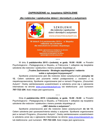 ZAPROSZENIE na bezpłatne SZKOLENIE dla rodziców i opiekunów dzieci i dorosłych z autyzmem *** W dniu 3 października 2015 r.(sobota), w godz. 10.00 -16.00 w Poradni Psychologiczno –Pedagogicznej w Słupsku, ul Fabryczna 1 odbędzie się bezpłatne szkolenie dla rodziców i opiekunów z terenu powiatu słupskiego pt. „Trudne Zachowania - Strategie zapobiegania i radzenia sobie z sytuacjami kryzysowymi”. Spotkanie przeznaczone jest dla rodziców dzieci autystycznych powyżej lat 12. Celem szkolenia jest poznanie metod postępowania z osobami z tą niepełnosprawnością. Spotkanie organizowane jest w ramach Programu „Zrozumieć Autyzm”. Osoby zainteresowane uczestnictwem w szkoleniu prosi się o zgłoszenie internetowe na stronie www.zrozumiecautyzm.eu lub telefoniczne pod numerem 797-722-104. Ilość miejsc jest ograniczona. *** Dnia 4 października 2015 r.(niedziela), w godz. 10.00 -16.00 w Poradni Psychologiczno –Pedagogicznej w Słupsku, ul Fabryczna 1 odbędzie się bezpłatne szkolenie dla rodziców i opiekunów z terenu powiatu słupskiego pt. „ ABC dziecka z autyzmem”. Spotkanie przeznaczone jest dla rodziców dzieci autystycznych do lat 12. Celem szkolenia jest upowszechnienia wiedzy o autyzmie. Spotkanie organizowane jest w ramach Programu „Zrozumieć Autyzm”. Osoby zainteresowane uczestnictwem w szkoleniu prosi się o zgłoszenie internetowe na stronie www.zrozumiecautyzm.eu lub telefoniczne pod numerem 797-722-104. Ilość miejsc jest ograniczona.