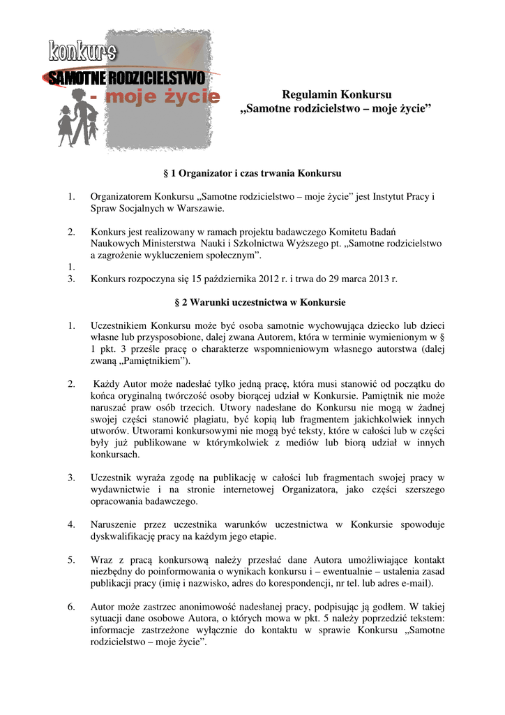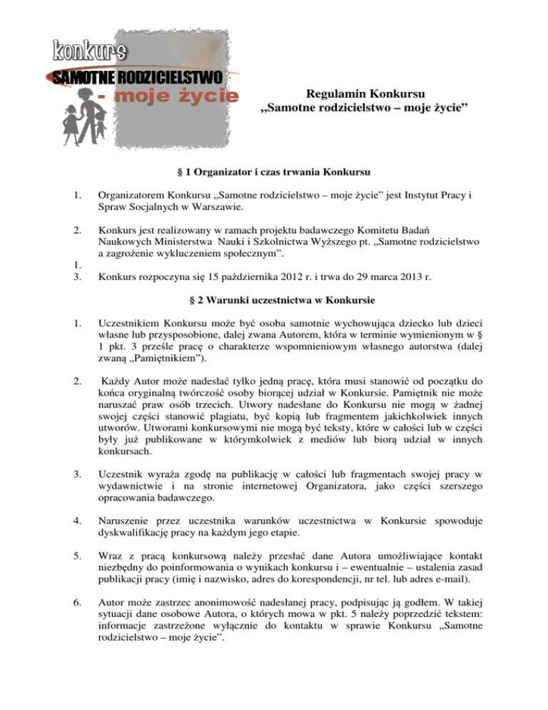 Regulamin Konkursu „Samotne rodzicielstwo – moje życie” § 1 Organizator i czas trwania Konkursu 1. Organizatorem Konkursu „Samotne rodzicielstwo – moje życie” jest Instytut Pracy i Spraw Socjalnych w Warszawie. 2. Konkurs jest realizowany w ramach projektu badawczego Komitetu Badań Naukowych Ministerstwa Nauki i Szkolnictwa Wyższego pt. „Samotne rodzicielstwo a zagrożenie wykluczeniem społecznym”. 1. 3. Konkurs rozpoczyna się 15 października 2012 r. i trwa do 29 marca 2013 r. § 2 Warunki uczestnictwa w Konkursie 1. Uczestnikiem Konkursu może być osoba samotnie wychowująca dziecko lub dzieci własne lub przysposobione, dalej zwana Autorem, która w terminie wymienionym w § 1 pkt. 3 prześle pracę o charakterze wspomnieniowym własnego autorstwa (dalej zwaną „Pamiętnikiem”). 2. Każdy Autor może nadesłać tylko jedną pracę, która musi stanowić od początku do końca oryginalną twórczość osoby biorącej udział w Konkursie. Pamiętnik nie może naruszać praw osób trzecich. Utwory nadesłane do Konkursu nie mogą w żadnej swojej części stanowić plagiatu, być kopią lub fragmentem jakichkolwiek innych utworów. Utworami konkursowymi nie mogą być teksty, które w całości lub w części były już publikowane w którymkolwiek z mediów lub biorą udział w innych konkursach. 3. Uczestnik wyraża zgodę na publikację w całości lub fragmentach swojej pracy w wydawnictwie i na stronie internetowej Organizatora, jako części szerszego opracowania badawczego. 4. Naruszenie przez uczestnika warunków uczestnictwa w Konkursie spowoduje dyskwalifikację pracy na każdym jego etapie. 5. Wraz z pracą konkursową należy przesłać dane Autora umożliwiające kontakt niezbędny do poinformowania o wynikach konkursu i – ewentualnie – ustalenia zasad publikacji pracy (imię i nazwisko, adres do korespondencji, nr tel. lub adres e-mail). 6. Autor może zastrzec anonimowość nadesłanej pracy, podpisując ją godłem. W takiej sytuacji dane osobowe Autora, o których mowa w pkt. 5 należy poprzedzić tekstem: informacje zastrzeżone wyłącznie do kontaktu w sprawie Konkursu „Samotne rodzicielstwo – moje życie”. § 3 Cel Konkursu i tematyka prac 1. 2. Celem Konkursu jest zebranie i wykorzystanie w celach naukowych informacji o sytuacji samotnych rodziców w Polsce i strategiach rozwiązywania przez nich swoich problemów. Nadesłane materiały mogą posłużyć do przygotowania rekomendacji w zakresie polityki rodzinnej. Pamiętniki powinny zawierać opisy osobistych odczuć i zachowań Autora dotyczących sposobów radzenia sobie z codziennymi problemami, doświadczeń związanych z łączeniem pracy z obowiązkami rodzinnymi, z wychowaniem dzieci, staraniami podejmowanych dla poprawy swoich warunków życia oraz oceny możliwości rozwiązania swoich problemów. § 4 Zasady Konkursu 1. 2. 3. 4. 5. 6. 7. 8. 9. 10. 11. 12. 13. 14. 15. Aby wziąć udział w Konkursie należy przesłać pocztą na adres Organizatora tekst mający formę pamiętnika. Dopuszczalny jest czytelny rękopis lub maszynopis. Objętość pracy nie może być mniejsza niż dwie strony tekstu. Praca musi być napisana w języku polskim. Praca powinna być opatrzona syntetyczną charakterystyką Autora (wiek, wykształcenie, stan cywilny, liczba dzieci). Do tekstu należy dołączyć własnoręcznie podpisane oświadczenie, że praca spełnia wymogi, o którym mowa w § 2 ustęp 2. Teksty należy przesłać w nieprzekraczalnym terminie do 29 marca 2012 r. (decyduje data stempla pocztowego). W Konkursie przewidziano nagrody pieniężne: nagroda I w wysokości 2000 zł nagroda II w wysokości 1500 zł nagroda III w wysokości 1200 zł. Organizator ma prawo innego podziału nagród oraz przyznania wyróżnień. Do oceny prac i przyznawania nagród uprawnione jest Jury powołane przez Organizatora spośród pracowników Instytutu Pracy i Spraw Socjalnych Wyniki konkursu zostaną podane do dnia 28 czerwca 2013 r. na stronie internetowej Organizatora (www.ipiss.com.pl), a laureaci Konkursu zostaną dodatkowo powiadomieni listownie o przyznanej nagrodzie. Organizator Konkursu ma prawo do korekty pod względem poprawności językowej treści nadesłanych na Konkurs Pamiętników w celu ich publikacji. Publikacja Pamiętnika lub jego fragmentów nie jest uzależniona od przyznania jej Autorowi nagrody pieniężnej § 5 Postanowienia końcowe 1. 2. Dodatkowe informacje można uzyskać pod telefonem (22) 53 67 532 lub pisząc na adres Instytut Pracy i Spraw Socjalnych, Zakład Problemów Rodziny, ul. Bellottiego 3b, 01-022 Warszawa. Przesyłając pracę na Konkurs, Uczestnik potwierdza, iż wyraża zgodę na przestrzeganie zasad Konkursu zawartych w niniejszym Regulaminie oraz wyraża zgodę na wykorzystywanie swoich danych osobowych do celów Konkursu, mając jednocześnie prawo do wglądu i ich weryfikacji.