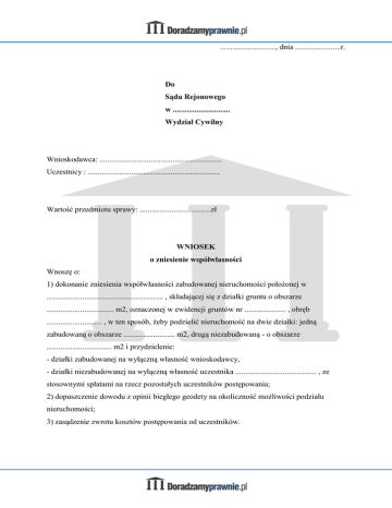............................, dnia .......................r. Do Sądu Rejonowego w ............................. Wydział Cywilny Wnioskodawca: .............................................................. Uczestnicy : ................................................................... Wartość przedmiotu sprawy: ....................................zł WNIOSEK o zniesienie współwłasności Wnoszę o: 1) dokonanie zniesienia współwłasności zabudowanej nieruchomości położonej w ........................................................... , składającej się z działki gruntu o obszarze .................................. m2, oznaczonej w ewidencji gruntów nr ..................... , obręb ............................ , w ten sposób, żeby podzielić nieruchomość na dwie działki: jedną zabudowaną o obszarze .......................... m2, drugą niezabudowaną - o obszarze ................................. m2 i przydzielenie: - działki zabudowanej na wyłączną własność wnioskodawcy, - działki niezabudowanej na wyłączną własność uczestnika ......................................... , ze stosownymi spłatami na rzecz pozostałych uczestników postępowania; 2) dopuszczenie dowodu z opinii biegłego geodety na okoliczność możliwości podziału nieruchomości; 3) zasądzenie zwrotu kosztów postępowania od uczestników. Uzasadnienie Opisana nieruchomość stanowi współwłasność wnioskodawcy w .......................... (podać w jakiej części), uczestników: .................................. w ......................(podać w jakiej części), ................................... w ................(podać w jakiej części) i ................................... w ................................ (podać w jakiej części), części. Dowód: odpis księgi wieczystej, wypis z rejestru gruntów. Nieruchomość zabudowana jest................................................................................................................................................. ......... (podać rodzaj zabudowania). Uczestnicy ............................................................ nie przejawiają większego zainteresowania przedmiotem współwłasności. Współwłaściciele pragną dokonać podziału nieruchomości na dwie części, zgodnie z załączonym projektem. Dowód: projekt podziału. Wartość budynku obecnie nie jest wielka, zdaniem wnioskodawcy , przy proponowanym podziale wartość poszczególnych części będzie taka sama. wnioskodawca i ....................................................... dysponują środkami finansowymi na dokonanie spłaty pozostałych współwłaścicieli. Dowód: zeznania stron. ................................................. (podpis) Załączniki: 1) odpis wniosku z załącznikami - 3 egzemplarze, 2) odpis księgi wieczystej, 3) wypis z rejestru gruntów, 4) propozycja podziału.