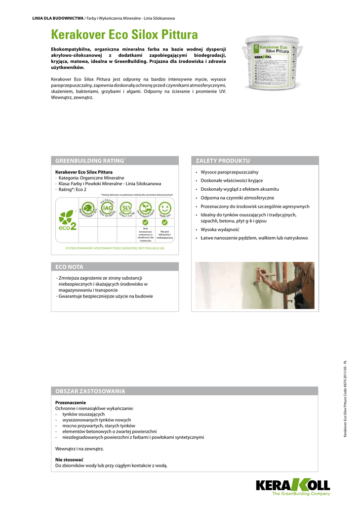 LINIA DLA BUDOWNICTWA / Farby i Wykończenia Mineralne - Linia Siloksanowa Kerakover Eco Silox Pittura Ekokompatybilna, organiczna mineralna farba na bazie wodnej dyspersji akrylowo-siloksanowej z dodatkami zapobiegającymi biodegradacji, kryjąca, matowa, idealna w GreenBuilding. Przjazna dla środowiska i zdrowia użytkowników. Kerakover Eco Silox Pittura jest odporny na bardzo intensywne mycie, wysoce paroprzepuszczalny, zapewnia doskonałą ochronę przed czynnikami atmosferycznymi, skażeniem, bakteriami, grzybami i algami. Odporny na ścieranie i promienie UV. Wewnątrz, zewnątrz. GreenBuilding Rating® Zalety Produktu Kerakover Eco Silox Pittura -- Kategoria: Organiczne Mineralne -- Klasa: Farby i Powłoki Mineralne - Linia Siloksanowa -- Rating*: Eco 2 • Wysoce paroprzepuszczalny * Rating obliczony na podstawie średniej dla wariantów kolorystycznych • Doskonałe właściwości kryjące • Doskonały wygląd z efektem aksamitu • Odporna na czynniki atmosferyczne • Przeznaczony do środowisk szczególnie agresywnych ® 2 • Idealny do tynków osuszających i tradycyjnych, szpachli, betonu, płyt g-k i gipsu Brak konieczności znakowania o szkodliwości dla środowiska Nie jest toksyczny i niebezpieczny • Wysoka wydajność • Łatwe nanoszenie pędzlem, wałkiem lub natryskowo System pomiarowy atestowany przez jednostkę certyfikującą SGS ECO NOTA Obszar zastosowania Przeznaczenie Ochronne i nienasiąkliwe wykańczanie: - tynków osuszających - wysezonowanych tynków nowych - mocno przywartych, starych tynków - elementów betonowych o zwartej powierzchni - niezdegradowanych powierzchni z farbami i powłokami syntetycznymi Wewnątrz i na zewnątrz. Nie stosować Do zbiorników wody lub przy ciągłym kontakcie z wodą. Kerakover Eco Silox Pittura Code: K670 2011/03 - PL --Zmniejsza zagrożenie ze strony substancji niebezpiecznych i skażających środowisko w magazynowaniu i transporcie --Gwarantuje bezpieczniejsze użycie na budowie Technologia użycia Przygotowanie podłoży Wykańczane powierzchnie muszą być suche, wysezonowane, dokładnie oczyszczone, bez części uszkodzonych, bez łuszczących się starych farb, kurzu i olejów szalunkowych. W wypadku obecności mchów, porostów i alg obrobić powierzchnie środkiem Kerakover Eco Activ i po 24 godzinach zmyć wodą pod ciśnieniem. Po oczyszczeniu i ok. 12 godzin przed malowaniem zagruntować jednokrotnie Kerakover Eco Silox Primer. Na podłożach nowych i znaczących: zagruntować jednokrotnie gruntem wzmacniająco-hydrofobizującym Kerakover Eco Silox Primer a następnie zastosować do wykończenia system siloksanowy Kerakover Eco Silox. Na podłożach starych i/lub pomalowanych: oczyścić dokładnie środkami mechanicznymi i/lub chemicznymi i usunąć odpadające warstwy farb. Nanieść jednokrotnie wodny grunt wzmacniająco-hydrofobizujący Kerakover Eco Silox Primer. W przypadku powierzchni porowatych, które wymagają wzmocnienia jak np. stare tynki z farbami wapiennymi zastosować grunt Kerakover Eco Acrilex Consolidante. Nanieść następnie siloksanowy system wykończeniowy Kerakover Eco Silox Pittura. Sposób użycia Zawsze wymieszać Kerakover Eco Silox Pittura przed użyciem. Nanoszenie Kerakover Eco Silox Pittura nanosić dokładnie na całej powierzchni, dwukrotnie malując pędzlem, wałkiem lub natryskowo w obu operacjach przy rozcieńczeniu wodą 20 - 30% objętościowo w zależności od użytych narzędzi - podłoża dobrze wysuszone lub o wilgotności nie większej niż 6%. Warunki mikroklimatyczne niezbędne do nanoszenia to temperatura od +5 °C do +30 °C i wilgotność względna poniżej 80%. Czas oczekiwania między pierwszym i drugim malowaniem minimum 12 godzin. Unikać nanoszenia przy bezpośrednim nasłonecznieniu. Po pomalowaniu powierzchnie zewnętrzne należy chronić przed deszczem i wilgocią do całkowitego wyschnięcia farby. W przypadku użycia produktów z różnych partii lub konieczności zakończenia prac produktem zabarwionym przy użyciu dyspensera zaleca się wymieszanie ze sobą całej farby aby uniknąć niewielkich wahań koloru. Czyszczenie Kerakover Eco Silox usuwa się z narzędzi wodą przed jego związaniem. Inne wskazówki Przedstawione kolory mają charakter orientacyjny. Zaleca się wykonanie próby w celu zweryfikowania barwy. Nie stosować Kerakover Eco Silox Pittura do wykańczania i uszczelniania wewnętrznych powierzchni fontann, zbiorników i górnych powierzchni gzymsów. Powierzchnie obciążone podciąganiem kapilarnym wilgoci należy obrobić systemem osuszającym. Wygląd Gęstość Natura chemiczna Przechowywanie Uwagi Lepkość Opakowanie Temperatura użycia Wilgotność podłoża Czas oczekiwania między nałożeniem 1. i 2. warstwy Rozcieńczenie wodą między naniesieniem 1. i 2. powłoki Suchy “na dotyk” Wydajność przy dwukrotnym malowaniu na równym podłożu Farba biała lub kolorowa ≈ 1,49 kg/ℓ emulsja akrylowo-siloksanowa ≈ 18 miesięcy w oryginalnym opakowaniu i suchym miejscu chronić przed mrozem; chronić przed bezpośrednim nasłonecznieniem i źródłami ciepła ≈ 48000 cps, wirnik 6 RPM 10 metoda Brookfielda wiaderka 14 ℓ – 4 ℓ od +5 °C do +30 °C ≤ 6% ≥ 12 h 20 – 30% w objętości ≤1h ≈ 0,15 – 0,2 l/m2 Dane uzyskane w temperaturze +20 ± 2 °C i przy 65 ± 5% wilgotności względnej powietrza bez wentylacj. Mogą ulegać zmianie w zależności od warunków panujących na budowie. Kerakover Eco Silox Pittura Code: K670 2011/03 - PL Dane techniczne wg Normy Jakości Kerakoll Performance HIGH-Tech Odporność na zmywanie Przepuszczalność pary wodnej Przepuszczalność wody w stanie ciekłym Zgodna z teorią Kuenzle > 10000 cykli klasa V1 (wysoka) klasa W3 (niska) w < 0,5 kg /m2∙h0,5 – sD < 2 m UNI 10560 EN ISO 7783-2 EN 1062-3 DIN 18550 Uwagi Kerakover Eco Silox Pittura Code: K670 2011/03 - PL - Produkt do użytku profesjonalnego - stosować w temperaturze między +5 °C a +30 °C - sp