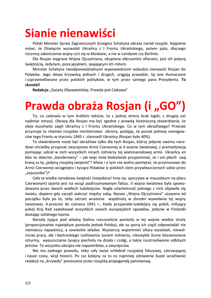 Sianie nienawiści Polski Minister Spraw Zagranicznych Grzegorz Schetyna obraża naród rosyjski. Najpierw mówi, że Oświęcim wyzwalali Ukraińcy z I Frontu Ukraińskiego, potem pyta, dlaczego rocznicę zakończenia wojny czci się w Moskwie, a nie w Londynie czy Berlinie. Dla Rosjan wygrana Wojna Ojczyźniana, okupiona olbrzymimi ofiarami, jest ich jedyną świętością. Jedynym, poza językiem, spajającym ich mitem. Minister Schetyna nieodpowiedzialnymi wypowiedziami wzbudza nienawiść Rosjan do Polaków. Jego słowa krzywdzą jednych i drugich, urągają prawdzie. Są one tłumaczone i usprawiedliwiane przez polskich polityków, w tym przez samego pana Prezydenta. To skandal! Redakcja „Gazety Obywatelskiej. Prawda jest Ciekawa” Prawda obraża Rosjan (i „GO”) To, co zadziwia w tym krótkim tekście, to z jednej strony brak logiki, z drugiej zaś nadmiar emocji. Obrazą dla Rosjan ma być zgodne z prawdą historyczną stwierdzenie, że obóz Auschwitz zajęli Ukraińcy z I Frontu Ukraińskiego. Co w tym obraźliwego? Przecież przyznaje to również rosyjskie ministerstwo obrony, podając, że ponad połowę szeregowców tego Frontu w styczniu 1945 r. stanowili Ukraińcy (Rosjan było 40%). To stwierdzenie może być obraźliwe tylko dla tych Rosjan, którzy jedynie swemu narodowi chcieliby przypisać zwycięstwa Armii Czerwonej w II wojnie światowej, z premedytacją pomijając udział w nich wszystkich innych żołnierzy tej wielonarodowej armii. Ukraińcy en bloc to obecnie „banderowcy” – jak więc śmie ktokolwiek przypominać, że i oni płacili swą krwią za tę „jedyną rosyjską świętość”! Może i o tym nie wolno pamiętać, że przymusowo do Armii Czerwonej wciągnięto i tysiące Polaków (z polskich ziem przywłaszczonych sobie przez „sojusznika”)? Cała ta wielka narodowa świętość (niejedyna! Inna np. spoczywa w mauzoleum na placu Czerwonym) oparta jest na wciąż podtrzymywanym fałszu. II wojna światowa była spowodowana przez dwóch wielkich ludobójców. Nagła szlachetność jednego z nich objawiła się światu, dopiero gdy zaczęli walczyć między sobą. Nazwa „Wojna Ojczyźniana” używana od początku była po to, żeby zatrzeć wrażenie wspólnoty w zbrodni wywołania tej wojny światowej. A przecież do czerwca 1941 r., kiedy przyjaciele-ludobójcy się pobili, miłujący pokój Kraj Rad zaatakował wszystkich swoich europejskich sąsiadów, jedynie w Finlandii dostając solidnego łupnia. Narody żyjące pod władzą Stalina rzeczywiście poniosły w tej wojnie wielkie straty (proporcjonalnie największe poniosła jednak Polska), ale za sporą ich część odpowiadali nie niemieccy napastnicy, a sowieckie władze. Wystarczy wspomnieć ofiary wywózek, niewolniczej pracy, ale i beztroskiego szafowania życiem żołnierzy, niezwykle liczne bezsensowne szturmy, wypuszczanie tysięcy piechoty na działa i czołgi, a także rozstrzeliwanie odbitych jeńców. To wszystko obciąża nie napastników, a zwycięzców. Nie ma żadnego powodu, żeby cały świat schlebiał rosyjskiej fałszywej, zatruwającej i nasze czasy, wizji historii. Po raz kolejny za to co najmniej zdziwienie budzi wrażliwość redakcji na „krzywdy” ponoszone przez rosyjską propagandę państwową. 1/2 A na marginesie, czy redaktorom nie wpadło do głowy, że o ile z całą pewnością żadnej obrazy nie stanowi przypomnienie, iż w Armii Czerwonej walczyli również Ukraińcy, o tyle rzeczywiście obraźliwe dla Ukraińców jest pominięcie ich udziału w koalicji antyhitlerowskiej? W imię czego redakcja sieje tę nienawiść? Zarzut czyniony z rozważania innego niż Moskwa miejsca świętowania 70. rocznicy zakończenia II wojny światowej zakrawa na kabaret. Czy jesteśmy członkami jakiejś sekty, których zobowiązano do wypełniania kultu w jedynym godnym miejscu? Herezję stanowi już samo rozważanie innej lokalizacji? Wojnę tę – przypomnę – nie bez powodu zwiemy światową. Prowadziło ją bardzo wiele narodów i państw. Każde poniosło ofiary, każde ma takie samo prawo jak inni decydować, jak i gdzie zechce obchodzić rocznicę. Skrzywdzeni czuć się mogą jedynie wielkoruscy megalomani. Rafał Łapiński PS. Polecam rewelacyjny wywiad z rosyjskim historykiem Borysem Sokołowem. 2/2