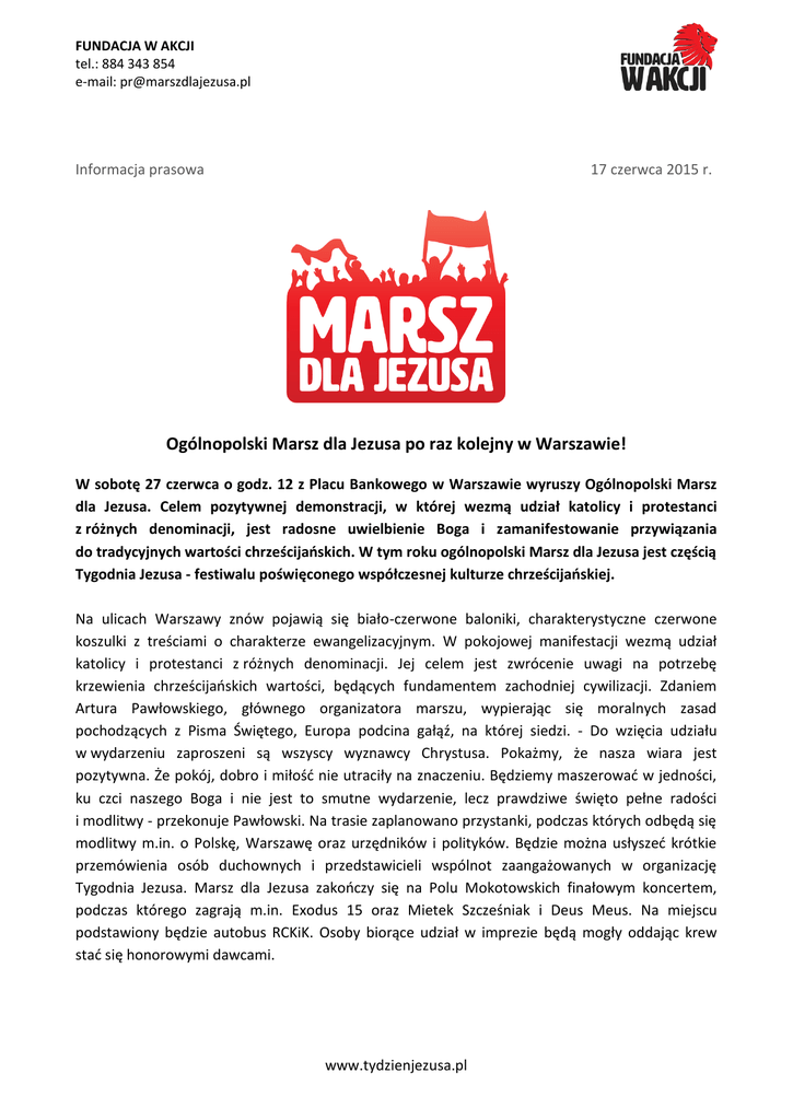 FUNDACJA W AKCJI tel.: 884 343 854 e-mail: [email protected] Informacja prasowa 17 czerwca 2015 r. Ogólnopolski Marsz dla Jezusa po raz kolejny w Warszawie! W sobotę 27 czerwca o godz. 12 z Placu Bankowego w Warszawie wyruszy Ogólnopolski Marsz dla Jezusa. Celem pozytywnej demonstracji, w której wezmą udział katolicy i protestanci z różnych denominacji, jest radosne uwielbienie Boga i zamanifestowanie przywiązania do tradycyjnych wartości chrześcijańskich. W tym roku ogólnopolski Marsz dla Jezusa jest częścią Tygodnia Jezusa - festiwalu poświęconego współczesnej kulturze chrześcijańskiej. Na ulicach Warszawy znów pojawią się biało-czerwone baloniki, charakterystyczne czerwone koszulki z treściami o charakterze ewangelizacyjnym. W pokojowej manifestacji wezmą udział katolicy i protestanci z różnych denominacji. Jej celem jest zwrócenie uwagi na potrzebę krzewienia chrześcijańskich wartości, będących fundamentem zachodniej cywilizacji. Zdaniem Artura Pawłowskiego, głównego organizatora marszu, wypierając się moralnych zasad pochodzących z Pisma Świętego, Europa podcina gałąź, na której siedzi. - Do wzięcia udziału w wydarzeniu zaproszeni są wszyscy wyznawcy Chrystusa. Pokażmy, że nasza wiara jest pozytywna. Że pokój, dobro i miłość nie utraciły na znaczeniu. Będziemy maszerować w jedności, ku czci naszego Boga i nie jest to smutne wydarzenie, lecz prawdziwe święto pełne radości i modlitwy - przekonuje Pawłowski. Na trasie zaplanowano przystanki, podczas których odbędą się modlitwy m.in. o Polskę, Warszawę oraz urzędników i polityków. Będzie można usłyszeć krótkie przemówienia osób duchownych i przedstawicieli wspólnot zaangażowanych w organizację Tygodnia Jezusa. Marsz dla Jezusa zakończy się na Polu Mokotowskich finałowym koncertem, podczas którego zagrają m.in. Exodus 15 oraz Mietek Szcześniak i Deus Meus. Na miejscu podstawiony będzie autobus RCKiK. Osoby biorące udział w imprezie będą mogły oddając krew stać się honorowymi dawcami. www.tydzienjezusa.pl FUNDACJA W AKCJI tel.: 884 343 854 e-mail: [email protected] Tydzień Jezusa Mieszkańców stolicy w dniach 21-28 czerwca czeka prawdziwa eksplozja współczesnej i alternatywnej kultury chrześcijańskiej. Jej epicentrum znajdzie się w przygotowanym specjalnie na tę okazję miasteczku na Polach Mokotowskich. Festiwal Muzyki Chrześcijańskiej „Glory”, Slot Warszawa, Festiwal filmów chrześcijańskich „Drabina Jakuba”, liczne warsztaty, prelekcje oraz koncerty - te i inne wydarzenia odbędą się pod szyldem Tygodnia Jezusa. W jego organizację zaangażowało się większość protestanckich kościołów w Warszawie. Z ramienia Kościoła Katolickiego udział zadeklarowali ks. Antoni Wita FDP z Zakonu Orionistów i Jacek Weigl - lider wspólnoty Chefsiba oraz dyrektor chrześcijańskiej szkoły Samuel. Impreza została objęta honorowym patronatem posła Johna Abrahama Godsona. Adwokat ulicy Inicjatorem i głównym organizatorem Marszy dla Jezusa i Kościołów Ulicznych w Polsce i na Świecie jest Artur Pawłowski - polski emigrant mieszkający w Calgary, gdzie wraz z żoną prowadzi chrześcijańską służbę dla osób bezdomnych i potrzebujących o nazwie Street Church. Dzięki jego działalności co roku wydawanych jest 200 000 posiłków dla najbiedniejszych, a przesłanie Ewangelii dociera do ludzi, którzy sami z siebie nigdy nie wybraliby się do kościoła. Owocem wspólnego zaangażowaniu Artura i jego współpracowników są liczne nawrócenia m.in. bezdomnych i dealerów narkotyków. Część z nich do dnia dzisiejszego pracuje w Kościele Ulicznym jako wolontariusze. Na walkę z charytatywną misją kanadyjskiego Kościoła Ulicznego miasto wydało już ponad 2 000 000 dolarów. Sam Artur Pawłowski otrzymał ponad 150 mandatów, 10 razy trafił do aresztu, ale nigdy nie został skazany prawomocnym wyrokiem sądowym. Jego historię w 2013 r. przedstawił Tomasz Wiszniewski w filmie Adwokat Ulicy. Nick Vujicic zaprasza na Marsz dla Jezusa https://youtu.be/VATY5Wx07BY Na poddaszu: Artur Pawłowski - świadectwo nawrócenia https://youtu.be/kpfj9QjjBck Na poddaszu: Artur Pawłowski - działalność w Kanadzie https://youtu.be/yVX4Wn_FDk4 Kontakt dla mediów: Marcel Płoszczyński e-mail: [email protected] tel.: 884 343 854 www.tydzienjezusa.pl