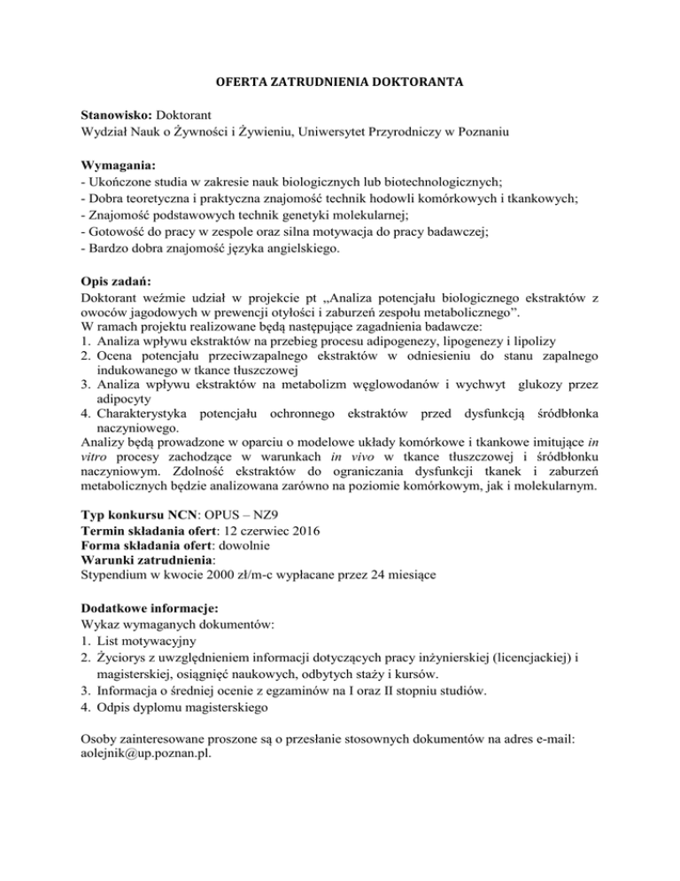 OFERTA ZATRUDNIENIA DOKTORANTA Stanowisko: Doktorant Wydział Nauk o Żywności i Żywieniu, Uniwersytet Przyrodniczy w Poznaniu Wymagania: - Ukończone studia w zakresie nauk biologicznych lub biotechnologicznych; - Dobra teoretyczna i praktyczna znajomość technik hodowli komórkowych i tkankowych; - Znajomość podstawowych technik genetyki molekularnej; - Gotowość do pracy w zespole oraz silna motywacja do pracy badawczej; - Bardzo dobra znajomość języka angielskiego. Opis zadań: Doktorant weźmie udział w projekcie pt „Analiza potencjału biologicznego ekstraktów z owoców jagodowych w prewencji otyłości i zaburzeń zespołu metabolicznego”. W ramach projektu realizowane będą następujące zagadnienia badawcze: 1. Analiza wpływu ekstraktów na przebieg procesu adipogenezy, lipogenezy i lipolizy 2. Ocena potencjału przeciwzapalnego ekstraktów w odniesieniu do stanu zapalnego indukowanego w tkance tłuszczowej 3. Analiza wpływu ekstraktów na metabolizm węglowodanów i wychwyt glukozy przez adipocyty 4. Charakterystyka potencjału ochronnego ekstraktów przed dysfunkcją śródbłonka naczyniowego. Analizy będą prowadzone w oparciu o modelowe układy komórkowe i tkankowe imitujące in vitro procesy zachodzące w warunkach in vivo w tkance tłuszczowej i śródbłonku naczyniowym. Zdolność ekstraktów do ograniczania dysfunkcji tkanek i zaburzeń metabolicznych będzie analizowana zarówno na poziomie komórkowym, jak i molekularnym. Typ konkursu NCN: OPUS – NZ9 Termin składania ofert: 12 czerwiec 2016 Forma składania ofert: dowolnie Warunki zatrudnienia: Stypendium w kwocie 2000 zł/m-c wypłacane przez 24 miesiące Dodatkowe informacje: Wykaz wymaganych dokumentów: 1. List motywacyjny 2. Życiorys z uwzględnieniem informacji dotyczących pracy inżynierskiej (licencjackiej) i magisterskiej, osiągnięć naukowych, odbytych staży i kursów. 3. Informacja o średniej ocenie z egzaminów na I oraz II stopniu studiów. 4. Odpis dyplomu magisterskiego Osoby zainteresowane proszone są o przesłanie stosownych dokumentów na adres e-mail: [email protected]. Na podstawie oceny nadesłanych ofert wybrani kandydaci zostaną zaproszeni przez Komisję konkursową na rozmowę kwalifikacyjną. Kandydaci będą informowani indywidualnie o wynikach pierwszego etapu rekrutacji oraz o terminie rozmów kwalifikacyjnych. Dane kontaktowe: Dr hab. Anna Olejnik Katedra Biotechnologii i Mikrobiologii Żywności Uniwersytet Przyrodniczy w Poznaniu ul. Wojska Polskiego 48, 60-627 Poznań e-mail: [email protected]