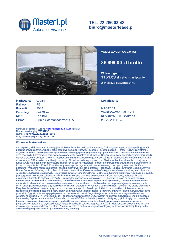 TEL. 22 266 03 43 [email protected] VOLKSWAGEN CC 2.0 TSI 86 999,00 zł brutto W leasingu już: 1131.69 zł netto miesięcznie 36 miesięcy, opłata wstępna 10% Nadwozie: Paliwo: Rocznik: Przebieg: Moc: Firma: sedan PB 2013 64438 km 211 KM Prime Car Management S.A. Lokalizacja: MASTER1 WARSZAWA/KLAUDYN KLAUDYN, ESTRADY 14 tel. 22 266 03 43 Sprawdź bezpłatnie auto na historiapojazdu.gov.pl podając: Numer rejestracyjny: WD5123G Numer VIN: WVWZZZ3CZEE516005 Datę pierwszej rejestracji: 31.10.2013 Wyposażenie standardowe: 4/5 zagłówki, ABS - system zapobiegający blokowaniu się kół podczas hamowania, ASR - system zapobiegający poślizgowi kół podczas przyspieszania, Airbag 6 sztuk (czołowe poduszki kierowcy i pasażera, boczne poduszki - przód, kurtyny powietrzne), Asystent podjazdu, Automatyczne włączanie świateł awaryjnych w przypadku nagłego hamowania, Chromowane obramowania szyb bocznych, Chromowane obramowanie osłony wlotu powietrza do chłodnicy, Czujnik ciśnienia w oponach (sygnalizacja spadku ciśnienia), Czujnik deszczu, Dywaniki - wykładzina, Dźwignia zmiany biegów w skórze, EDS - elektroniczna blokada mechanizmu różnicowego, ESP - system stabilizacji toru jazdy, El. podnoszenie szyb, przód i tył, Elektromechaniczny hamulec postojowy z funkcją Auto-Hold, Elementy dekoracyjne Titansilber na desce rozdzielczej, konsoli środkowej oraz drzwiach, Felgi aluminiowe 17 Phoenix z ogumieniem 235/45, Fotel kierowcy - elektryczna regulacją odcinka lędźwiowego oraz pochylenia oparcia, Fotel pasażera - manualna regulacja oparcia i odcinka lędźwiowego, Fotele przednie - sportowe, Funkcja oświetlania Coming/Leaving Home, Gniazdo 12V w bagażniku, Gniazdo Aux-in, Immobilizer, Kierownica wielofunkcyjna 3-ramienna w skórze, Kierunkowskazy w obudowie lusterek zewnętrznych, Klimatyzacja automatyczna Climatronic - 2 strefowa, Kolumna kierownicy regulowana w dwóch płaszczyznach, Komputer pokładowy MFA Premium, Konsola dachowa ze schowkiem, Koło zapasowe, pełnowymiarowe aluminiowe, Lampki do czytania - przód/tył, Lampy tylne wykonane w technologii LED (diodowe), Listwa na tylnym zderzaku chromowana, Listwy boczne - chromowane, Lusterka boczne elektrycznie regulowane i ogrzewane, Lusterka boczne w kolorze nadwozia, Lusterka make-up w osłonach p/słonecznych, podświetlane, Lusterko wsteczne przyciemniające się automatycznie, MSR- układ przeciwblokujący przy hamowaniu silnikiem, Oparcie tylnej kanapy z podłokietnikiem i otworem na długie przedmioty, Pasy bezpieczeństwa z regulacją wysokości i napinaczami - przód, Przedni podłokietnik ze schowkiem, Schowek w desce rozdzielczej po stronie pasażera, podświetlany, zamykany z funkcją chłodzenia, Schowki w drzwiach - przód, Spryskiwacze lamp przednich, Sygnalizacja niezapiętych pasów bezpieczeństwa, przód, Sygnalizacja zmęczenia kierowcy - sygnał dźwiękowy i wizualny na ekranie MFA, System regulacji i dopasowania zawieszenia DCC, System rekuperacji odzyskujący energię podczas hamowania, Tapicerka materiałowa Silversprint, Uchwyty ISOFIX do instalacji fotelika dziecięcego, tył, Uchwyty do mocowania bagażu w przestrzeni bagażowej, Uchwyty na kubki z przodu, Wspomaganie układu kierowniczego, elektromechaniczne, progresywne - zależne od prędkości auta, Wyłącznik poduszki powietrznej pasażera, XDS - elektroniczna blokada mechanizmu różnicowego, Zamek centralny z pilotem, Zderzaki w kolorze nadwozia, Zegarek analogowy w desce rozdzielczej, Śruby do kół zabezpieczające przed kradzieżą, Światła do jazdy dziennej Opis wygenerowano 23.02.2017 o 04:40 Strona 1 z 2 Wyposażenie dealerskie: Alarm z funkcją dozoru wnętrza z czujnikiem przechyłu + komfortowe otwieranie/zamykanie drzwi, Boczne poduszki powietrzne - tył z napinaczami pasów bezpieczeństwa na zewnętrznych miejscach z tyłu, Gniazdo multimedialne MEDIA-IN, Lakier metalik, Lusterka boczne składane elektrycznie z funkcją oświetlenia przestrzeni wokół drzwi, Pakiet 5 miejsc, Pakiet Ambiente, Pakiet Business, Pakiet R-Line, Pakiet dach panoramiczny, Pakiet zimowy 1, System nagłośnienia VW Sound (10 głośników, wzmacniacz, moc 300W), Szyba przednia - ogrzewana, Szyby tylne dodatkowo przyciemniane, Tempomat, Światła przeciwmgielne z funkcją doświetlania skrętu Master1 to punkt sprzedaży samochodów Masterlease, pierwszego właściciela. Wszystkie auta zostały zakupione w polskim salonie, posiadają wycenę rzeczoznawcy, były regularnie serwisowane podczas użytkowania i posiadają udokumentowaną historię zdarzeń serwisowych. W Master1.pl znajdziecie Państwo szeroki wachlarz ubezpieczeń komunikacyjnych. Nasza oferta skierowana jest zarówno do klientów indywidualnych jak i firm. Wszelkich formalności można dokonać na miejscu. Opis wygenerowano 23.02.2017 o 04:40 Strona 2 z 2
