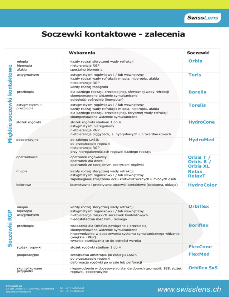 Soczewki kontaktowe - zalecenia Soczewki RGP Miękkie soczewki kontaktowe Wskazania Soczewki Orbis miopia hiperopia afakia każdy rodzaj sferycznej wady refrakcji nietolerancja RGP specjalna biometria astygmatyzm astygmatyzm rogówkowy i / lub wewnętrzny każdy rodzaj wady refrakcji: miopia, hiperopia, afakia nietolerancja RGP każdy rodzaj topografii Toris prezbiopia dla każdego rodzaju prezbiopijnej, sferycznej wady refrakcji skompensowane widzenie symultaniczne odległości pośrednie (komputer) Borelis astygmatyzm + prezbiopia astygmatyzm rogówkowy i / lub wewnętrzny każdy rodzaj wady refrakcji: miopia, hiperopia, afakia dla każdego rodzaju prezbiopijnej, torycznej wady refrakcji skompensowane widzenie symultaniczne Torelis stożek rogówki stożek rogówki stadium 1 do 4 astygmatyzm nieregularny nietolerancja RGP nietolerancja piggyback, s. hybrydowych lub twardówkowych HydroCone pooperacyjne po zabiegu LASIK po przeszczepie rogówki nietolerancja RGP przy nieregularnościach rogówki każdego rodzaju HydroMed opatrunkowe opatrunek rogówkowy opatrunek dla dzieci opatrunek ze specjalnym pokryciem rogówki miopia każdy rodzaj sferycznej wady refrakcji astygmatyzm rogówkowy i / lub wewnętrzny zapobieganie zmęczeniu oczu krótkowzrocznych u młodych osób Orbis T / Orbis B / Orbis XL Relax RelaxT kolorowe kosmetyczne i protetyczne soczewki kontaktowe (coloboma, okluzja) miopia hiperopia astygmatyzm każdy rodzaj sferycznej wady refrakcji astygmatyzm rogówkowy i / lub wewnętrzny nietolerancja miękkich soczewek kontaktowych niedostateczna ilość filmu łzowego prezbiopia wskazania dla Orbiflex powiązane z prezbiopią skompensowane widzenie symultaniczne niepowodzenie w dopasowaniu systemu symultanicznego widzenia (miękkie i RGP) wysokie oczekiwania co do ostrości wzroku stożek rogówki stożek rogówki stadium 1 do 4 pooperacyjne szczątkowa ametropia po zabiegu LASIK po przeszczepie rogówki deformacje rogówki po urazie lub perforacji skomplikowane przypadki niepowodzenie w dopasowaniu standardowych geometrii: S3S, stożek rogówki, pooperacyjne SwissLens SA Ch. des Creuses 9 / 1008 Prilly / Switzerland [email protected] Tel +41 21 620 06 62 Fax +41 21 620 06 65 HydroColor Orbiflex Boriflex FlexCone FlexMed Orbiflex SxS www.swisslens.ch